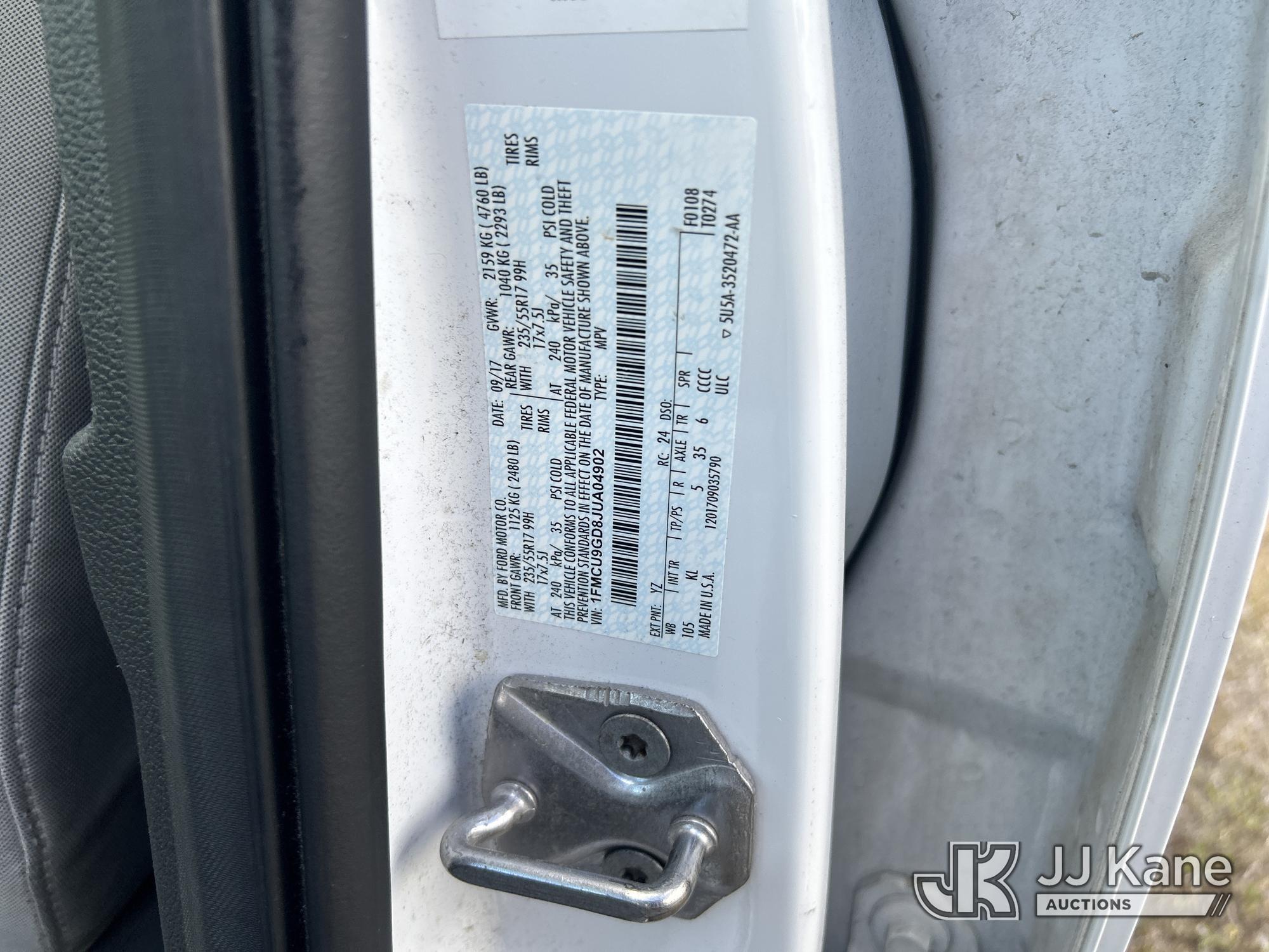 2018 Ford Escape 4x4 4-Door Sport Utility Vehicle, 4-cyl gas, 6-Speed Automatic, A/C, (112,408 miles) (Runs & Moves) (Check Engine Light On, Paint Damage) (Seller States: Bad Engine) (FL Residents Purchasing Titled Items - tax, title & registration fees will be collected at the maximum rate of $400.00 under 25,999 and $800.00 for Over 26,000 and $250.00 trailers - Proof of insurance is mandatory; Out of State Residents Purchasing Title Items - tax will be collected based upon your state rate.) This is a Titled Item*