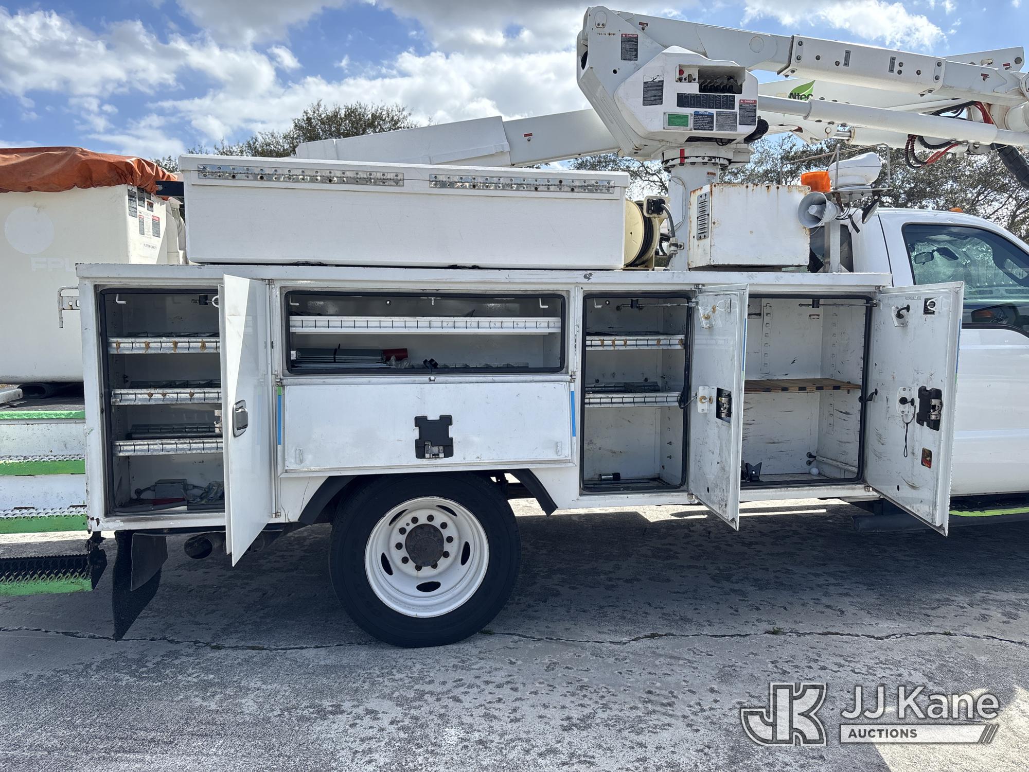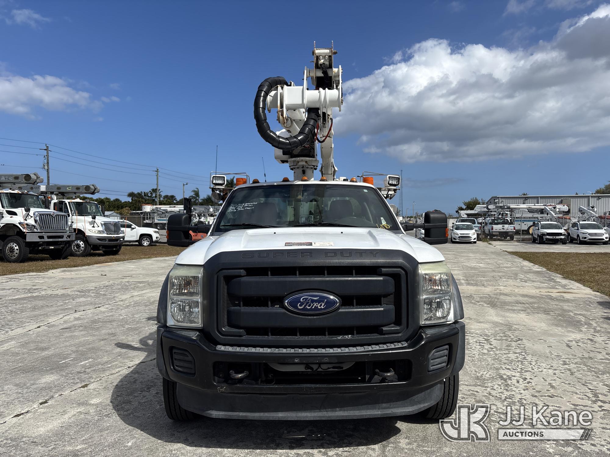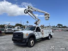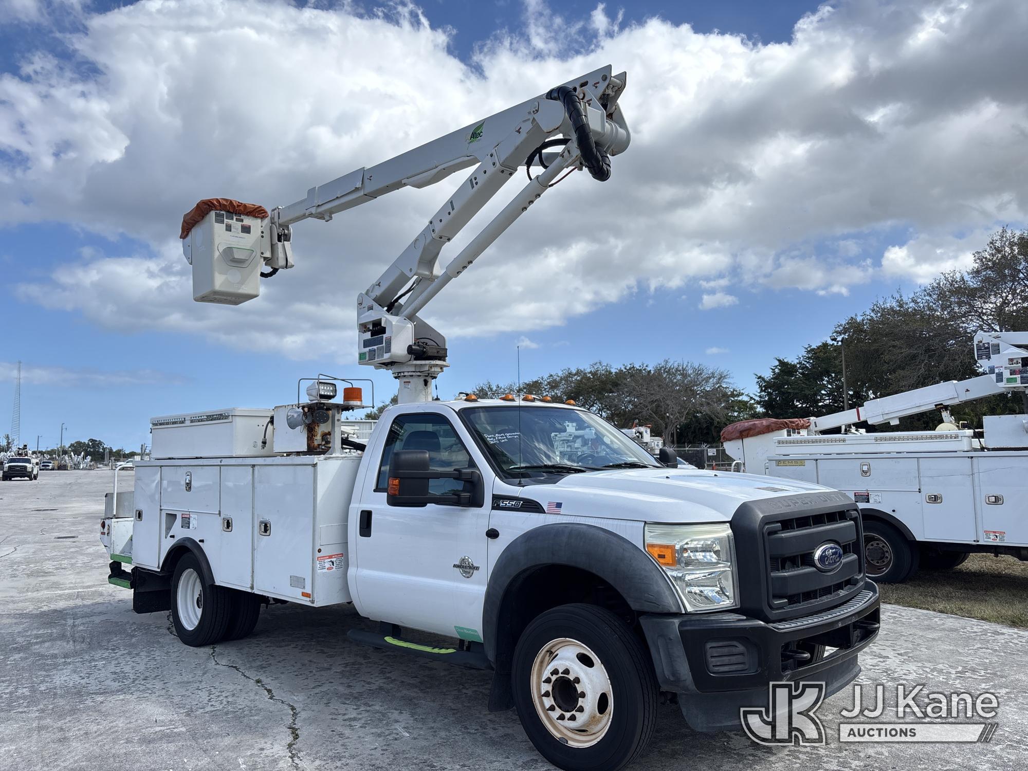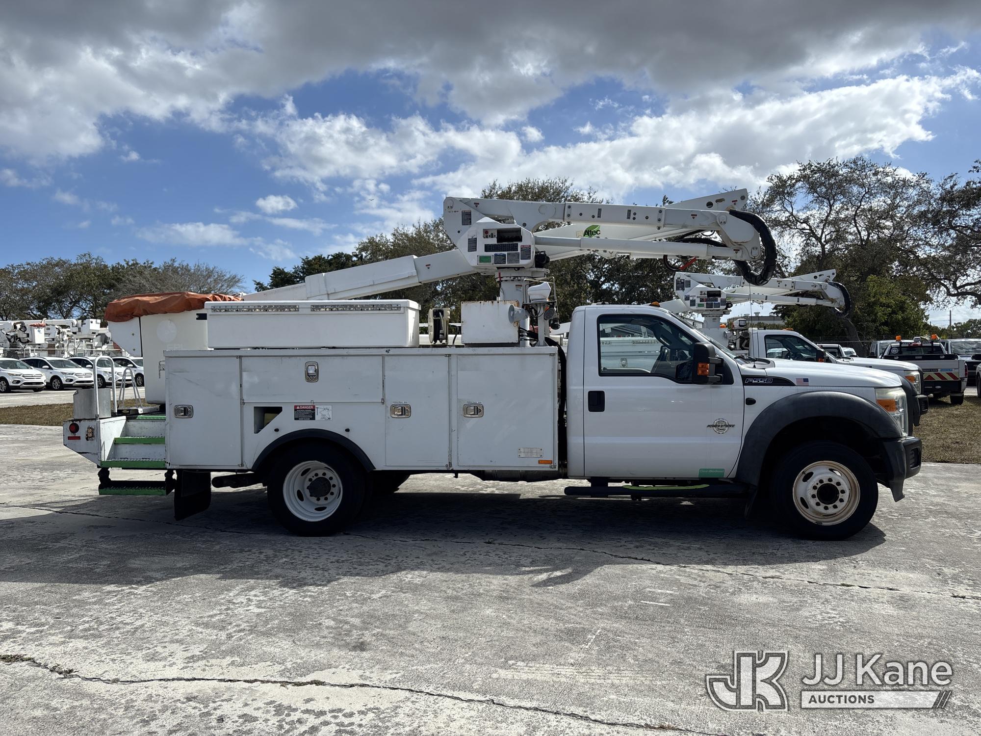 Altec AT40G, 45 ft, Articulating & Telescopic Bucket s/n 1014EY0806, with single-man bucket, mounted behind cab on 2015 Ford F-550 Service Truck, 6.7L diesel, Auto, A/C, with Jobsite Energy Management System is an integrated plug-in system that uses stored electrical energy to power the aerial device, tools and exportable power, and provides cab comfort. The energy storage system is recharged by plugging into shore power or by the truck’s internal combustion engine., (90,915 miles) JEMS Unit (Runs, Moves, & Operates With Jump) (Body & Paint Damage, Missing Altec Plaque) (FL Residents Purchasing Titled Items - tax, title & registration fees will be collected at the maximum rate of $400.00 under 25,999 and $800.00 for Over 26,000 and $250.00 trailers - Proof of insurance is mandatory; Out of State Residents Purchasing Title Items - tax will be collected based upon your state rate.) This is a Titled Item*