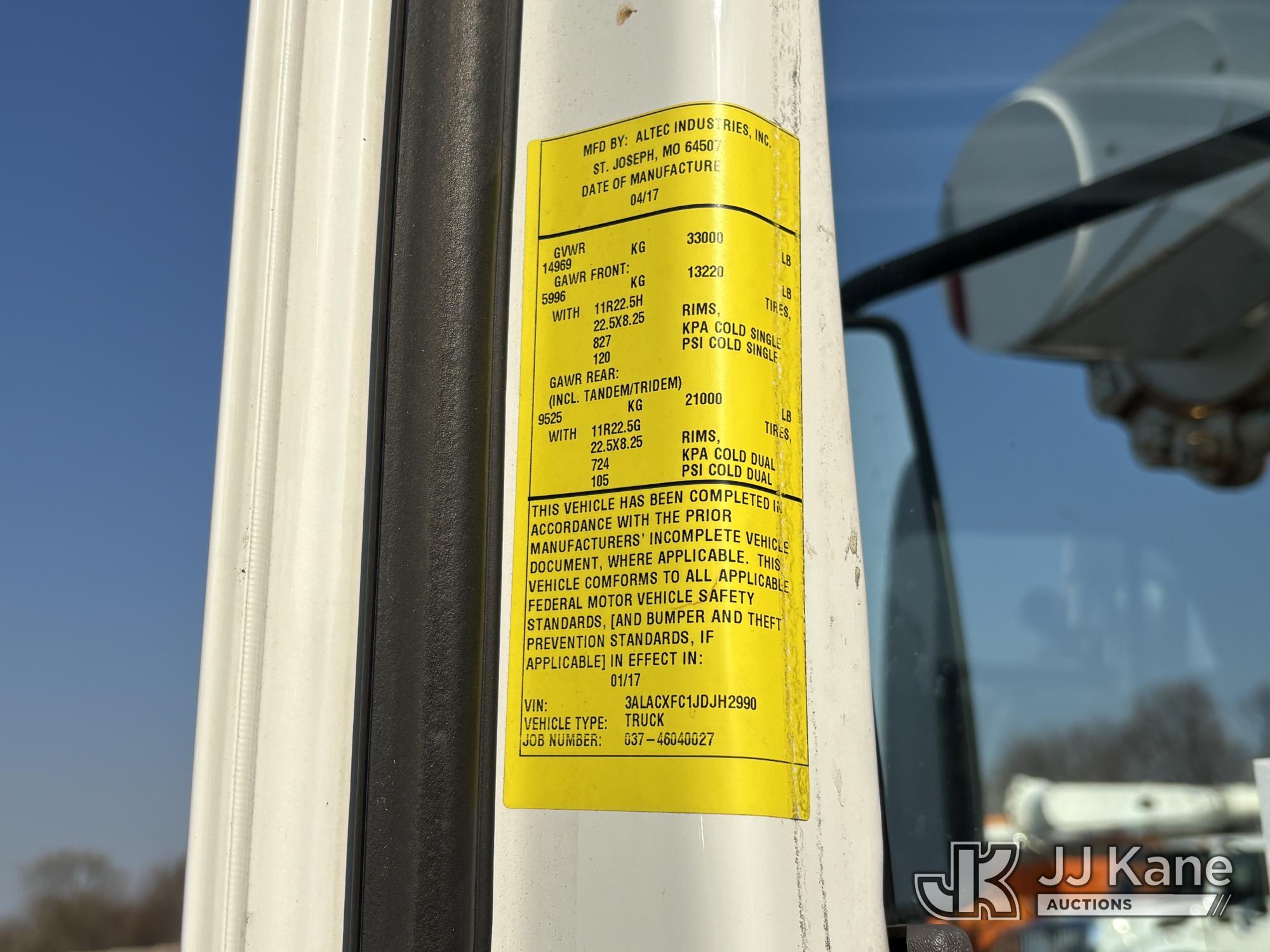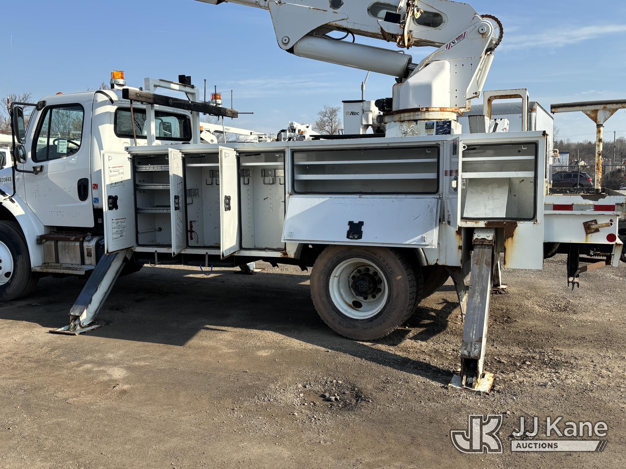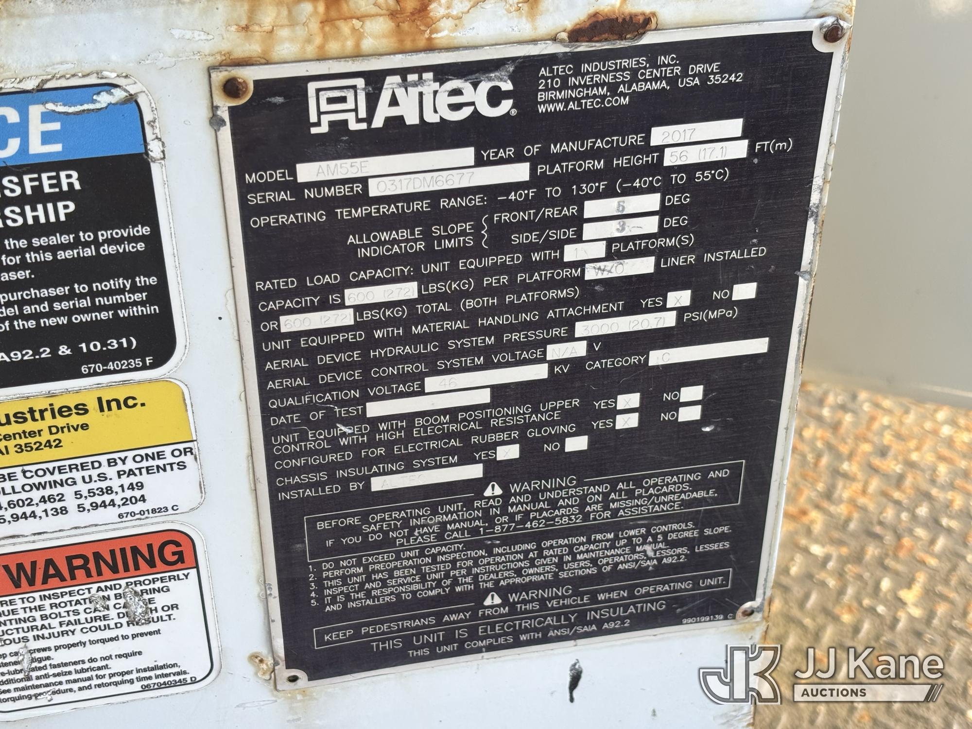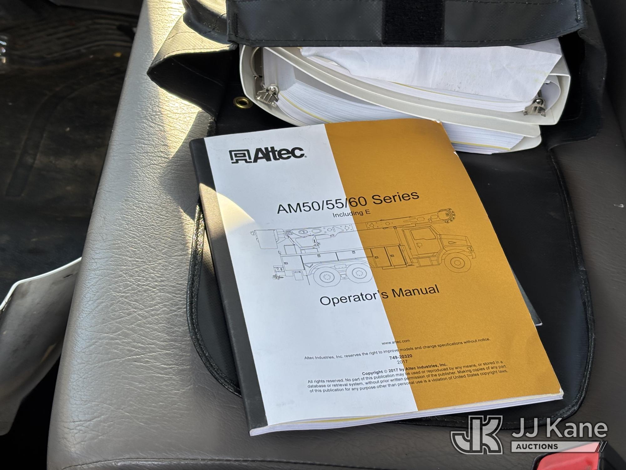 Altec AM55E, 60 ft, Over-Center Material Handling Bucket s/n 0317DM6677, with two-man bucket, rear mounted on 2018 Freightliner M2 106 Utility Truck, 6.7L diesel, Auto, A/C, (65,162 miles) (Runs Moves & Upper Operates, Jump To Start, Oil Leak Under Engine, Hydraulic Leak At Rear Outrigger Levers) This is a Titled Item*