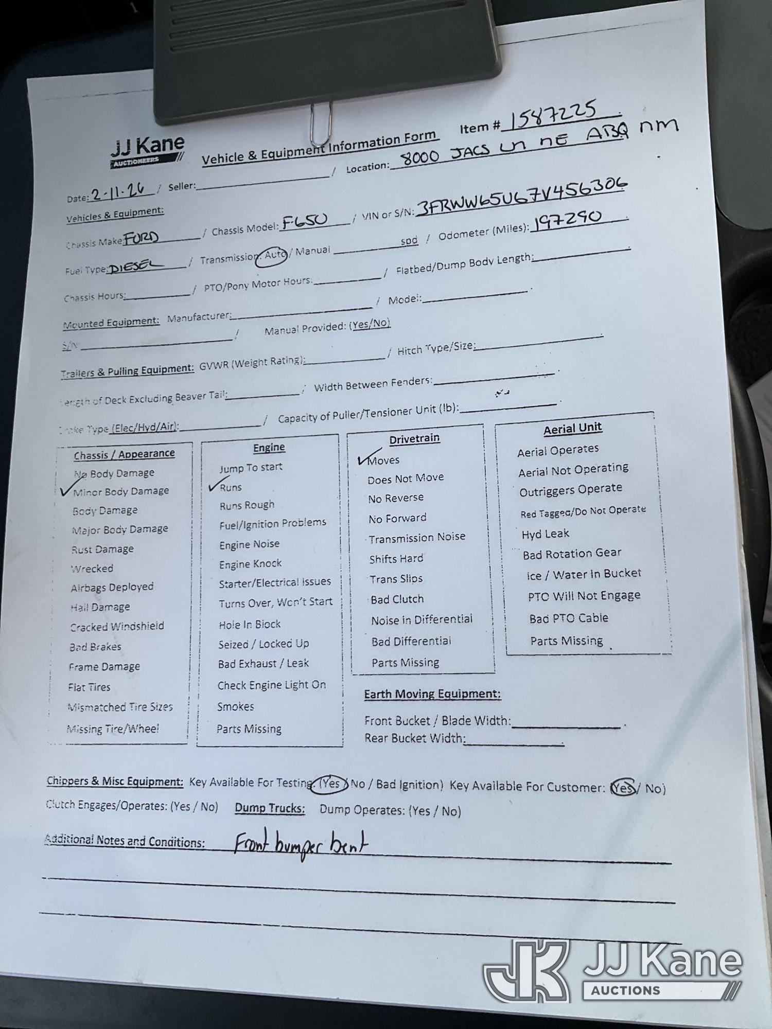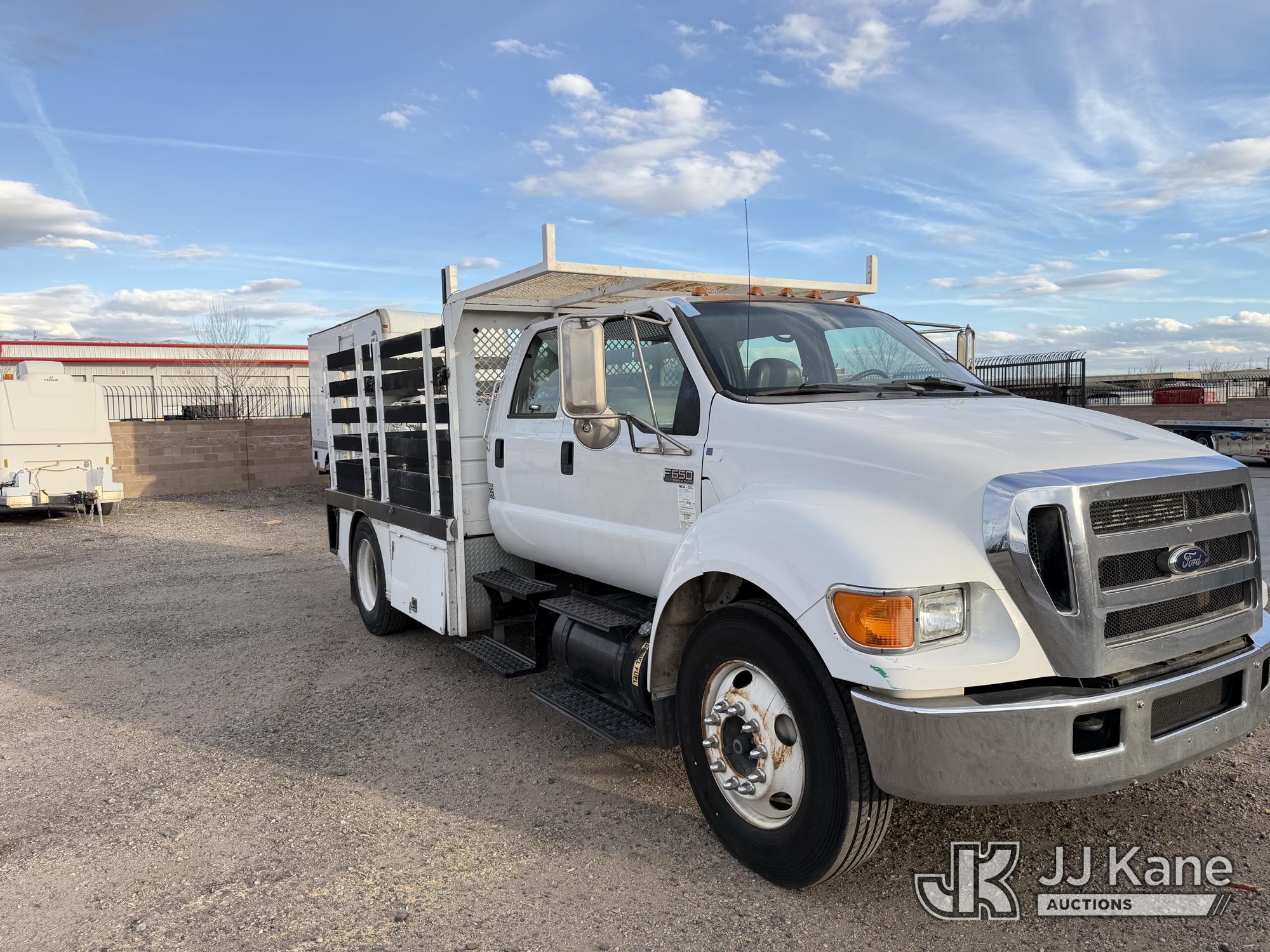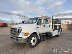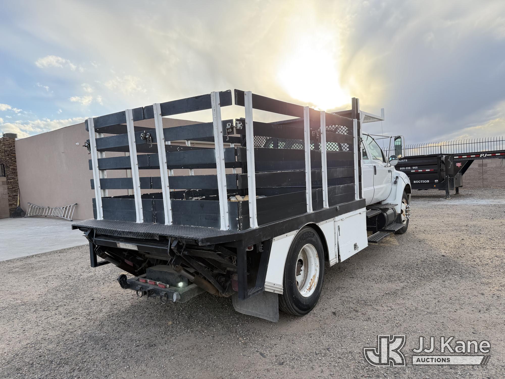 2007 Ford F-650 Crew-Cab Flatbed/Service Truck, 7.2L diesel, 4X2, Auto, A/C, with stake sides, lift gate, (197,290 miles) (Runs & Moves) (Front Bumper Bent) This is a Titled Item*