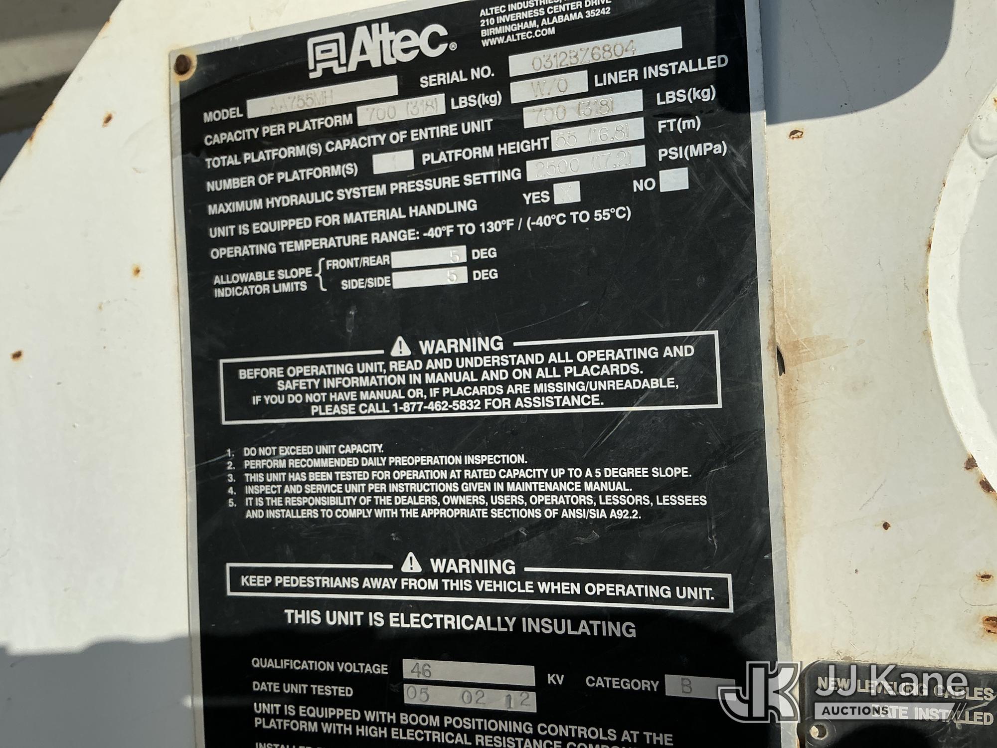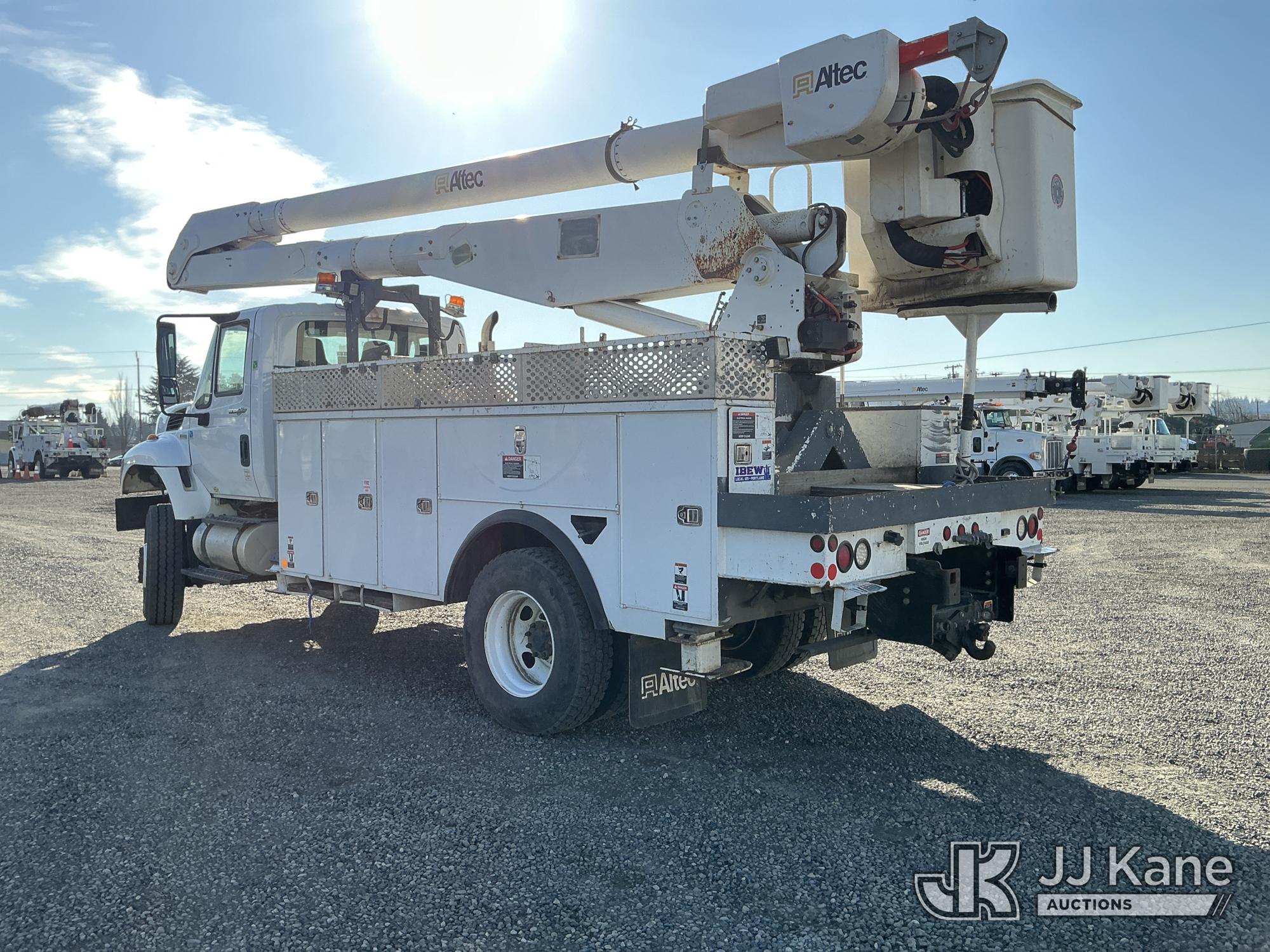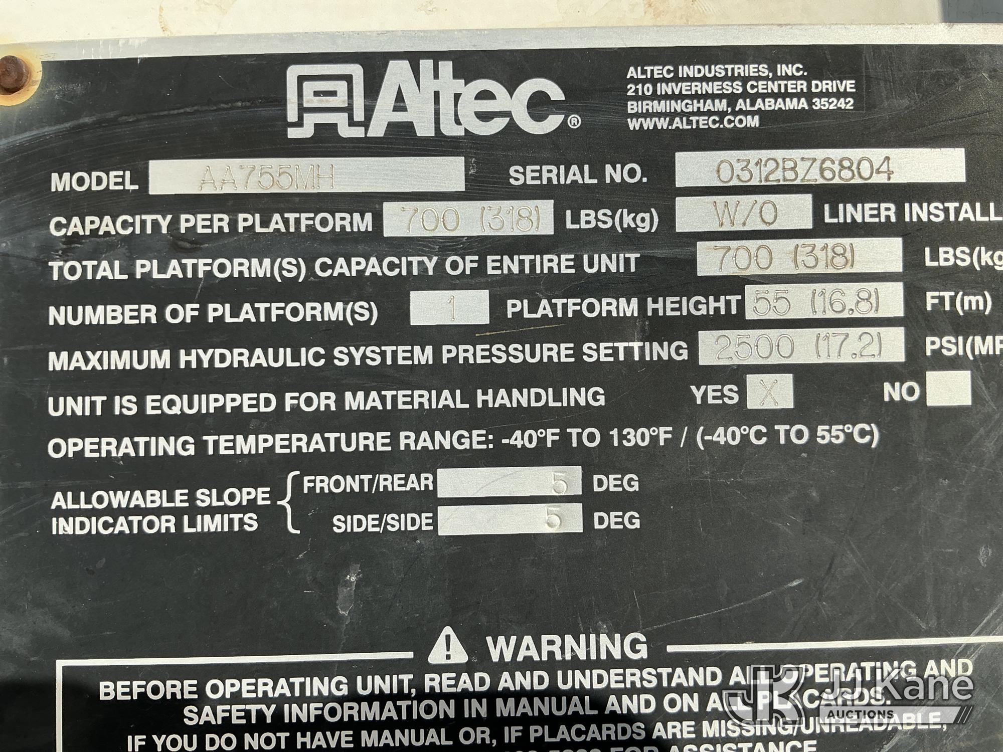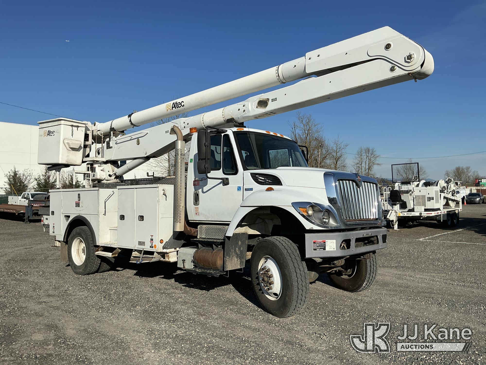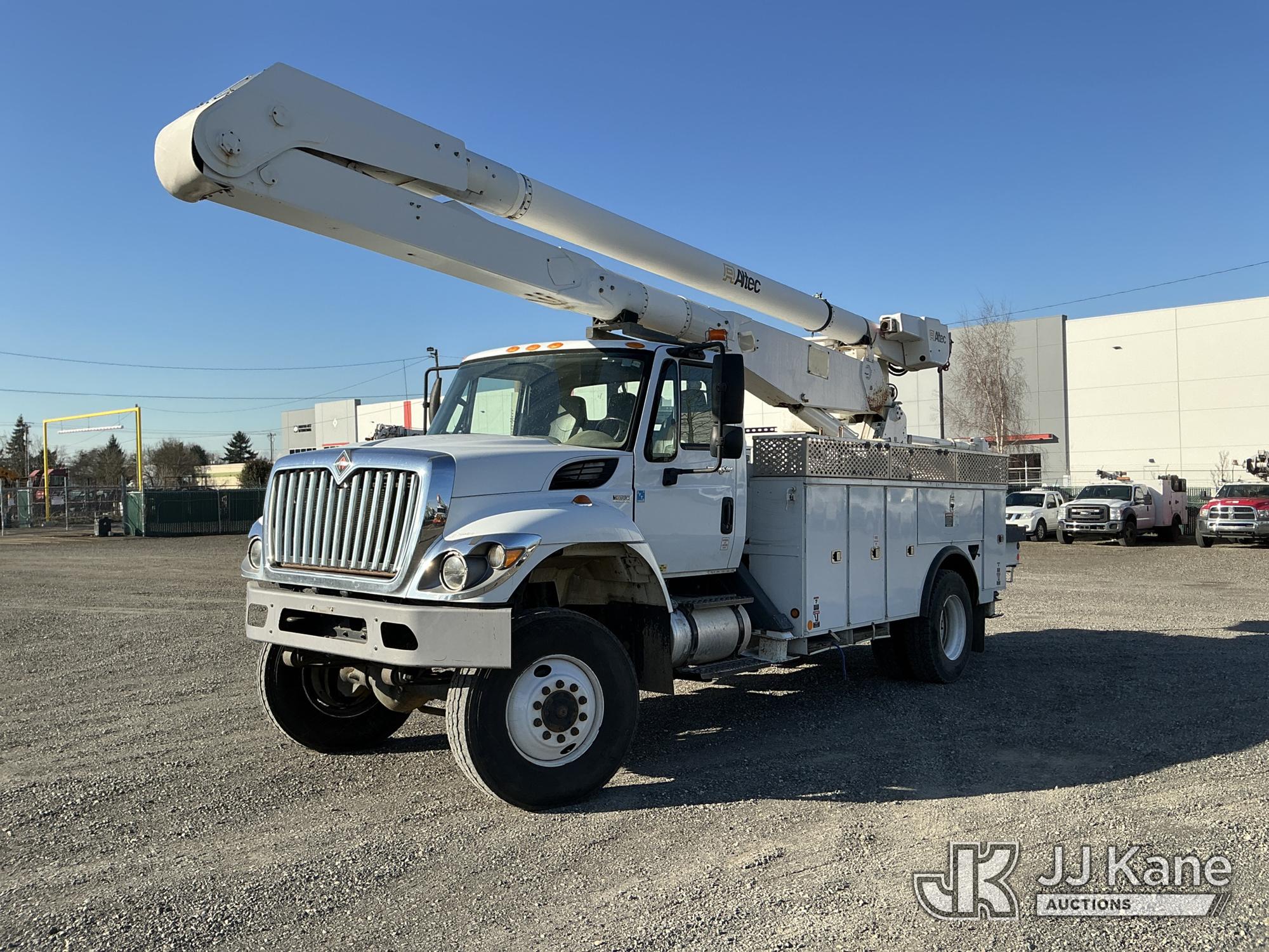 Altec AA755-MH, 60 ft, Material Handling Bucket Truck s/n 0312BZ6804, with Two-Man Bucket & 4 Hydraulic Outriggers, rear mounted on 2013 International 7300 Utility Truck, 7.6L L6 DIESEL 4X4, Auto, A/C, (78,012 miles) (Runs, Moves & Upper Operates) (Check Engine Light On) (Reads 9,468 hours) This is a Titled Item*