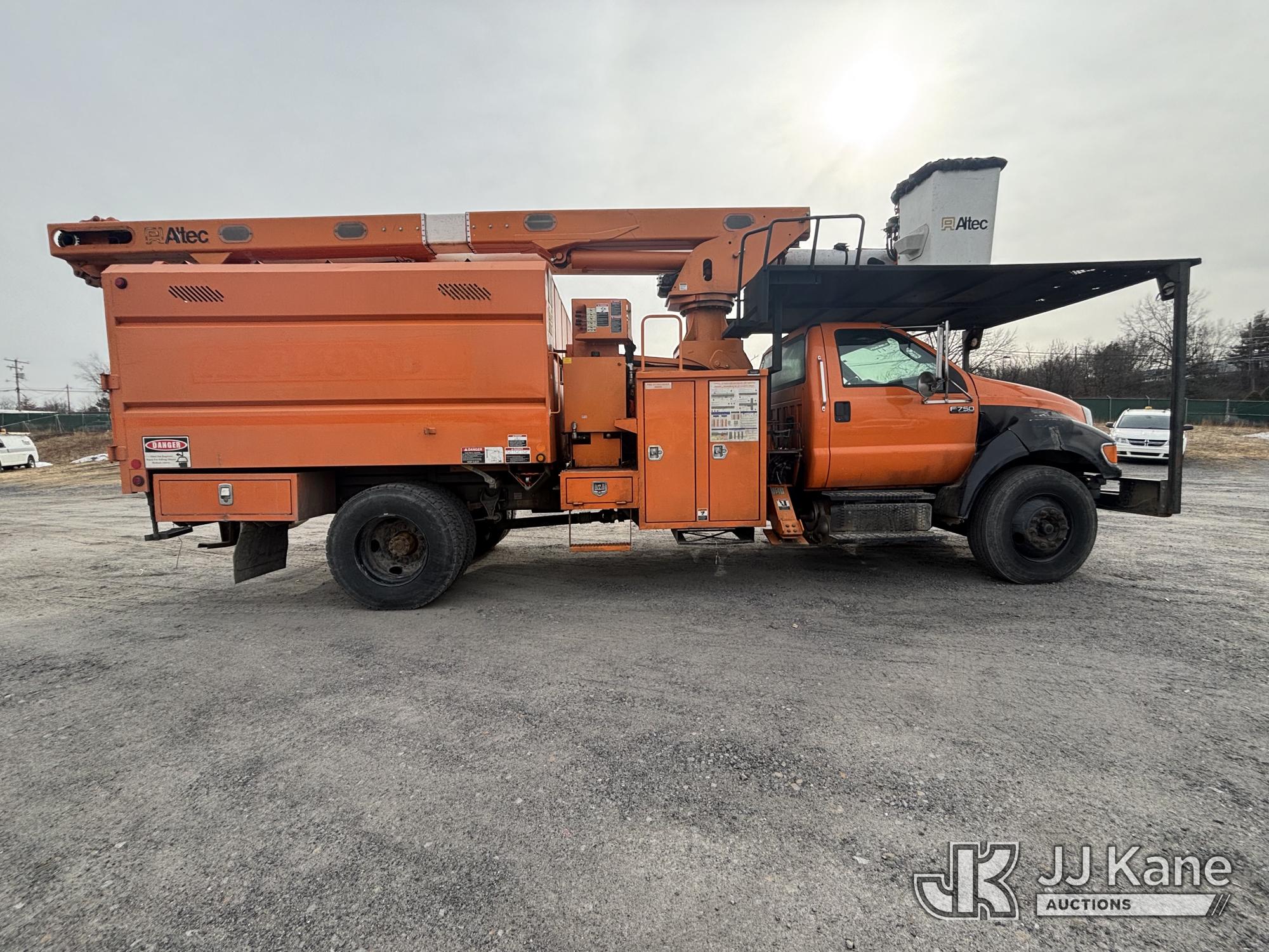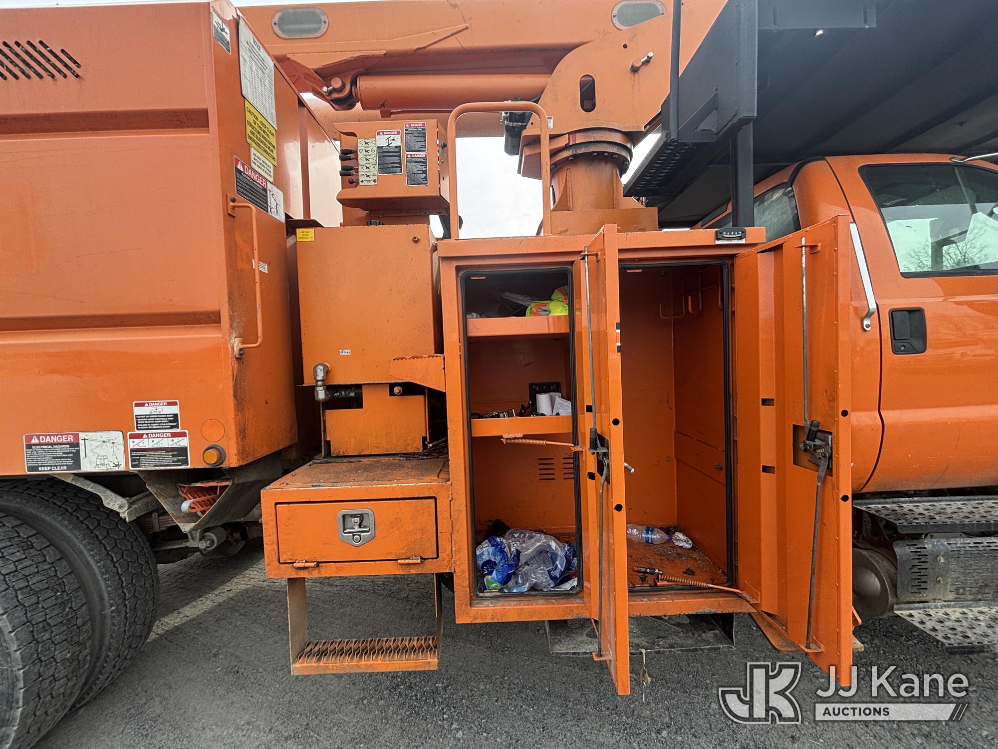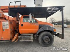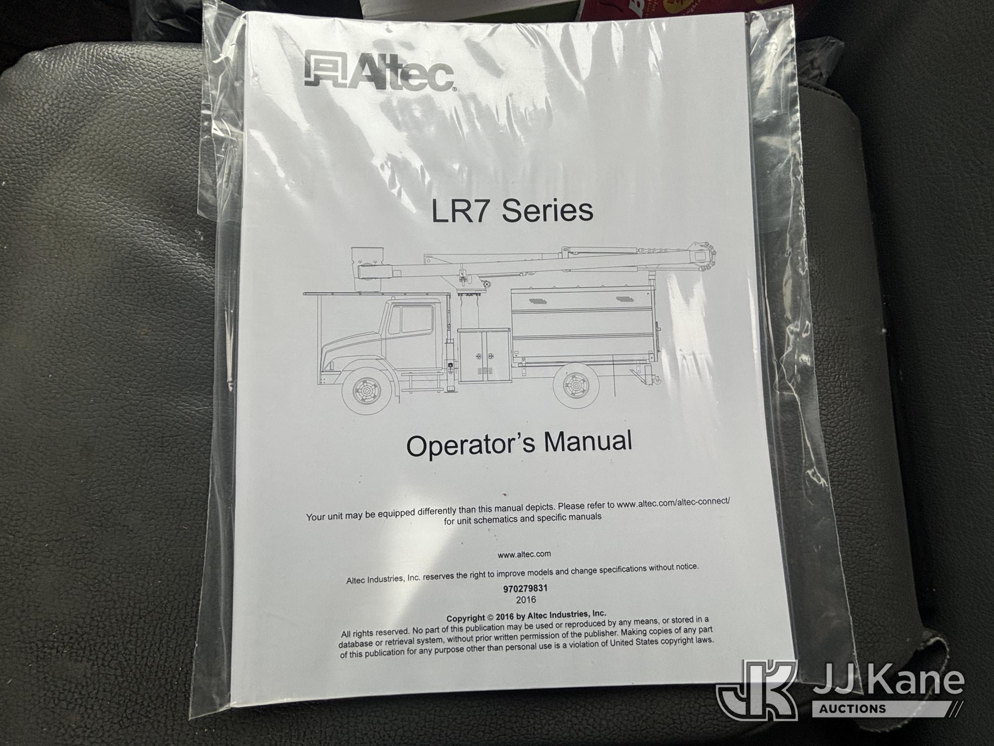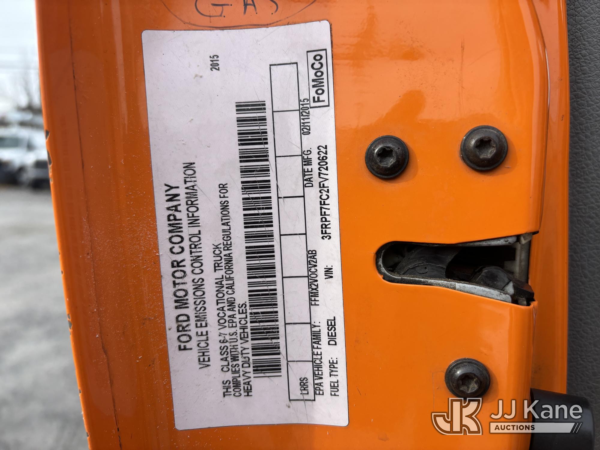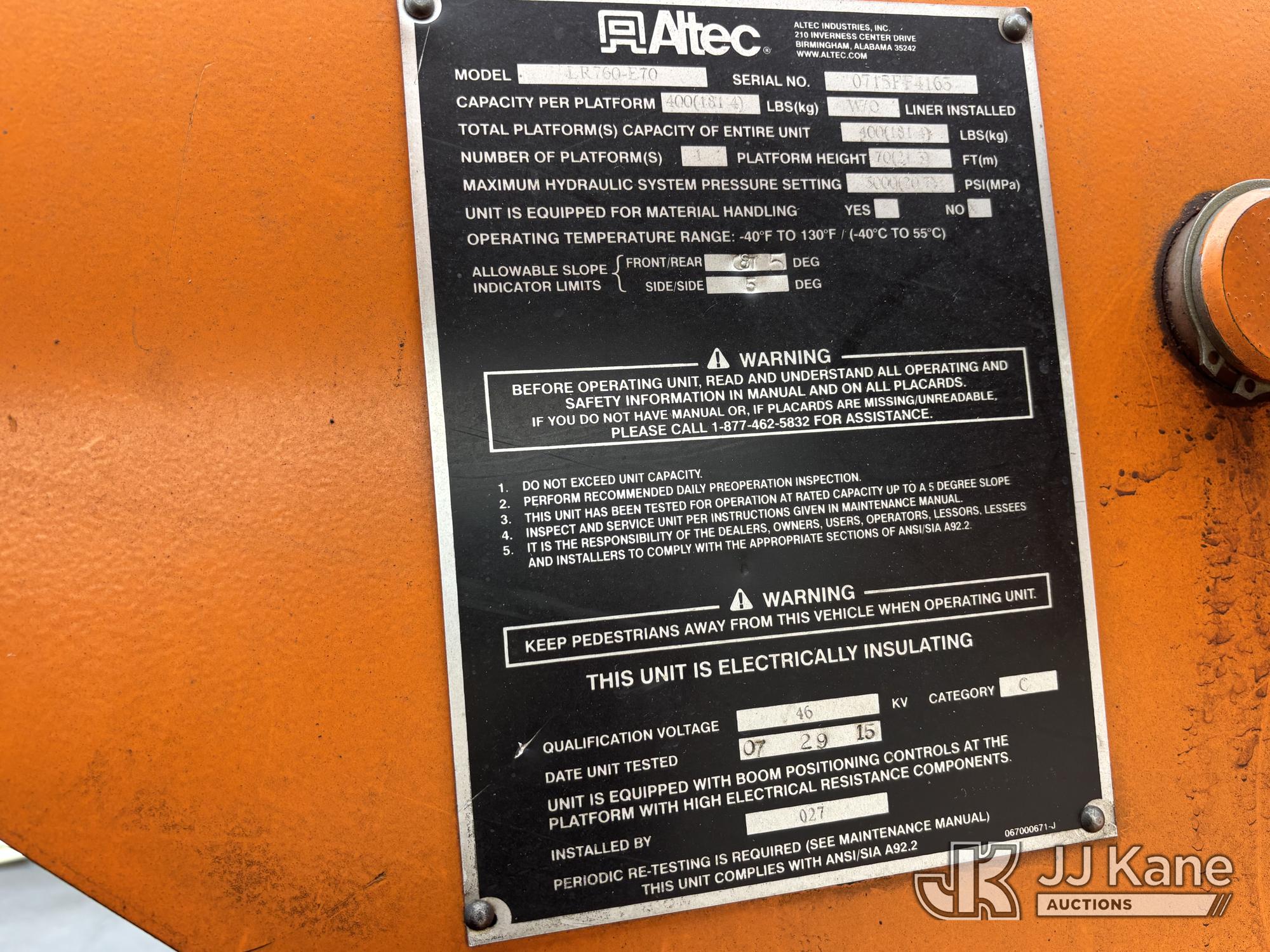 Altec LR760E70, 70 ft, Over-Center Elevator Bucket Truck s/n 0715FF4165, with Two Outriggers, Single-Man Bucket, mounted behind cab on 2015 Ford F-750 Regular Cab 2WD DRW Chipper Dump Truck, 6.7L L6 Diesel 6-spd, (76,833 miles) (**Dealer Only** Runs & Moves, Cracks On Hood, Leaking Oil/Oil Stains Across Unit, PTO Handle Removed, Body Dents & Dings, Rust Across Truck)(Seller States this item has been removed from service: Non-Conductive Hose Bundle in Boom Requires Replacement; Hydraulic System Issues; Dings & Cracks On Fiberglass Boom, Covers Removed Across Unit - Requires ANSI Inspection for repair/replacement requirements. The manufacturer has notified JJ Kane that this equipment is subject to an open recall. CSN 672 LRV/LR7 Leveling Yoke Inspection The equipment should not be operated until this is addressed. Buyer is responsible for reviewing the recall notice and contacting the manufacturer to schedule the recommended corrective actions. Associated costs may be covered by the manufacturer in some cases.) (Bidding Restricted to Licensed Vehicle Dealers Only), This is a Titled Item*