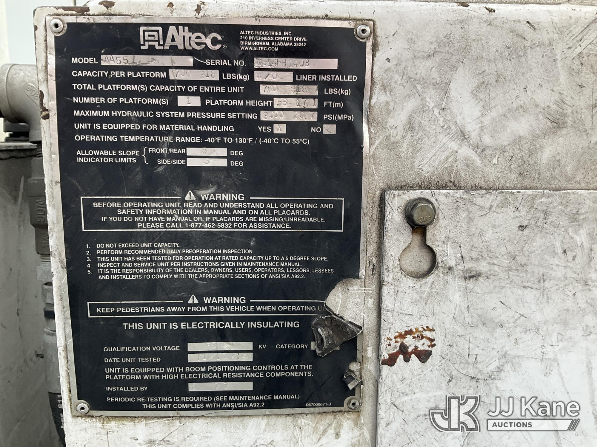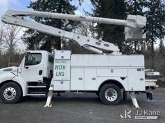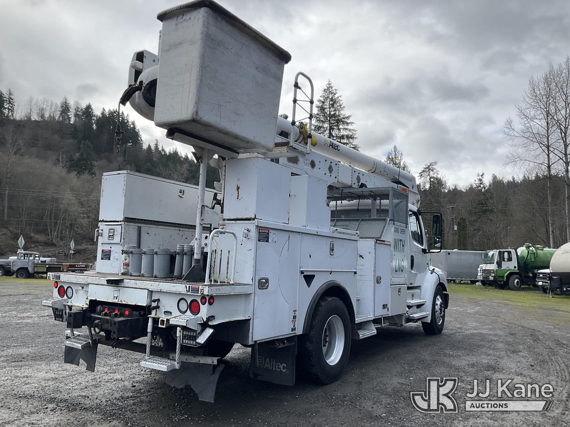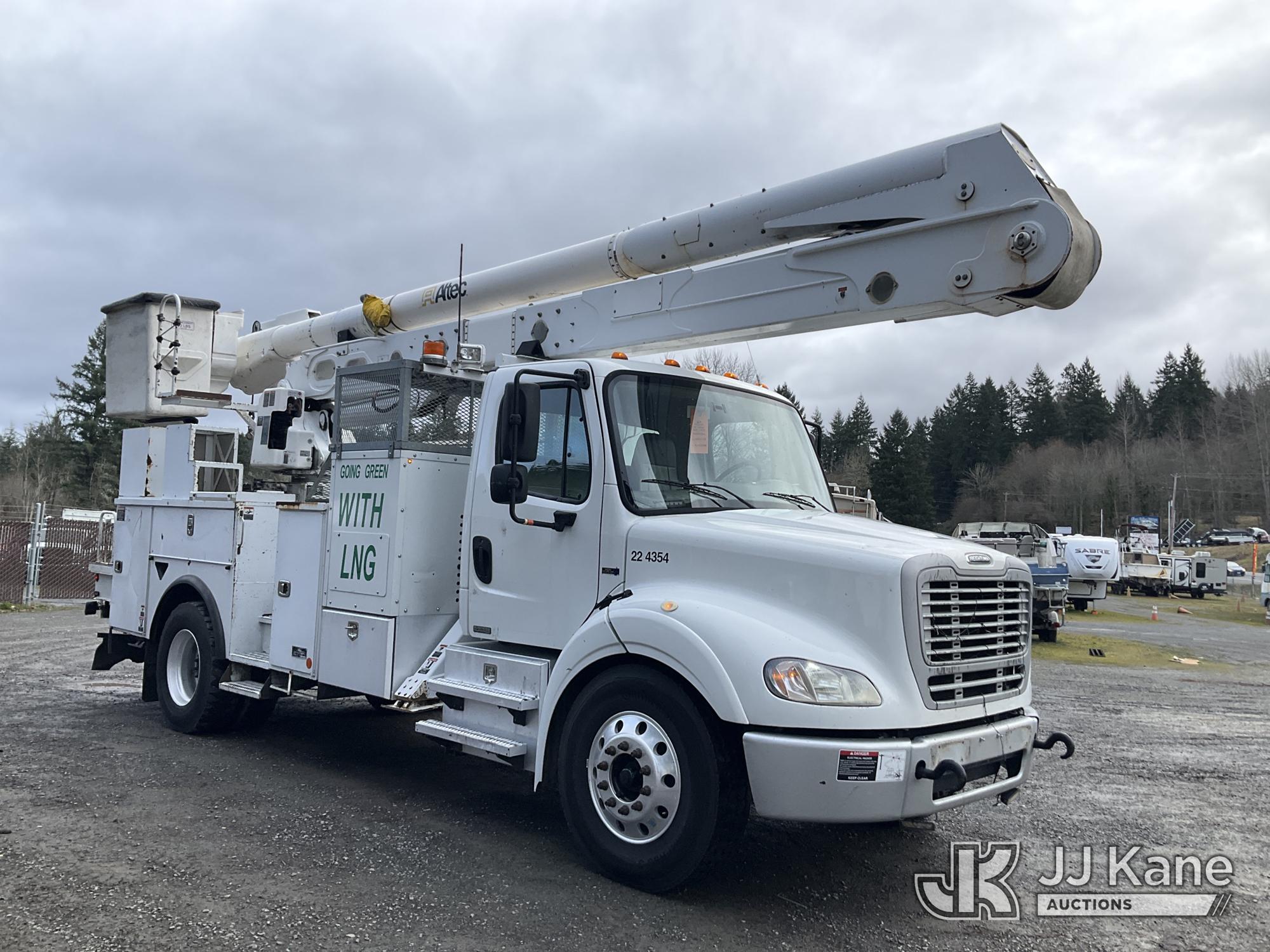 Altec AA55E, 61 ft, Material Handling Bucket Truck s/n 0914FH1403, with two-man bucket & 4 hyd outriggers, rear mounted on 2015 Freightliner M2 112 Utility Truck, 8.9L LNG 4X2, Auto, A/C, (101,115 miles) (Runs, Moves & Upper Operates) (Out of LNG Fuel Will Not Stay Running, Tractor ABS Light On) This is a Titled Item*