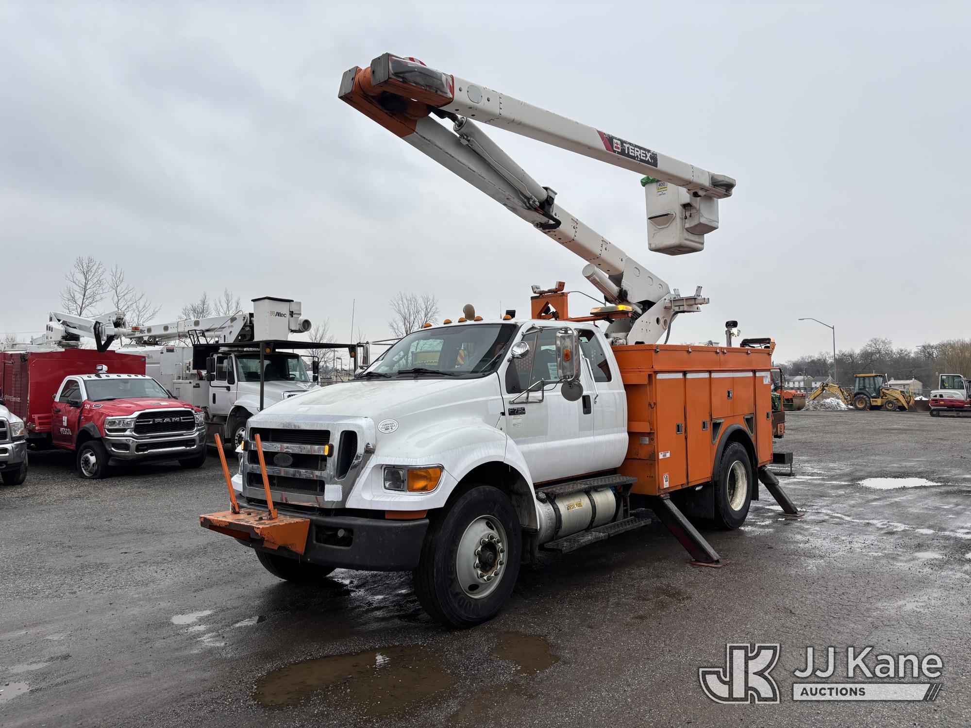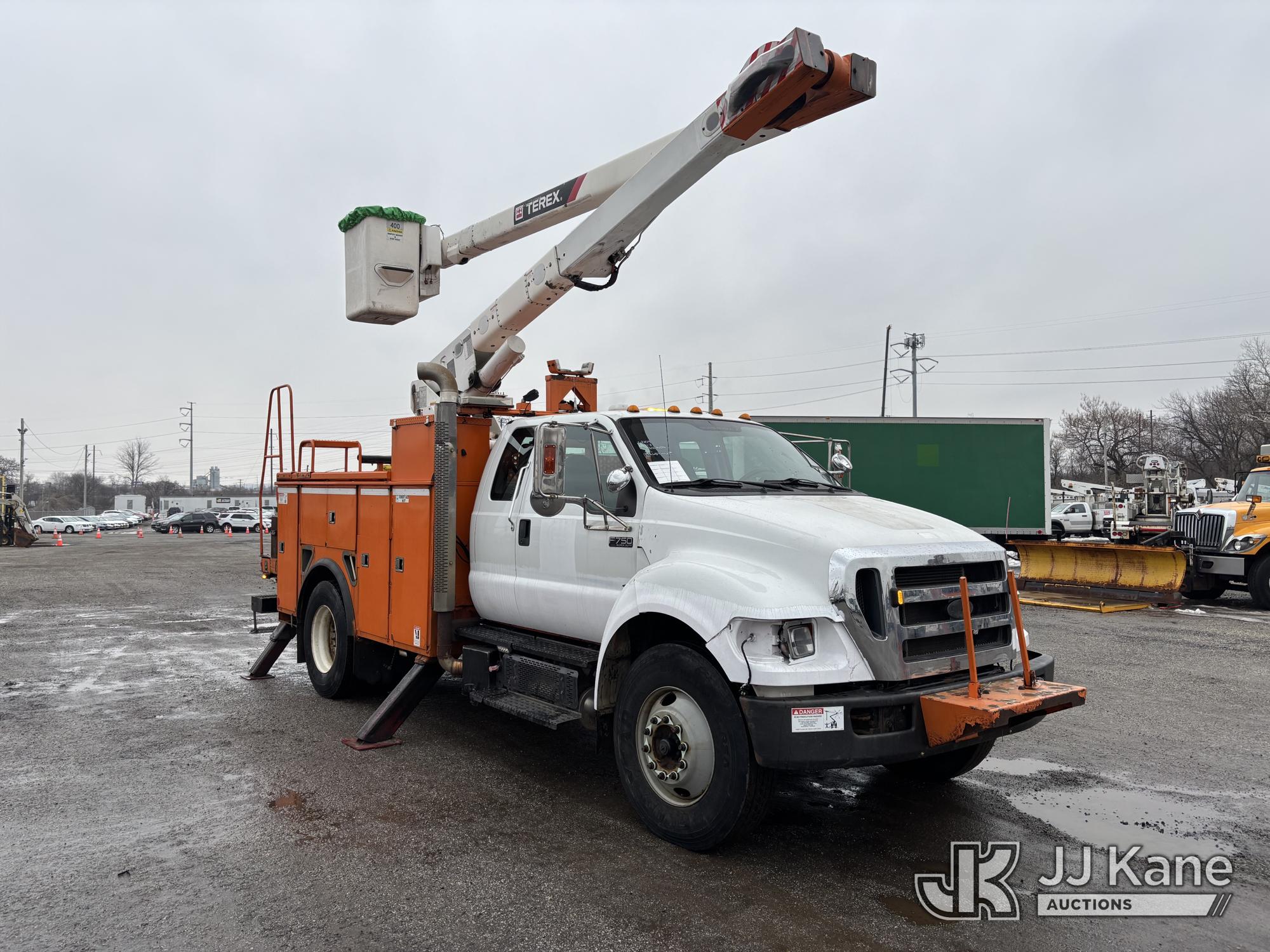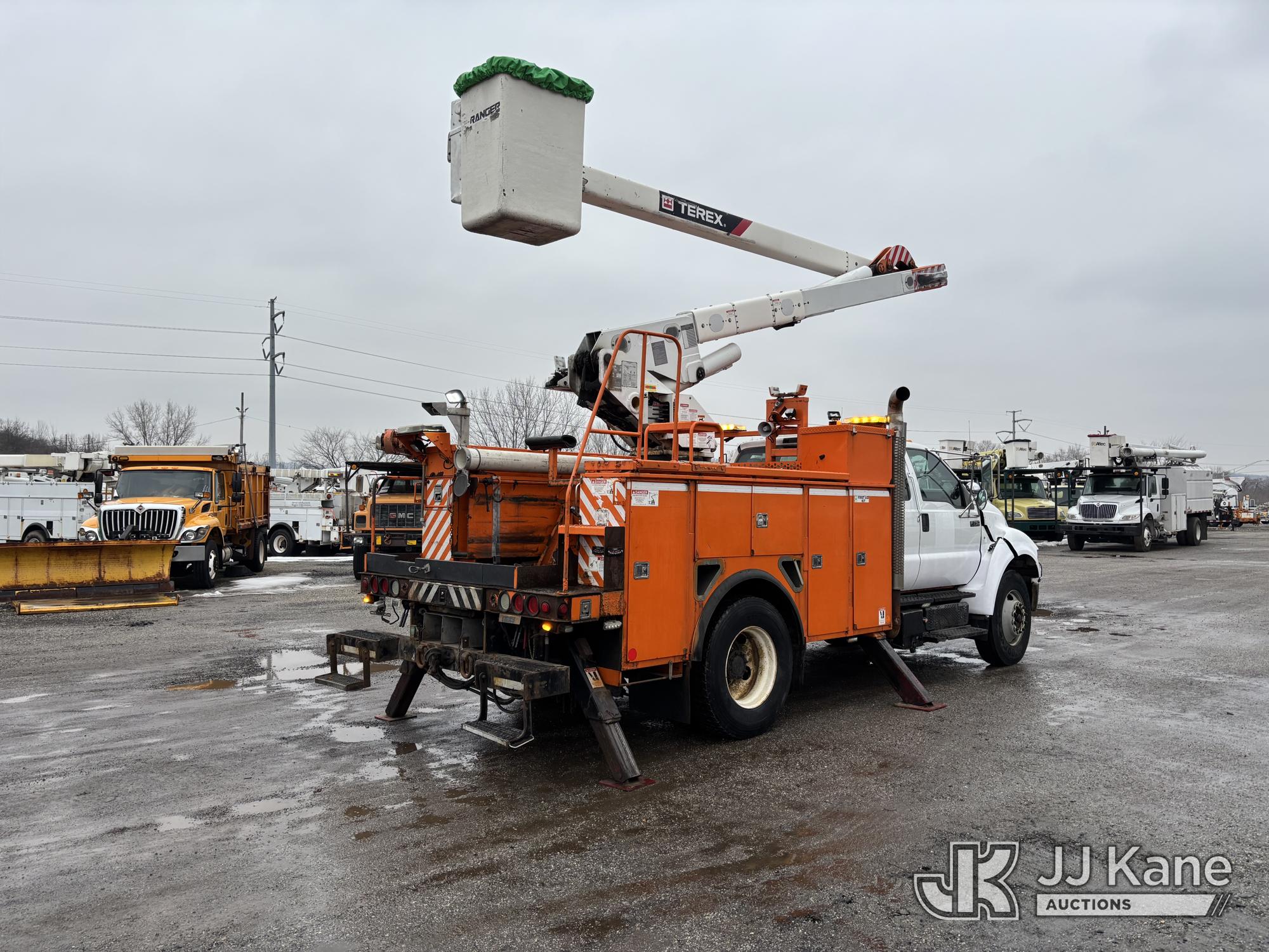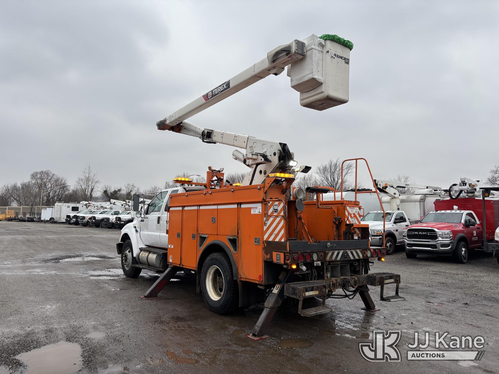 Terex/HiRanger SC42, 47 ft, Over-Center Bucket Truck s/n 21506554365, with single-man bucket & 4 outriggers, center mounted on 2013 Ford F750 Extended-Cab Utility Truck, 6.7L diesel, Auto, A/C, (143,684 miles) (Runs Moves & Upper Operates, Front Headlight Broken ) This is a Titled Item*