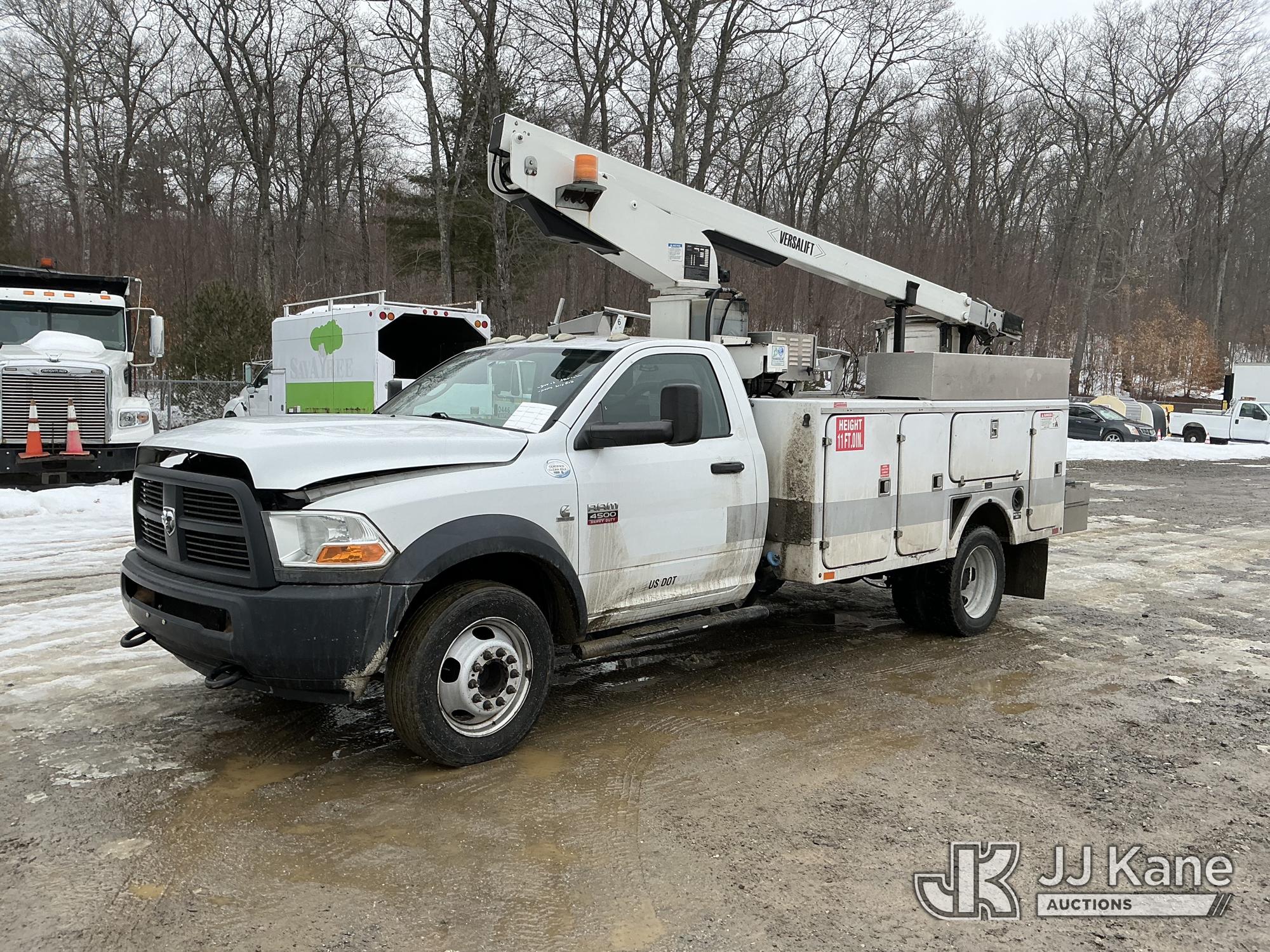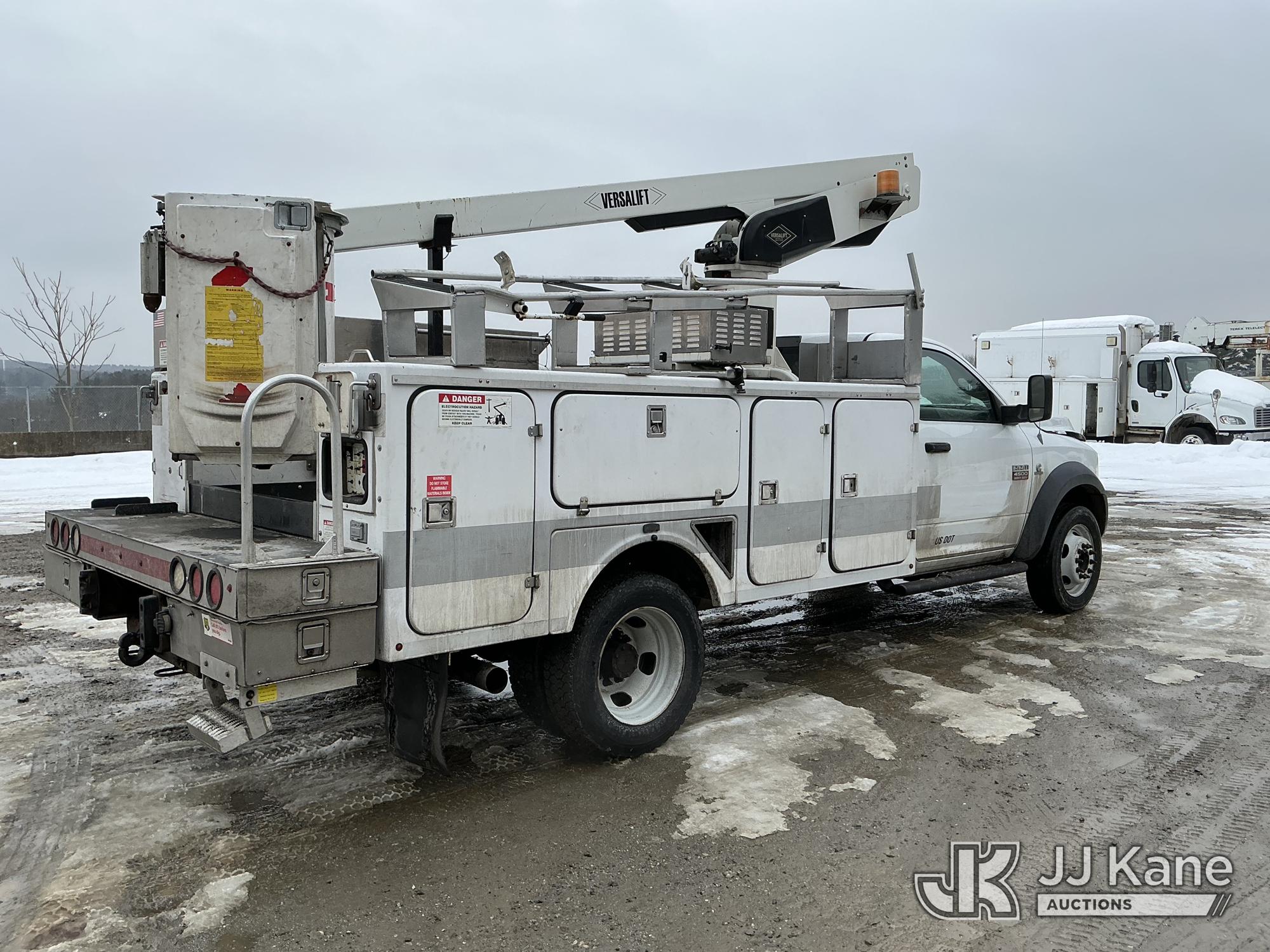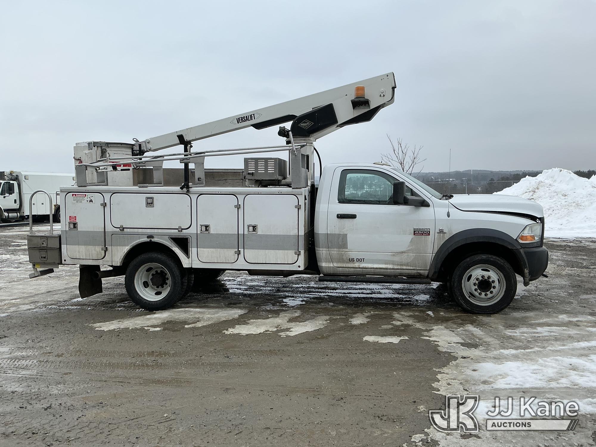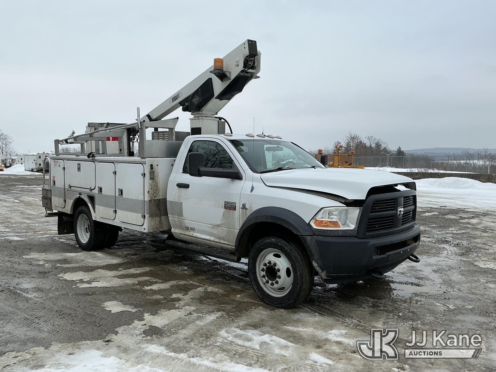 Versalift TEL29N02, 34 ft, Telescopic Non-Insulated Bucket Truck s/n AG120311, with single-man bucket, rear mounted on 2012 Dodge Ram 4500 Regular Cab 2WD Service Truck, Cummins 6.7L RWD, diesel, Auto, A/C, (95,902 miles) (Runs & Moves) (PTO Not Engaging, No Response From Upper Controls, Upper Condition Unknown, Seized Alternator, Missing Serpentine Belt, No Power Steering, Multiple Lights On Dash) This is a Titled Item*