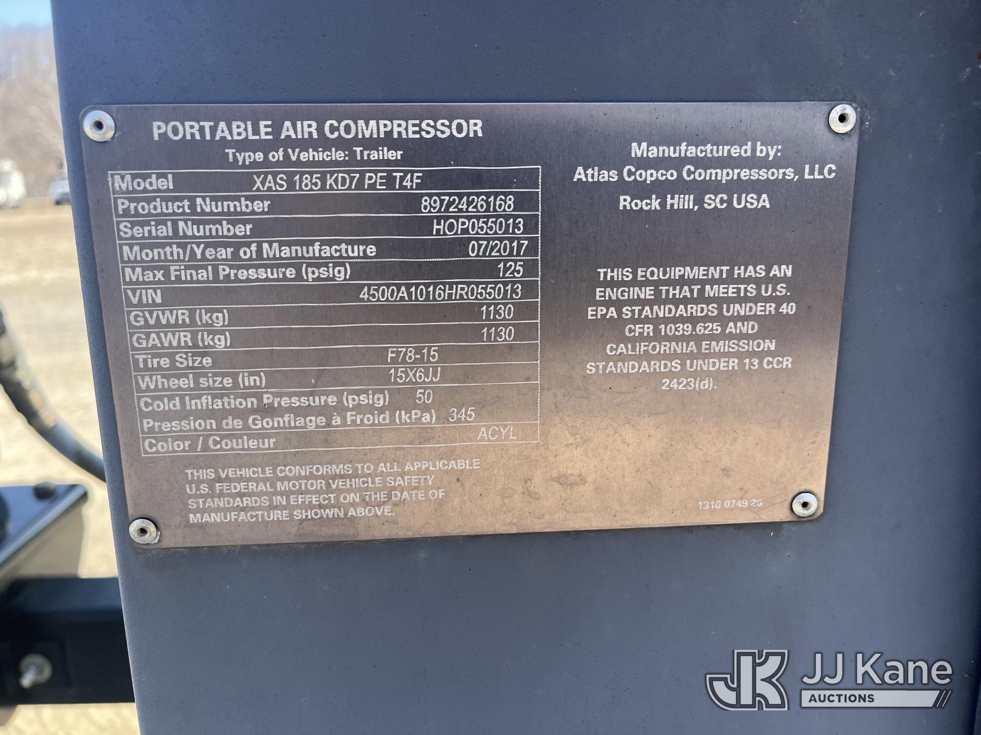 2017 Atlas Copco XAS185 KD7 PE T4F Portable Air Compressor