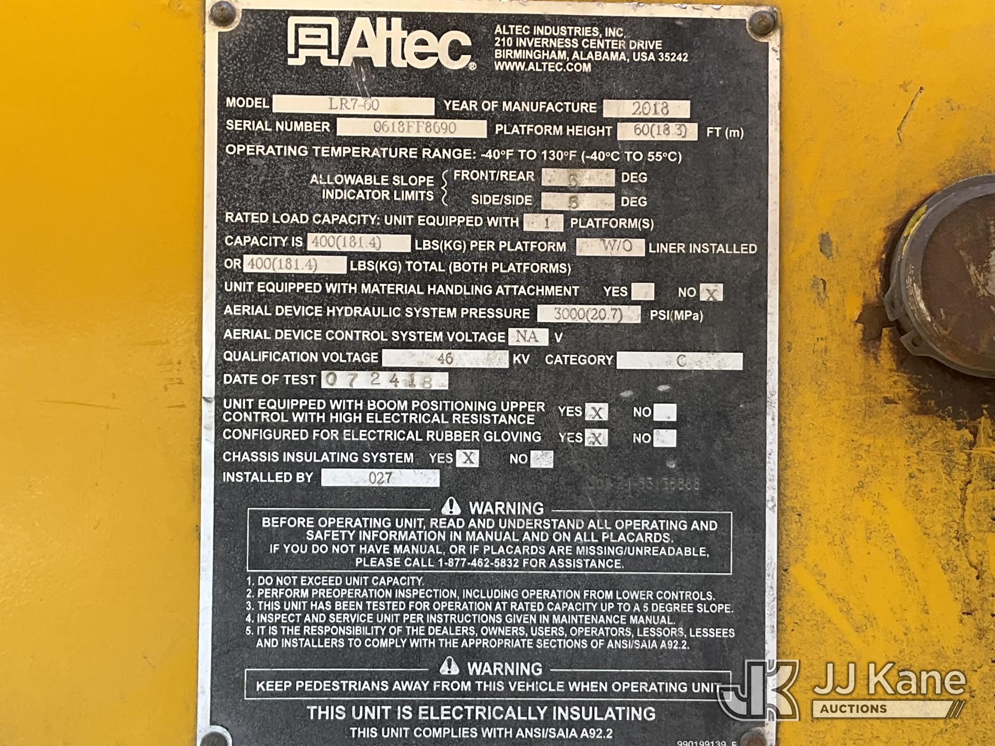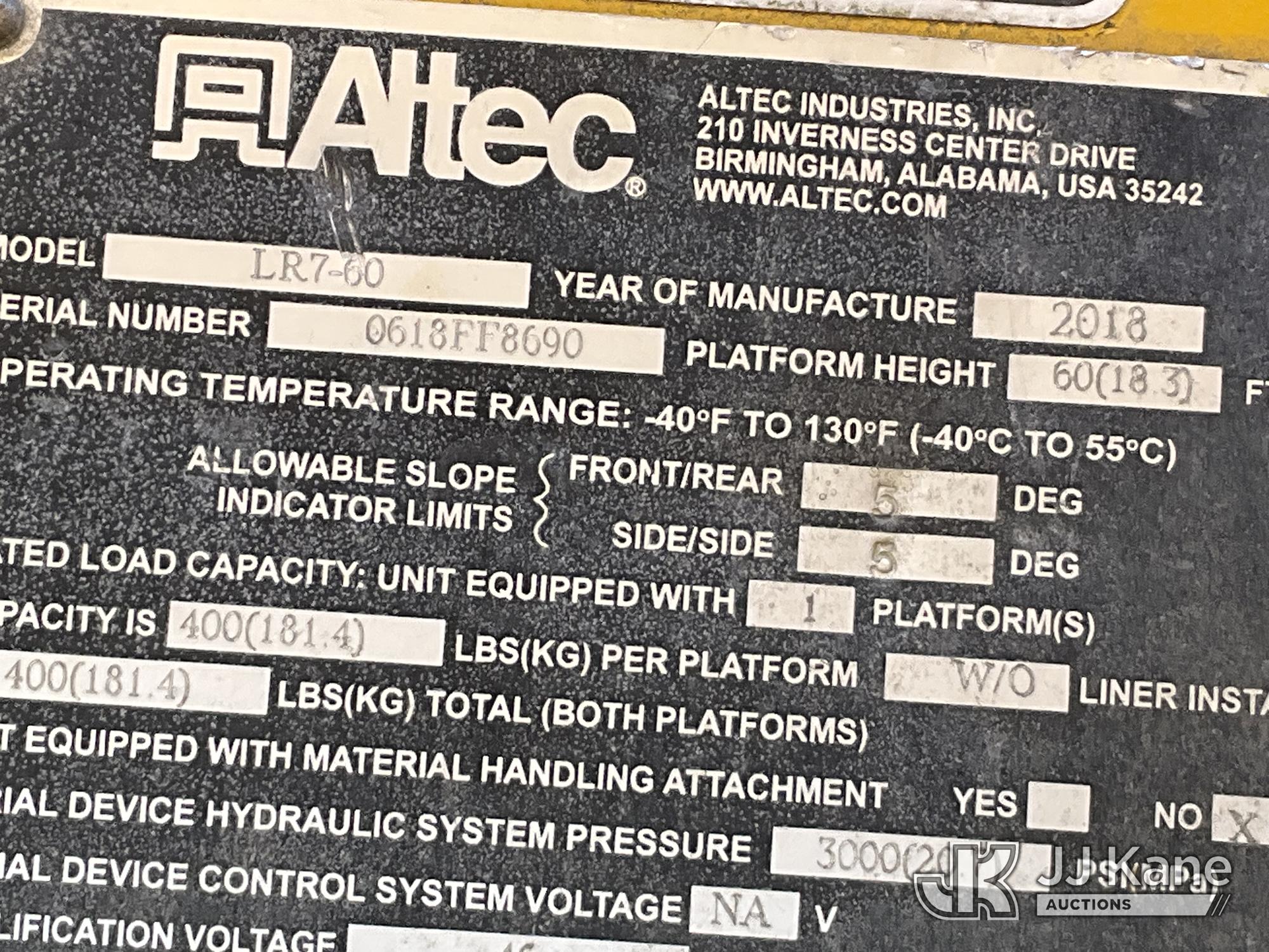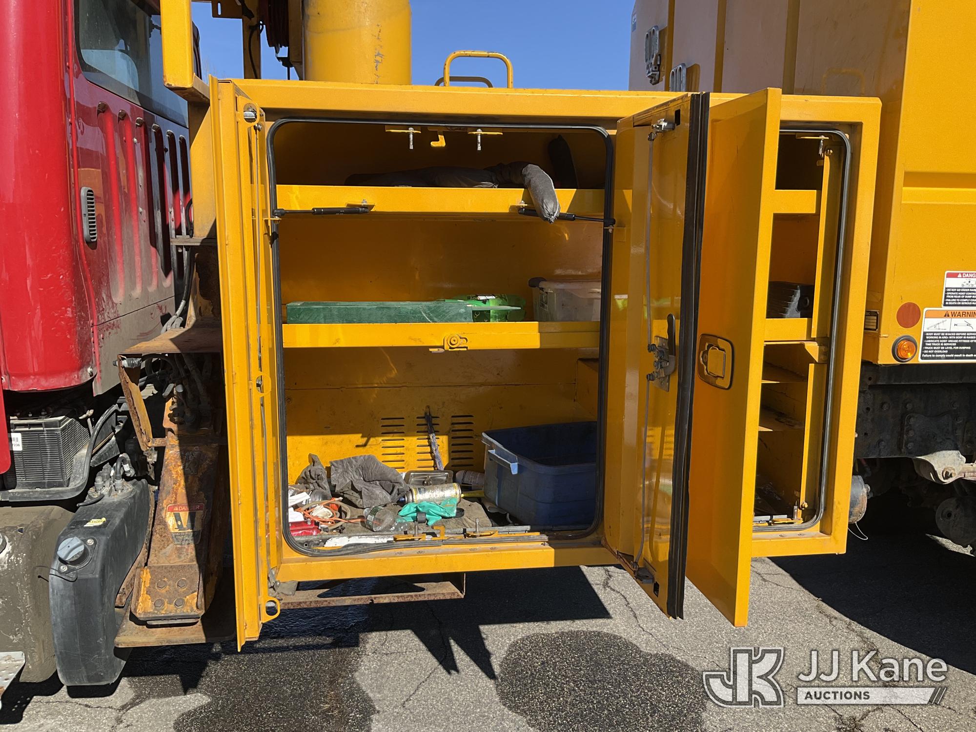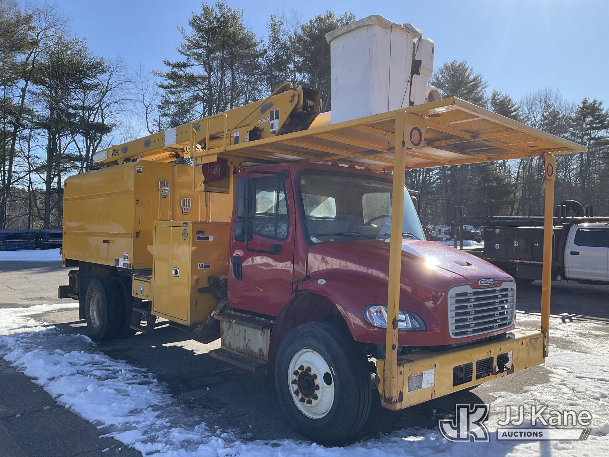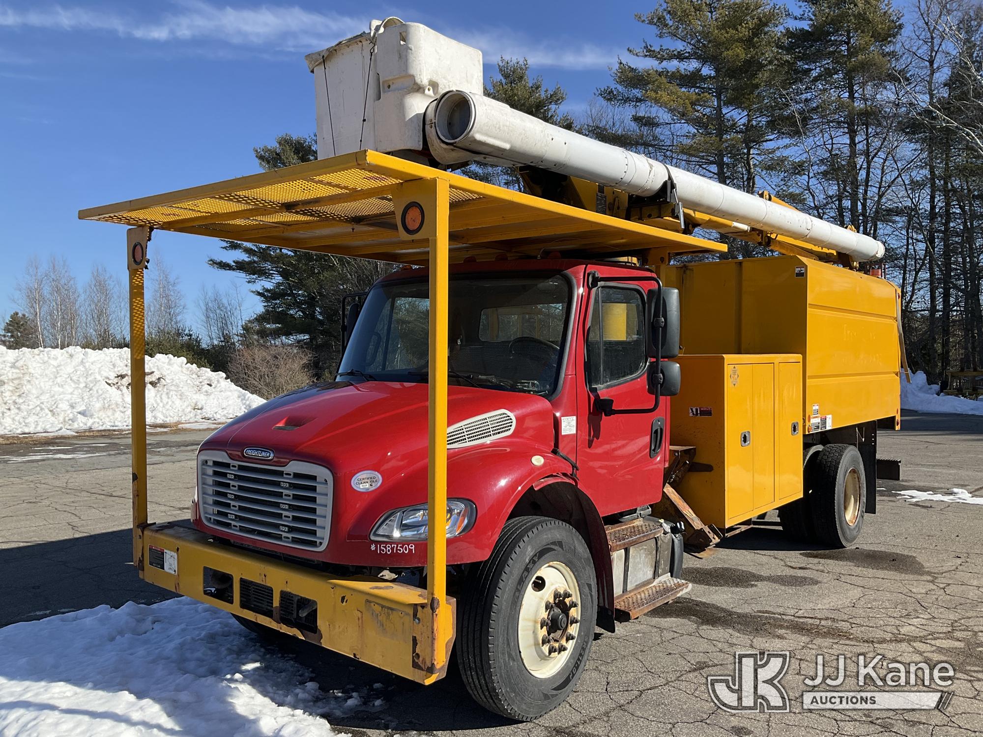 Altec LR7-60, 65 ft, Over-Center Bucket Truck s/n 0618FF8690, with single-man bucket & 2 hyd outriggers, mounted behind cab on 2019 Freightliner M2 Chipper Dump Truck, 6.7L diesel, Auto, with 11 ft. body, (117,249 miles) (Not Running, Harmonic Balancer Is Off Crankshaft, Turns Over With Jump Start, Upper Condition Unknown, Hours Unknown, Bed Has Wood Chips) This is a Titled Item*