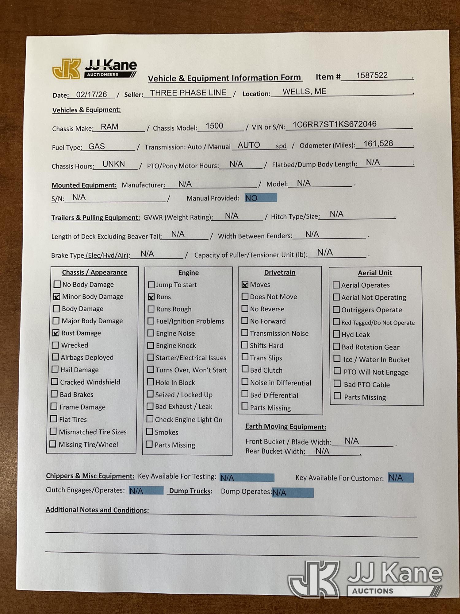 2019 RAM 1500 Classic Crew-Cab Pickup Truck, 8-cyl gas, 4wd, 8-Speed Automatic, A/C, with bed cover, (161,528 miles) (Runs & Moves) (Minor Body Damage, Rust Damage) This is a Titled Item*