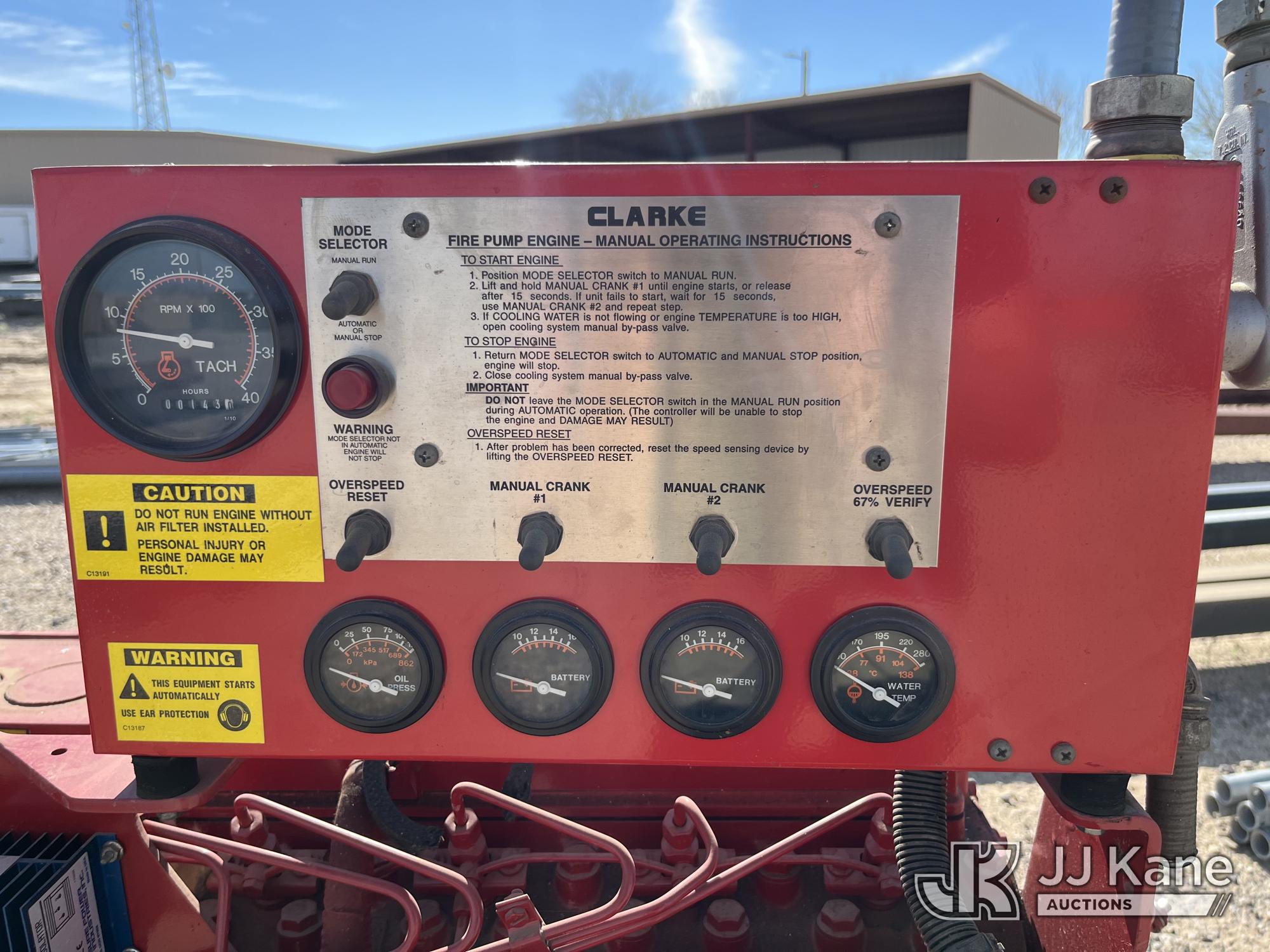 | Conditions / Miscellaneous: | Clarke Detroit Diesel-Allison Engine PDFP-06YT, Diesel Engine Specifically Designed To Drive Fire Pump Systems, Operating Range Of: 120 BHP @ 1760 RPM To 133 BHP @ 2100 RPM, 143 Hours |