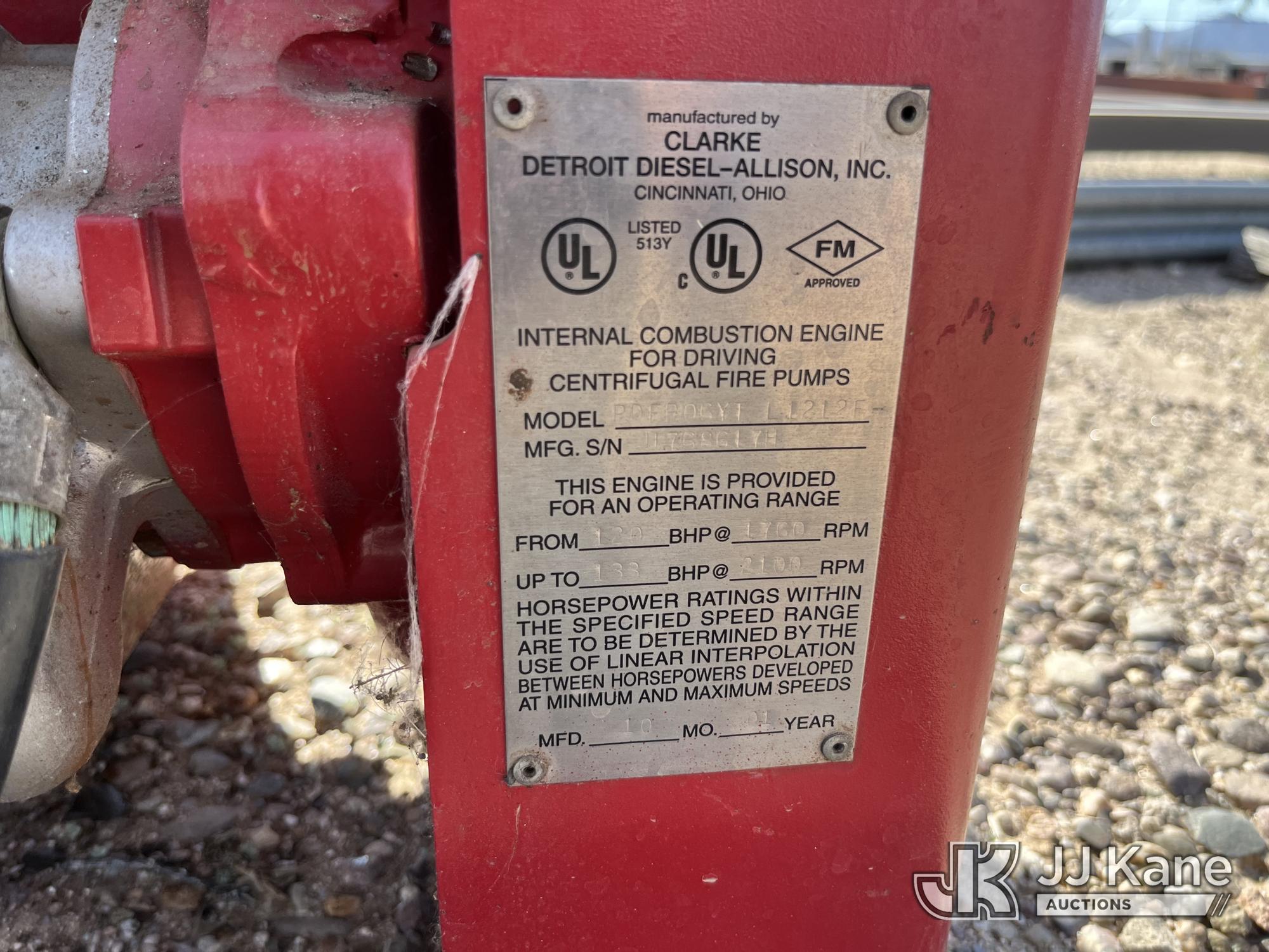 2001 s/n 11768617H, Clarke Detroit Diesel-Allison Engine PDFP-06YT, Diesel Engine Specifically Designed To Drive Fire Pump Systems, Operating Range Of: 120 BHP @ 1760 RPM To 133 BHP @ 2100 RPM, 143 Hours ((Operates)(Seller States: Small Hole In The Oil Pan From When It Was Removed))*