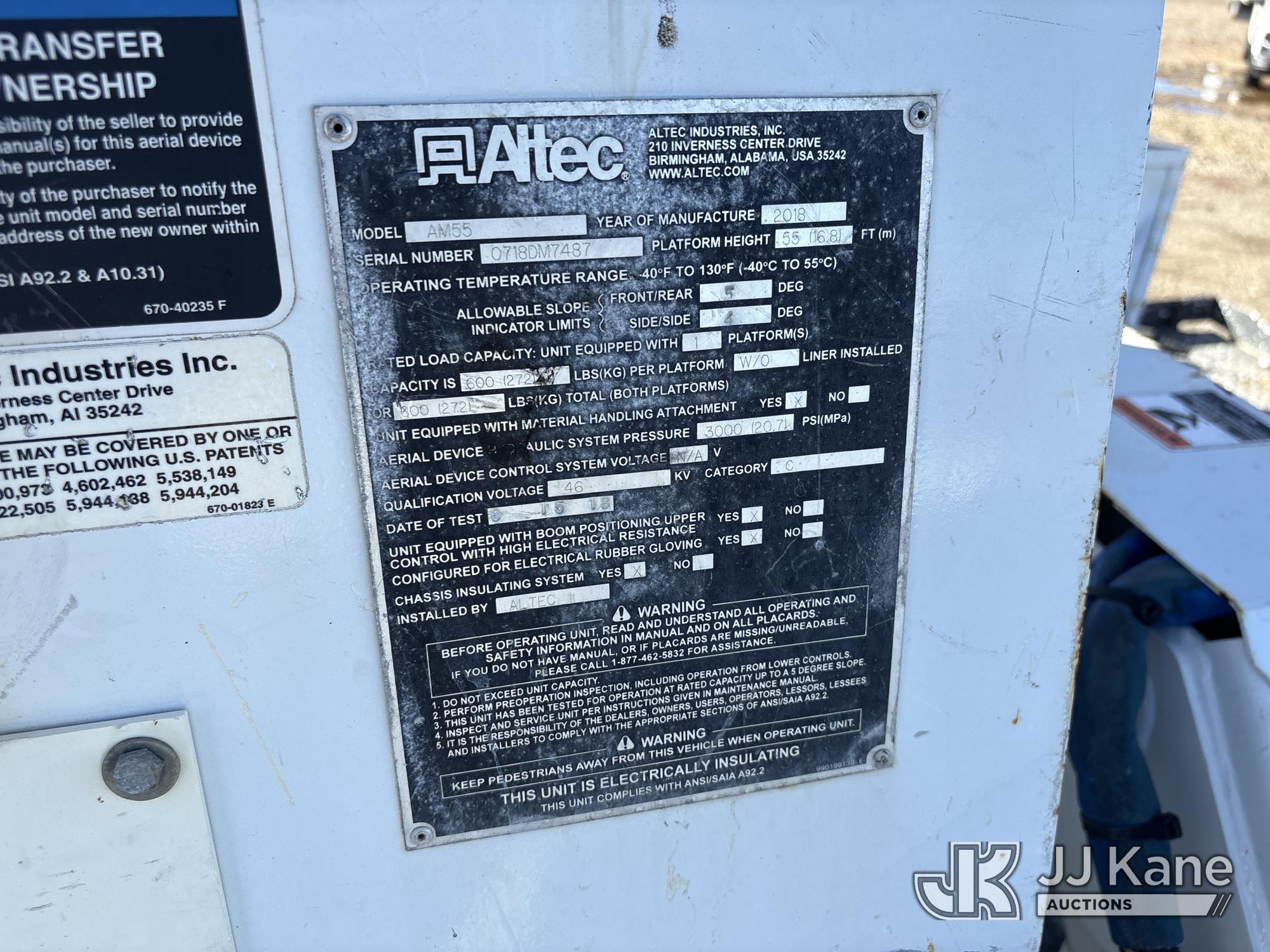 Altec AM55, 61 ft, Articulating Non-Over Center Bucket Truck s/n 0718DM7487, with 4 hyd outriggers, two man bucket, material handler, rear mounted on 2019 Freightliner M2 106 Utility Truck, Cummins 6.7L Diesel Auto, A/C, (40,990 miles) (Runs, Moves & Upper Operates) (Reads 3,333 hours) May be subject to ARB Regulations This is a Titled Item*