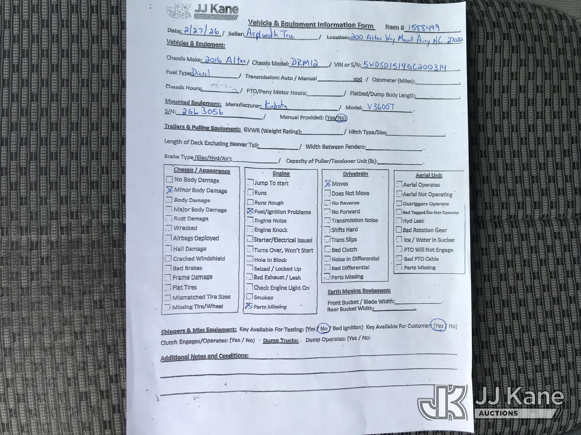 2016 Altec DRM12 Chipper (12in Drum), Kubota diesel, trailer mtd. (Not Running, Fuel Problems, Condition Unknown) (Seller States: bad lift pump and fuel pump. bad battery) This is a Titled Item*