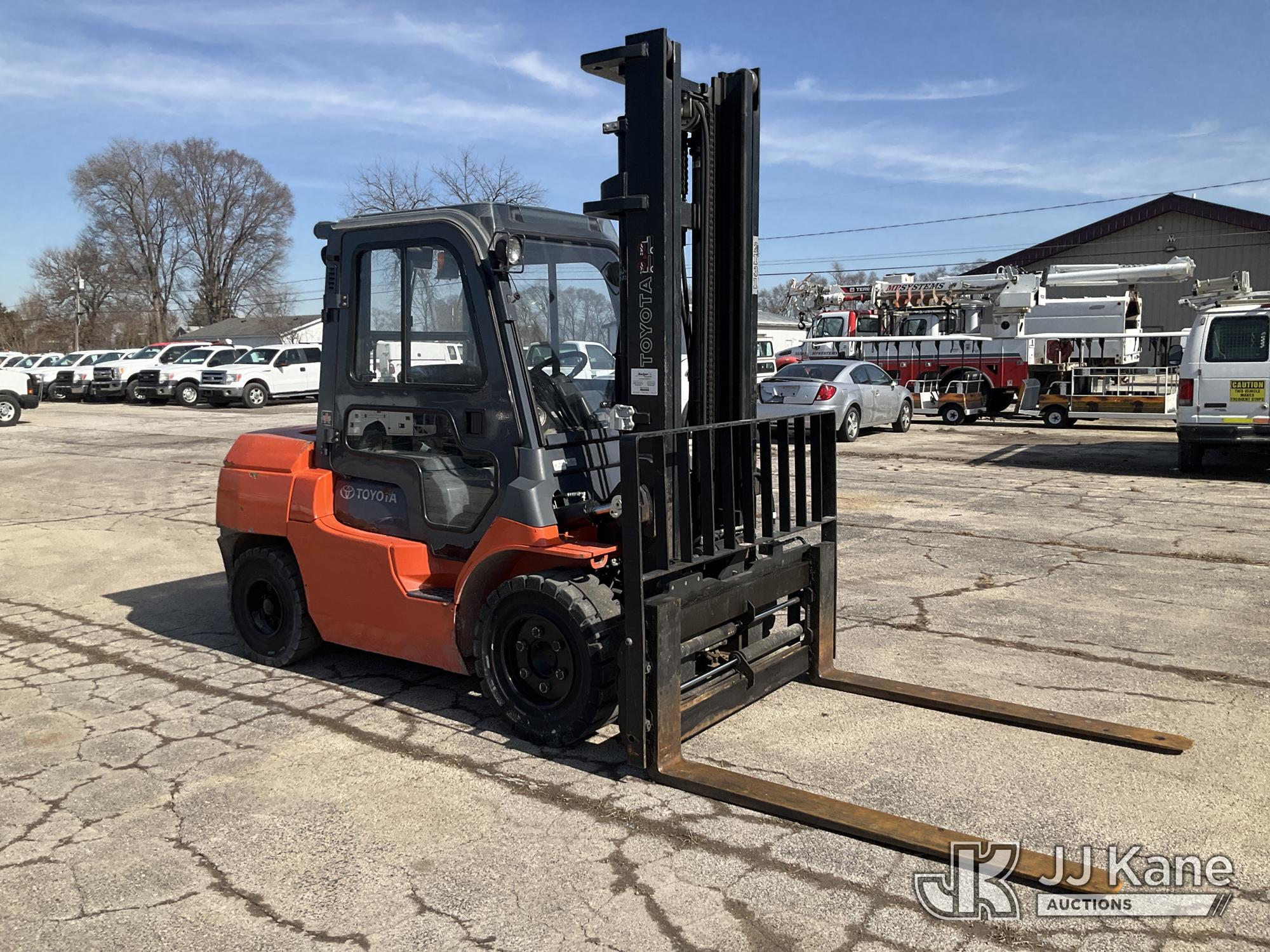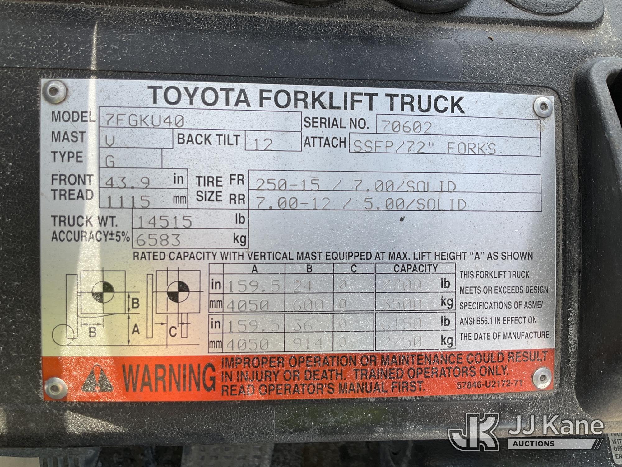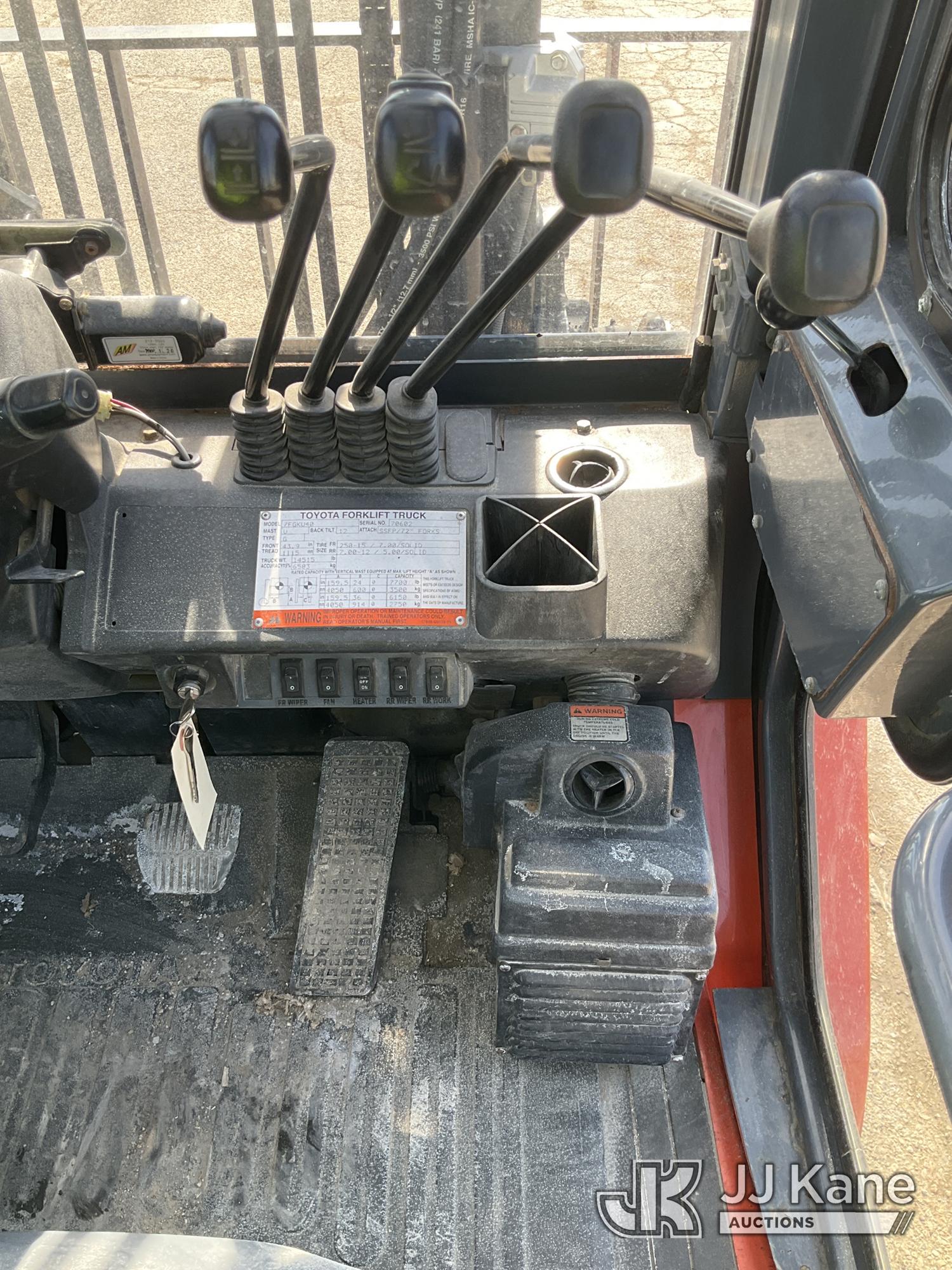 2010 Toyota 7FGKU40 Solid Tired Forklift, s/n 70602, 4-cyl gas, Shuttle, with 7,700lbs. capacity, 159in. mast height, hyd open/close, hyd side shift, 60in. forks & EROPS, (Runs, Moves, Operates) (Reads 3,678 hours)*