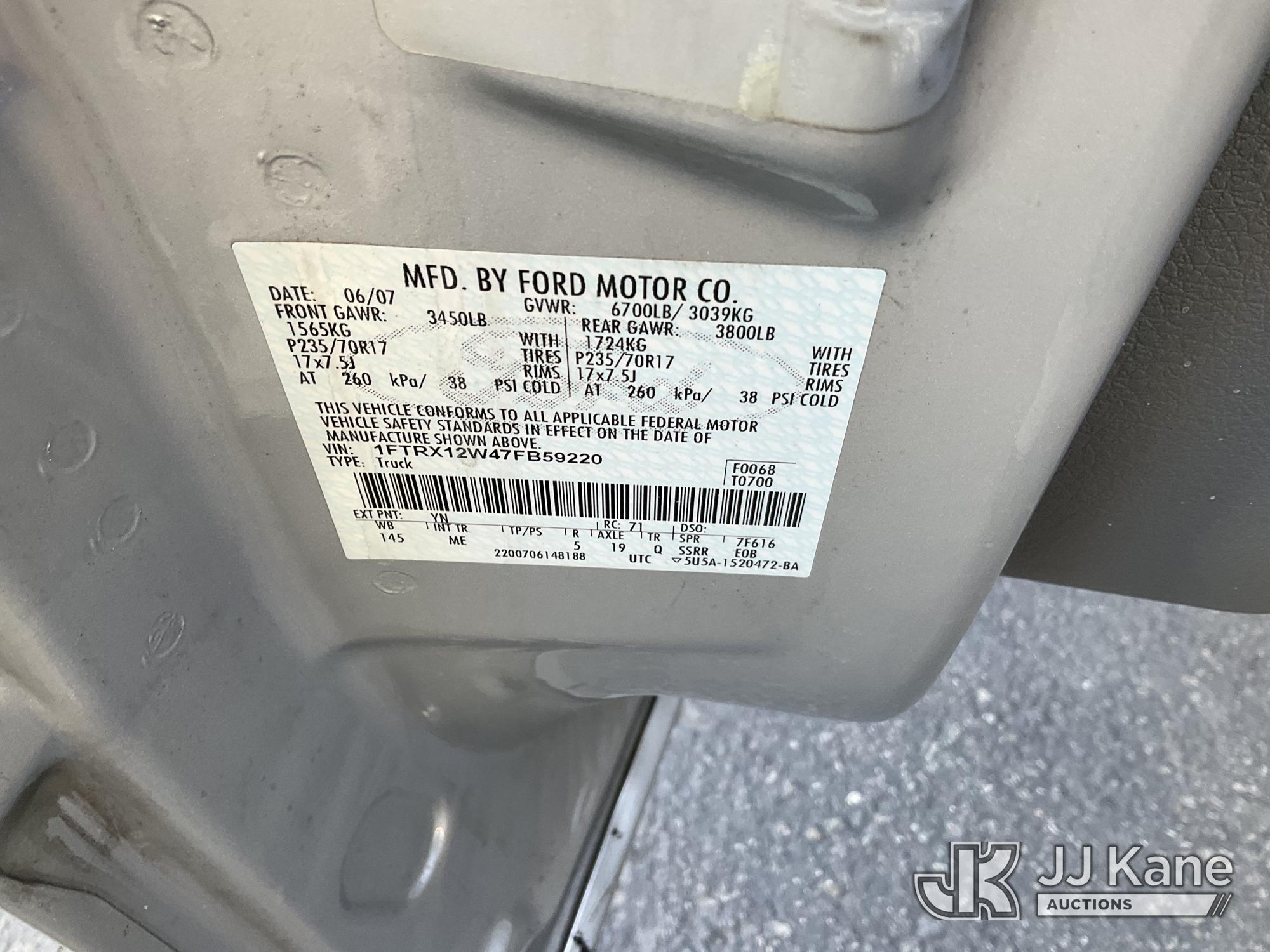 2007 Ford F-150 Extended-Cab Pickup Truck, s/n 1FTRX12W47FB59220, 4.6L V8 SOHC 16V Gas, RWD, 4-Speed Automatic, A/C, (142,778 miles) Vehicle Previously Used With A ‘Cold Plate’ Or Protected Record Registration. Due To The Prior Status, VIN May Not Yet Appear In NMVTIS, Which Could Affect DMV Title/Registration Processing. Buyer Acknowledges & Accepts This (Runs & Moves) (Needs Battery, Missing Catalytic Converter) (Bidding Restricted to Licensed Vehicle Dealers Only), This is a Titled Item*
