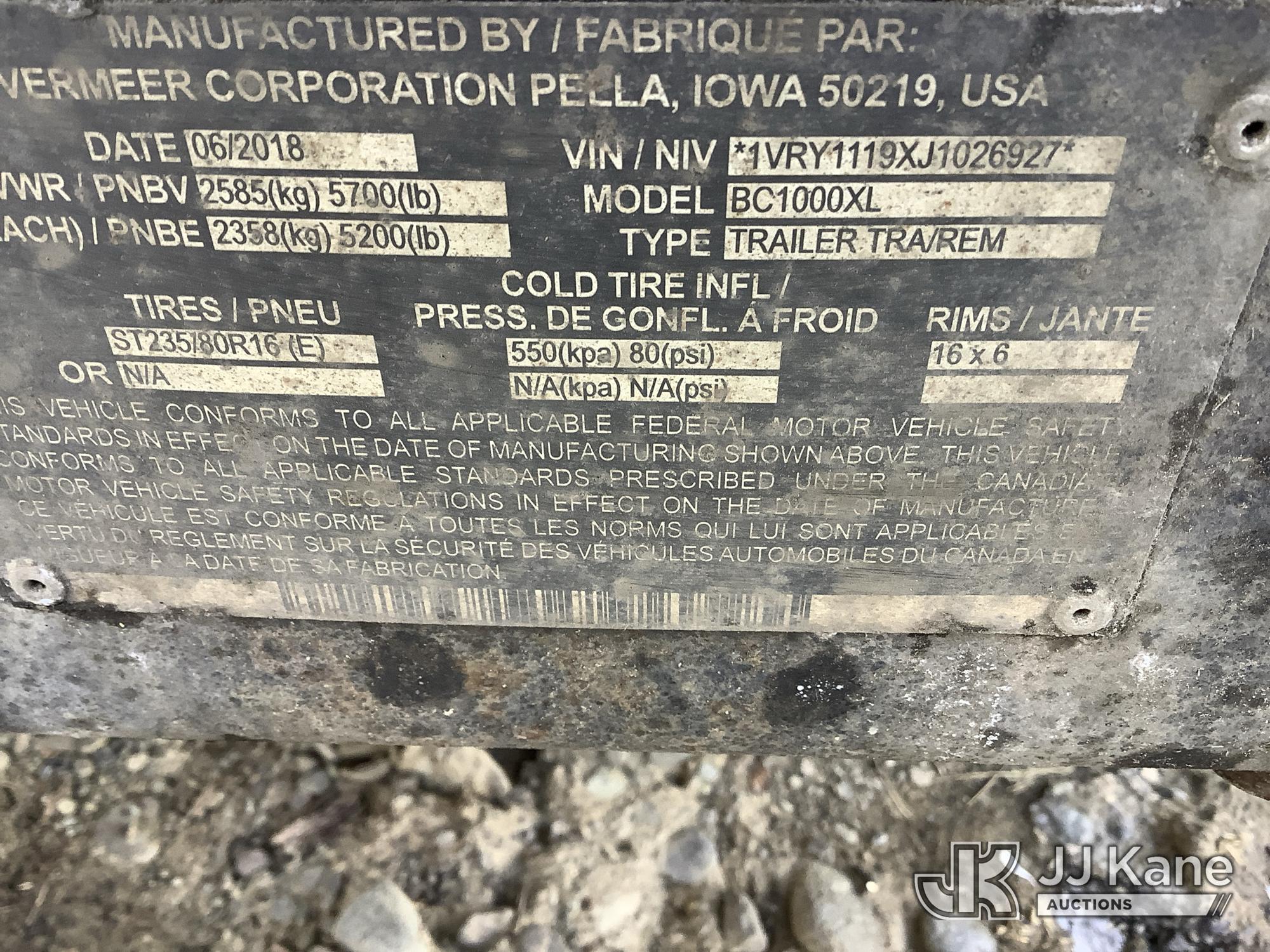2018 Vermeer BC1000XL Chipper (12in Drum), 4-cyl gas, trailer mtd. (Not Running, Turns Over, Won’t Stay Running, Condition Unknown, Body/Rust Damage) (Seller States: Radiator & Fan belt Repair Needed) (Reads 1,441 hours) This is a Titled Item*