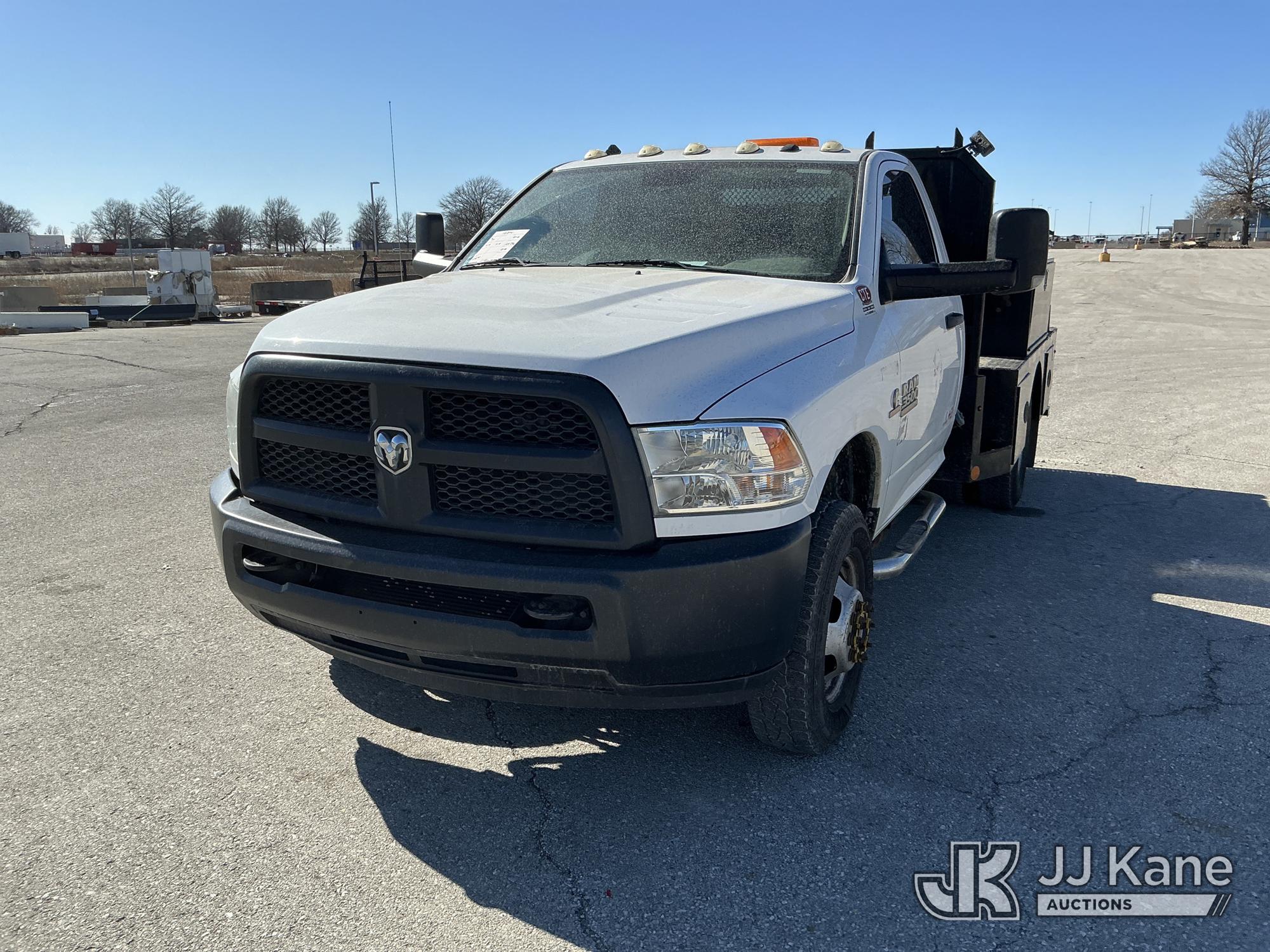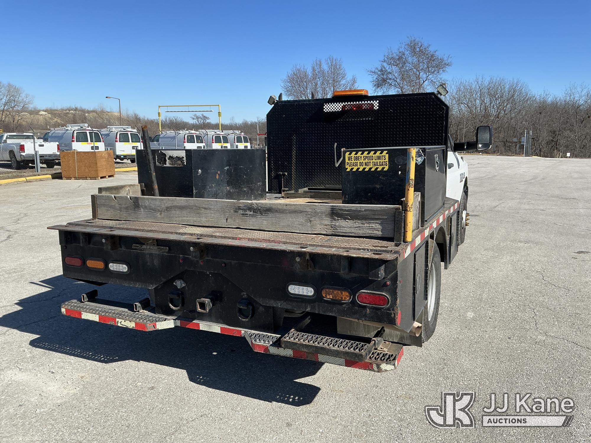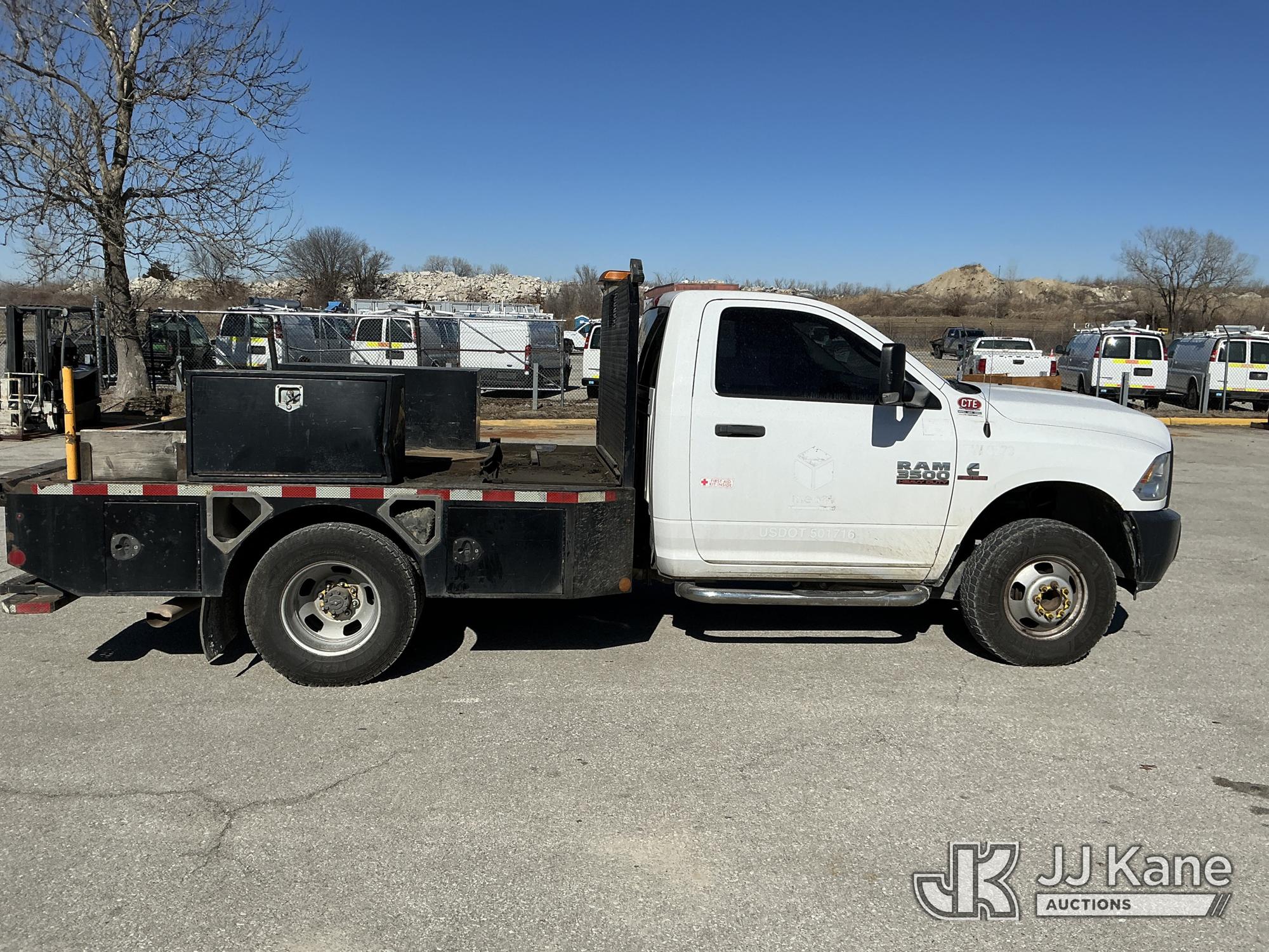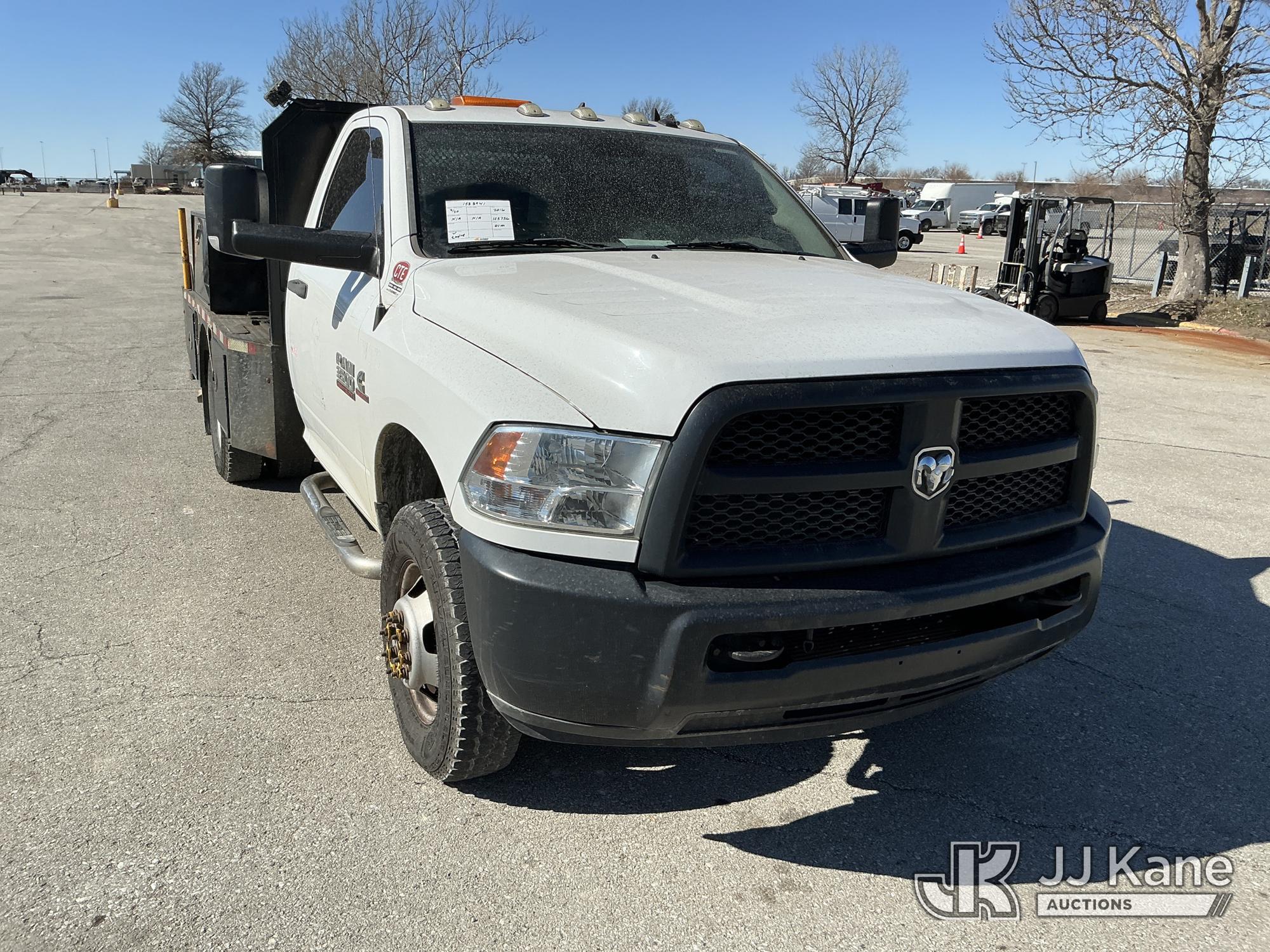 2016 RAM 3500 Flatbed/Service Truck, 6.7L Turbo Diesel 6-Speed Automatic, A/C, (123,736 miles) (Runs & Moves) (Check Engine Light On, Traction Control Light, Jump To Start, Small Dent On Edge Of Driver Door, Latches Missing On Lower Bed Boxes) (Reads 5,307 hours) This is a Titled Item*