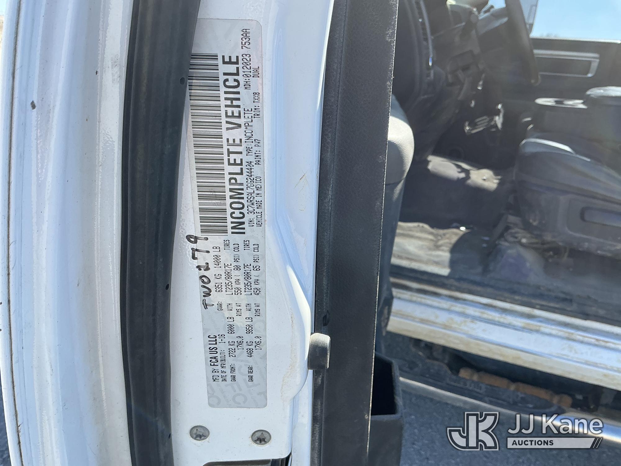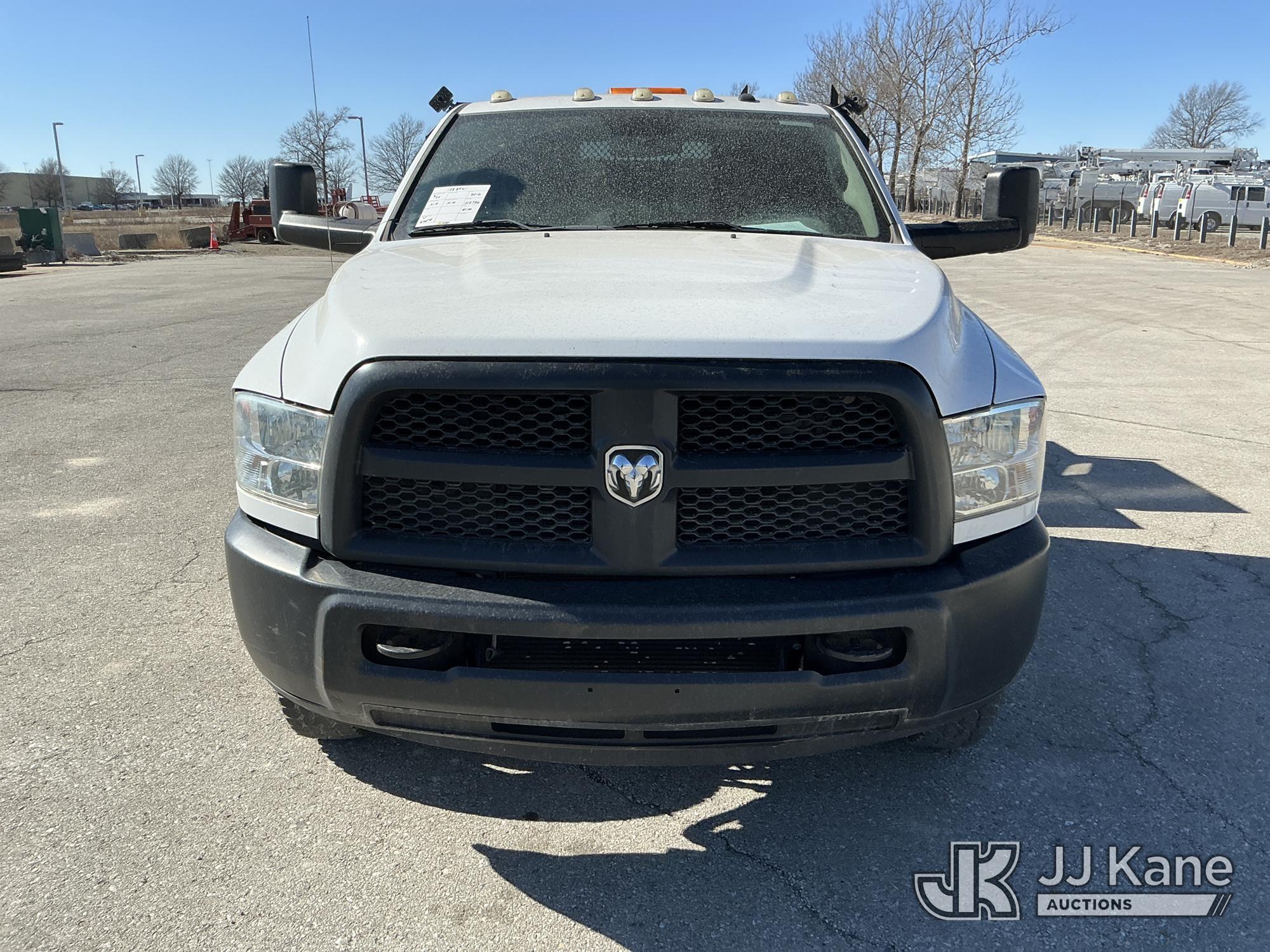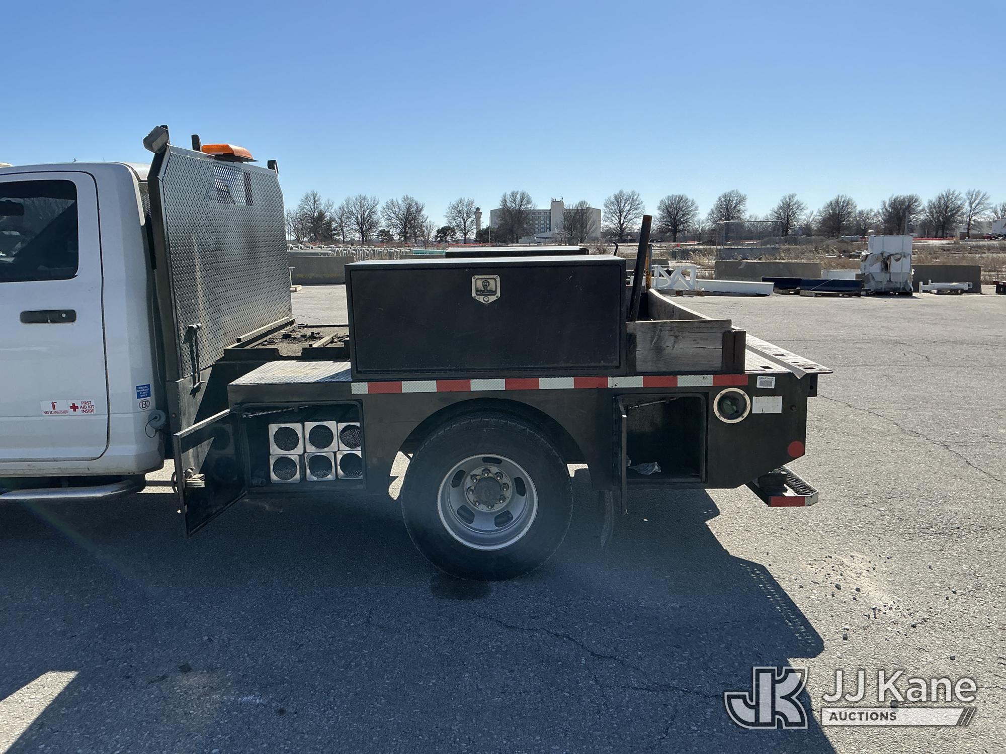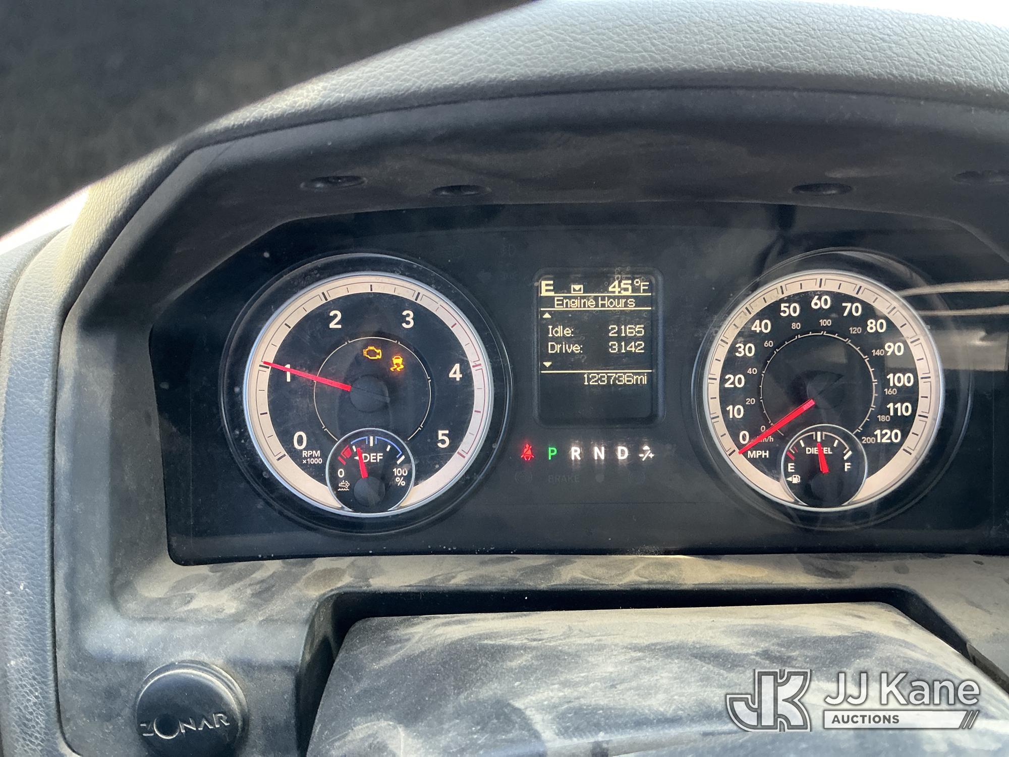 2016 RAM 3500 Flatbed/Service Truck, 6.7L Turbo Diesel 6-Speed Automatic, A/C, (123,736 miles) (Runs & Moves) (Check Engine Light On, Traction Control Light, Jump To Start, Small Dent On Edge Of Driver Door, Latches Missing On Lower Bed Boxes) (Reads 5,307 hours) This is a Titled Item*