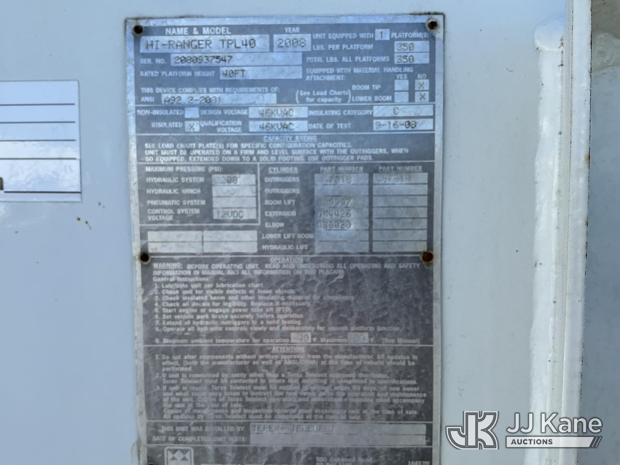 HiRanger TPL40, 45 ft, Articulating & Telescopic Bucket Truck s/n 2080937547, with single man bucket, mounted behind cab on 2008 International 4300 Utility Truck, 7.6L diesel, 4X2, Auto, A/C, (63,475 miles) (Runs, Moves & Upper Operates) (Reads 5,433 hours) This is a Titled Item*
