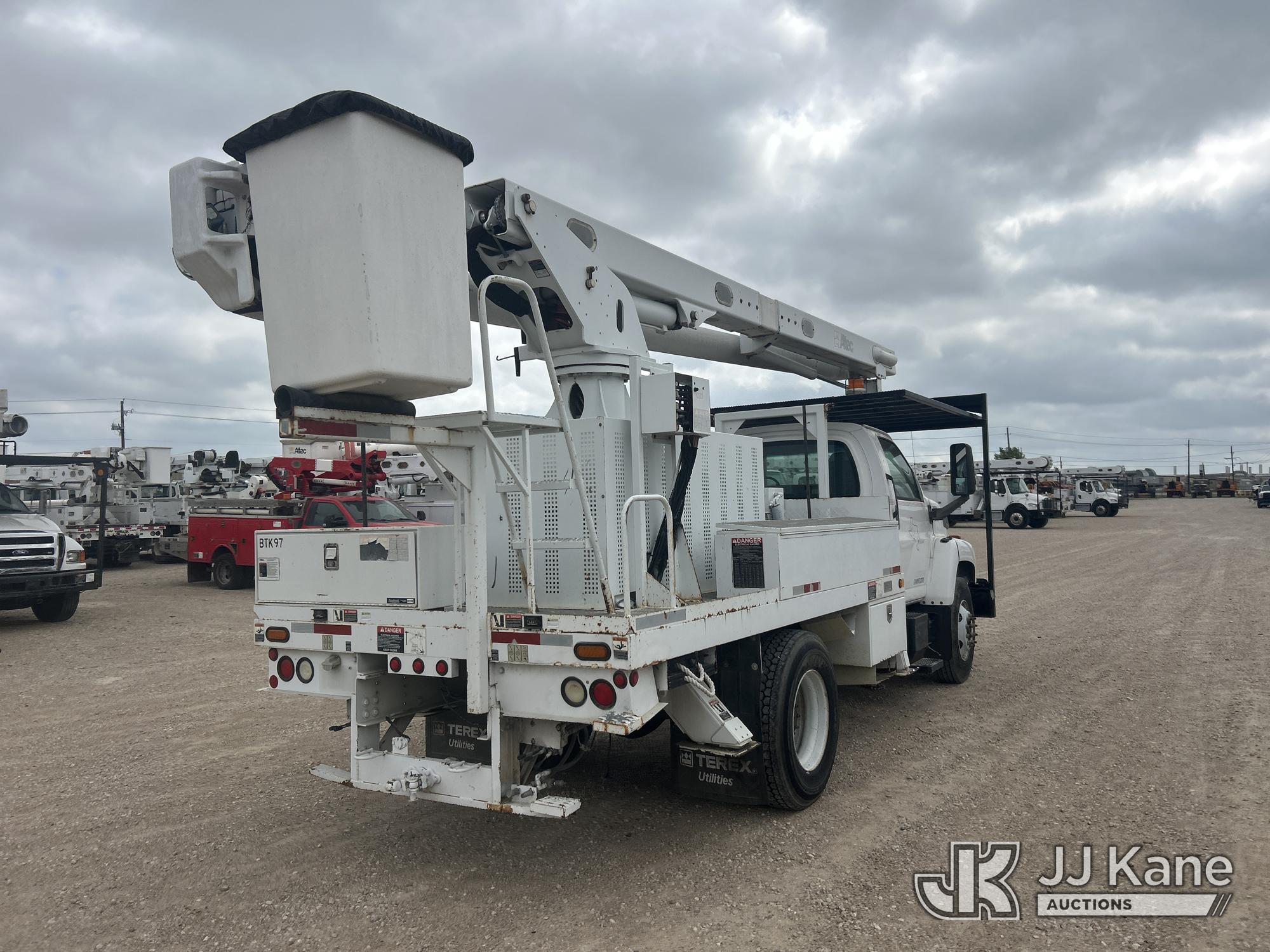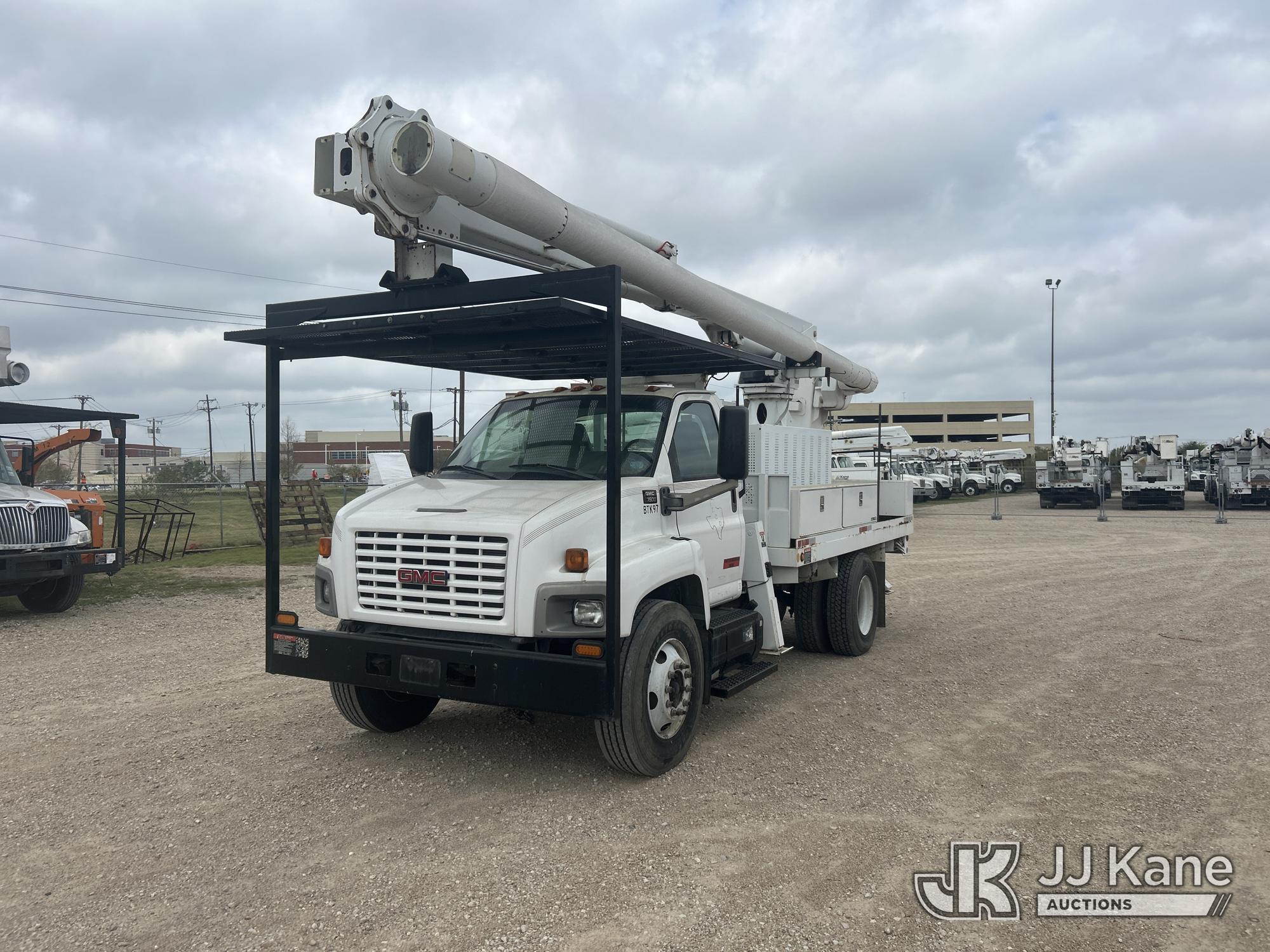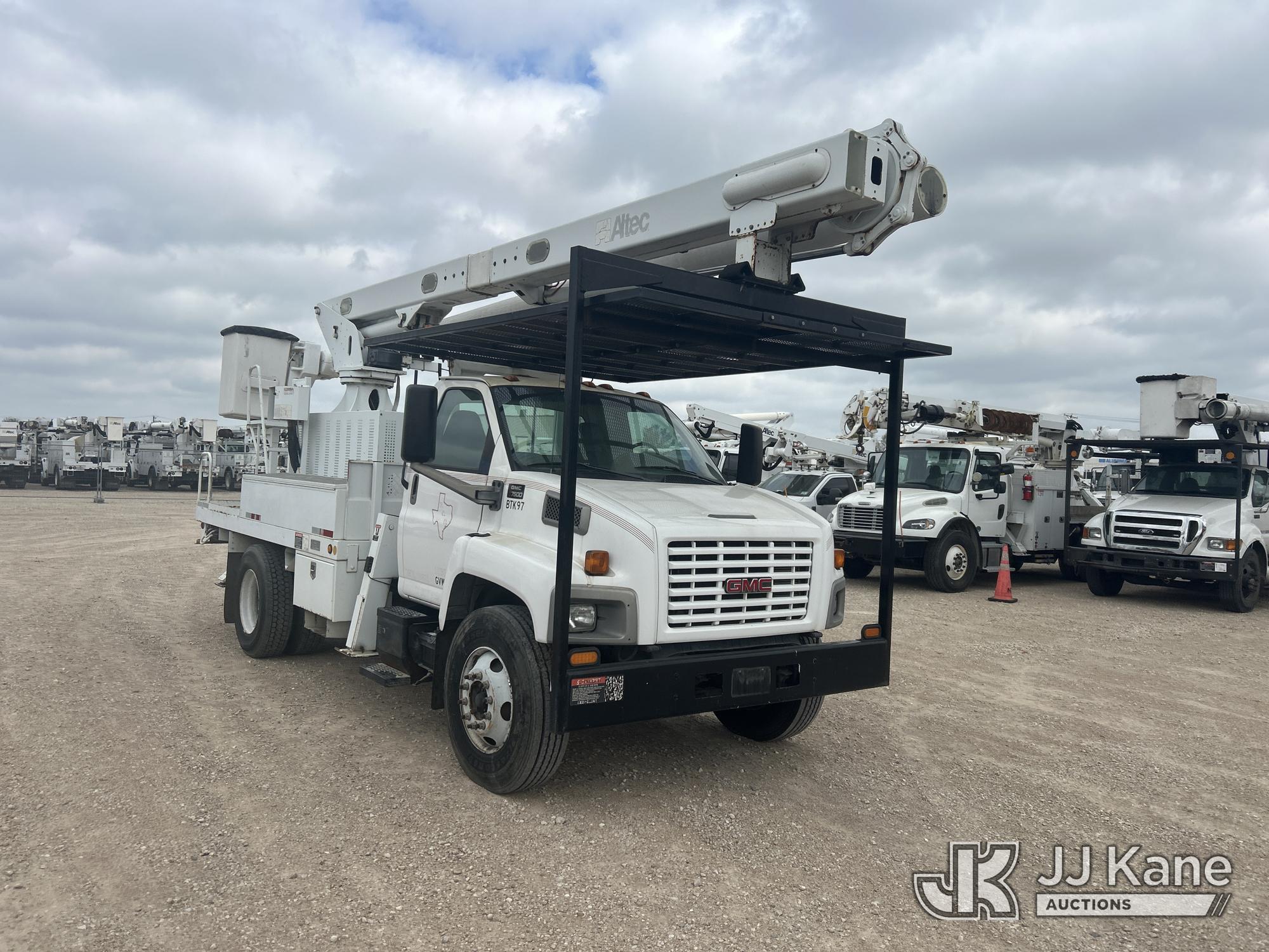 Altec LRV-60E70, 75 ft, Over-Center Elevator Bucket Truck s/n 0307CV6195, with Single-Man Bucket, 4 hydraulic outriggers, rear mounted on 2006 GMC C7C042 Flatbed/Service Truck, 7.2L L6 TURBO DIESEL 4X2, manual, A/C, (Exempt from Odometer Disclosure - Reads 122,009 miles) (Runs, Moves & Upper Condition Unknown) (Outriggers Condition Unknown, PTO Grinds, Jump To Start) This is a Titled Item*