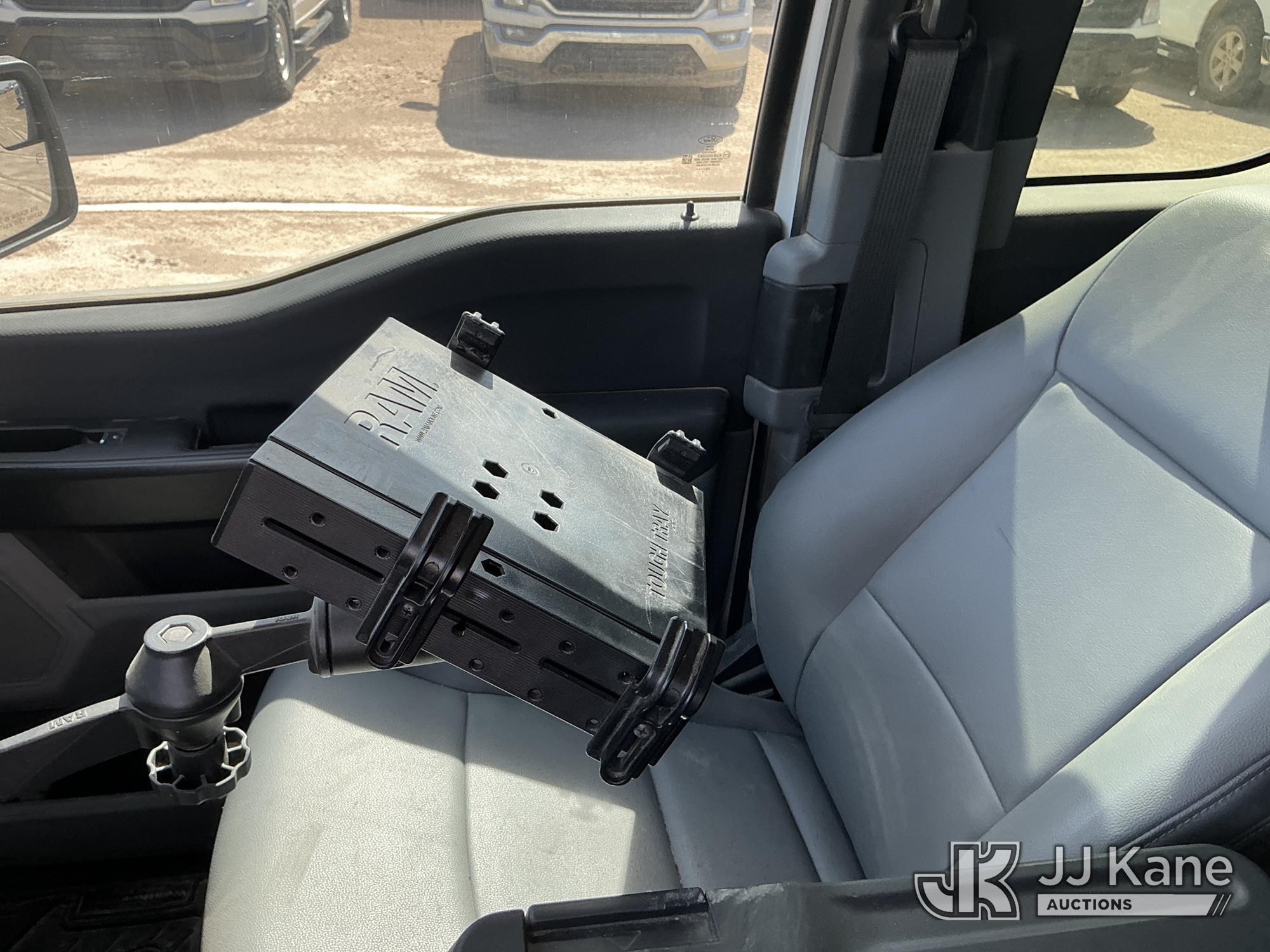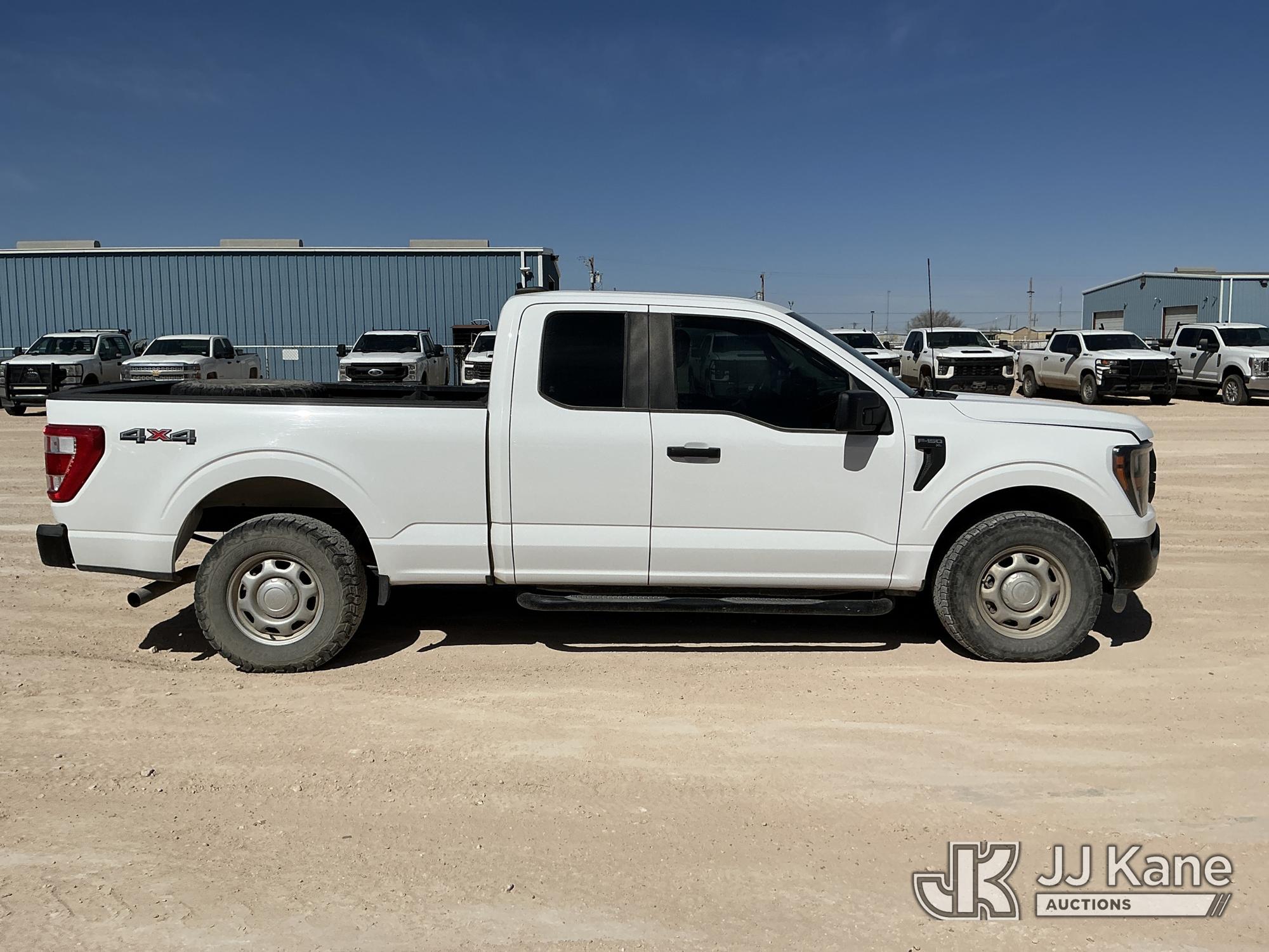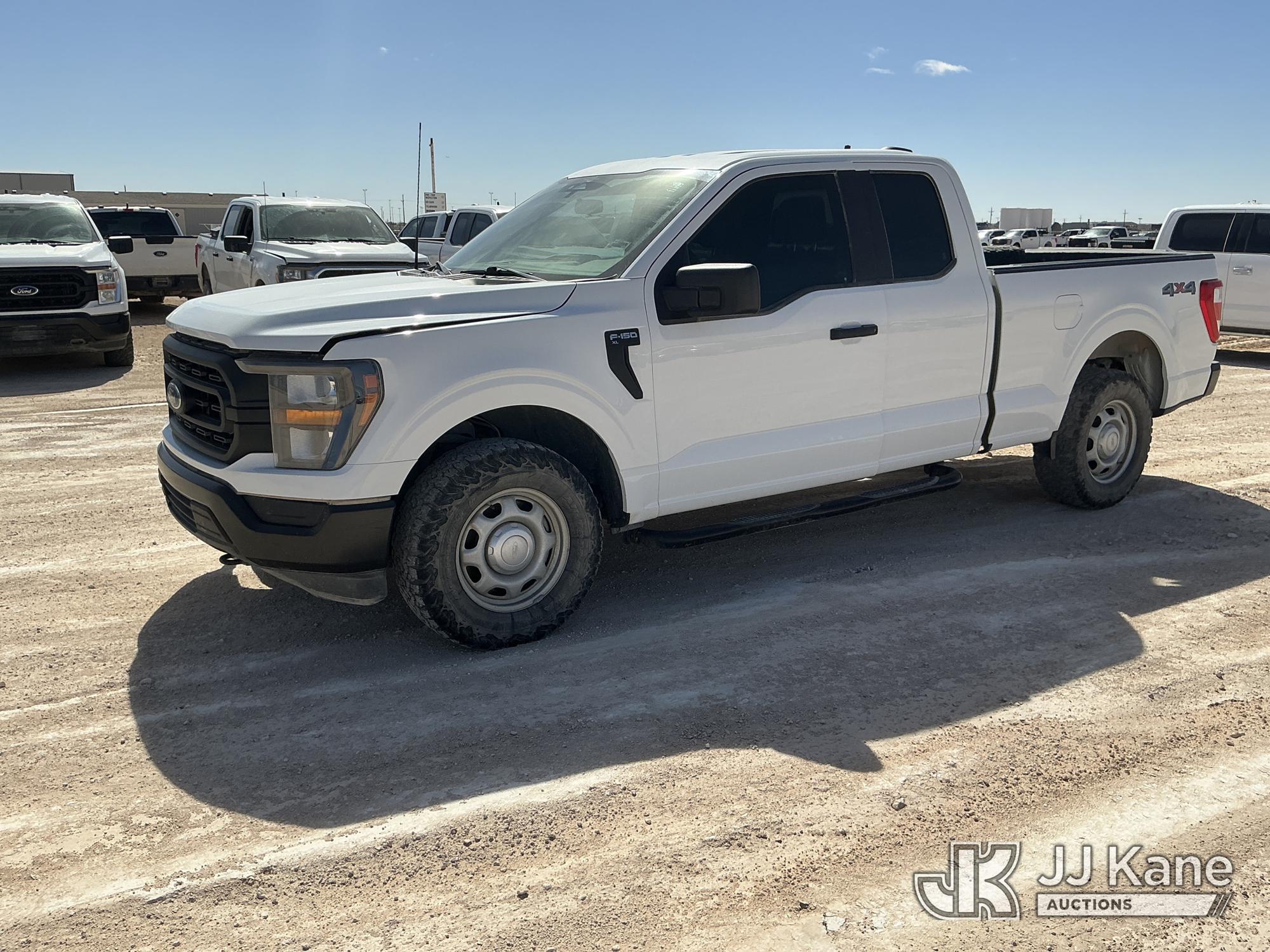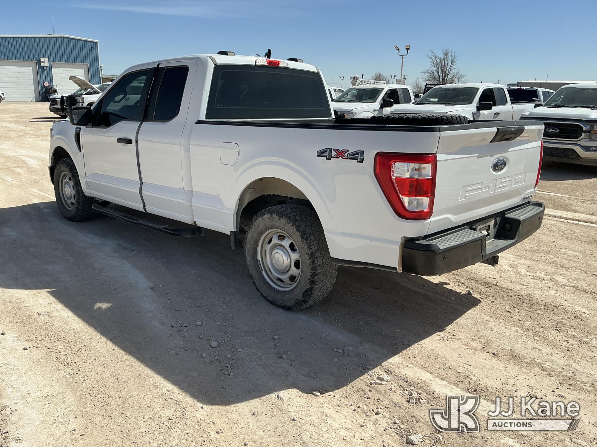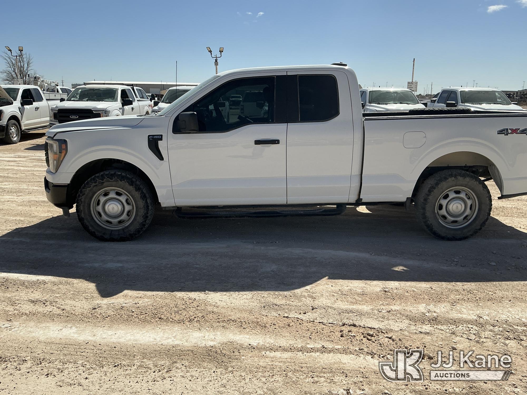 2023 Ford F-150 Extended-Cab Pickup Truck, 8-cyl gas, 4WD, 6-Speed Automatic, A/C, with Cab Mounted Computer Stand, Bed Mounted Toolbox , (103,618 miles) (Runs & Moves) (Jump To Start, Check Engine Light Is On, Transmission Shift System Fault Message Alert, Transmission Shifts Rough, Engine Idles Rough, Service Light Is On, Body Damage Dents & Scratches All Around) (Reads 7,129 hours) This is a Titled Item*