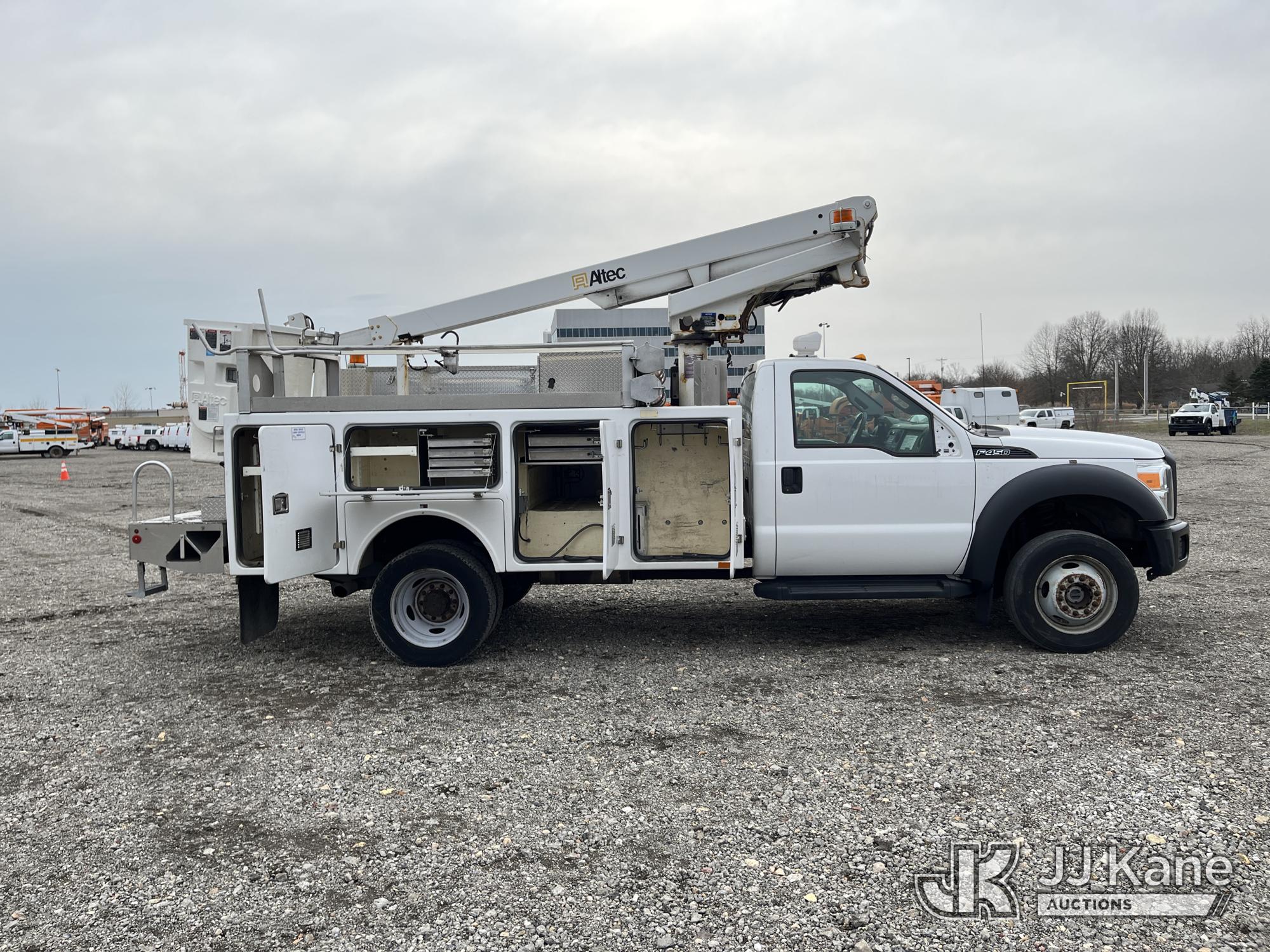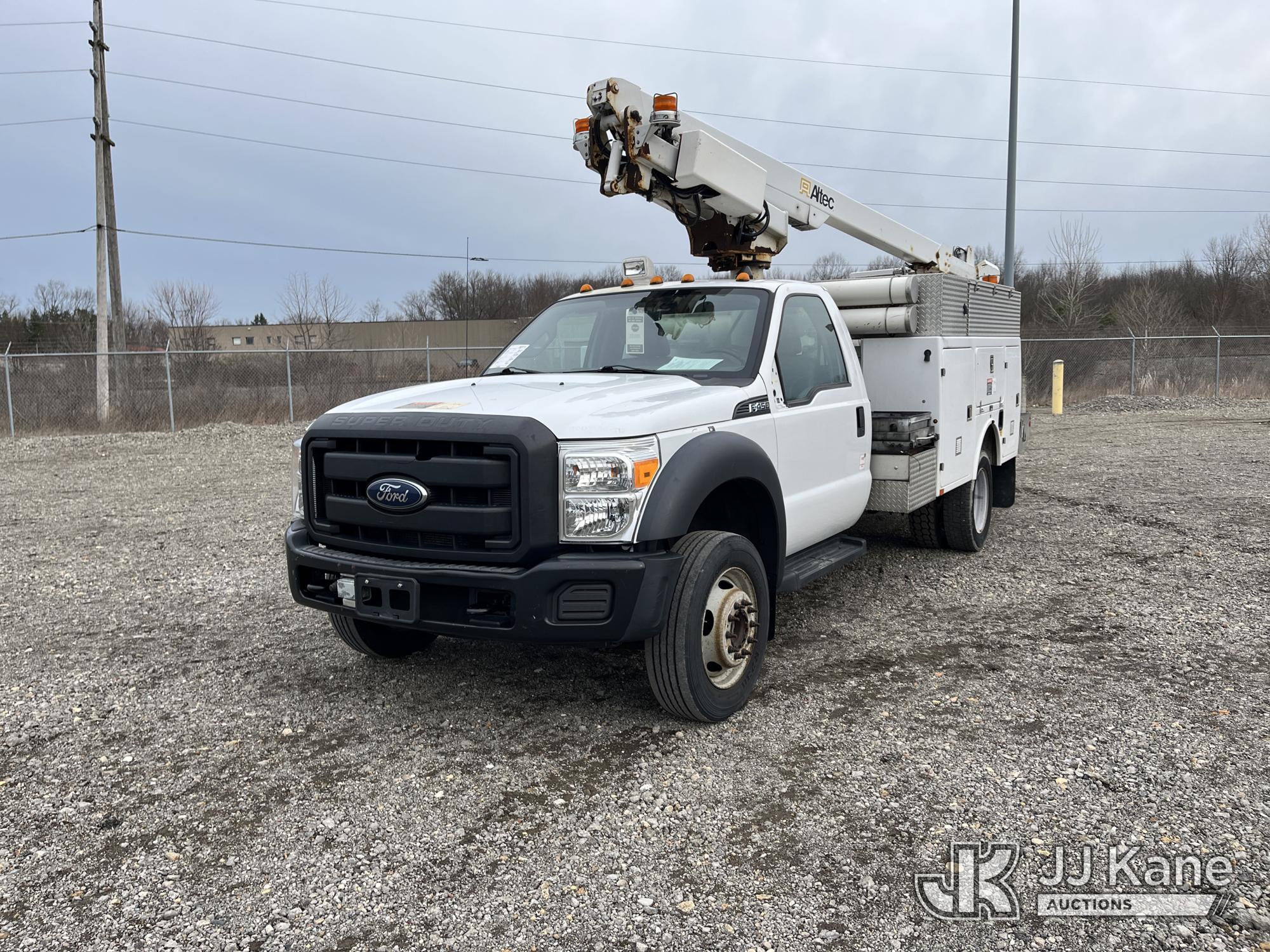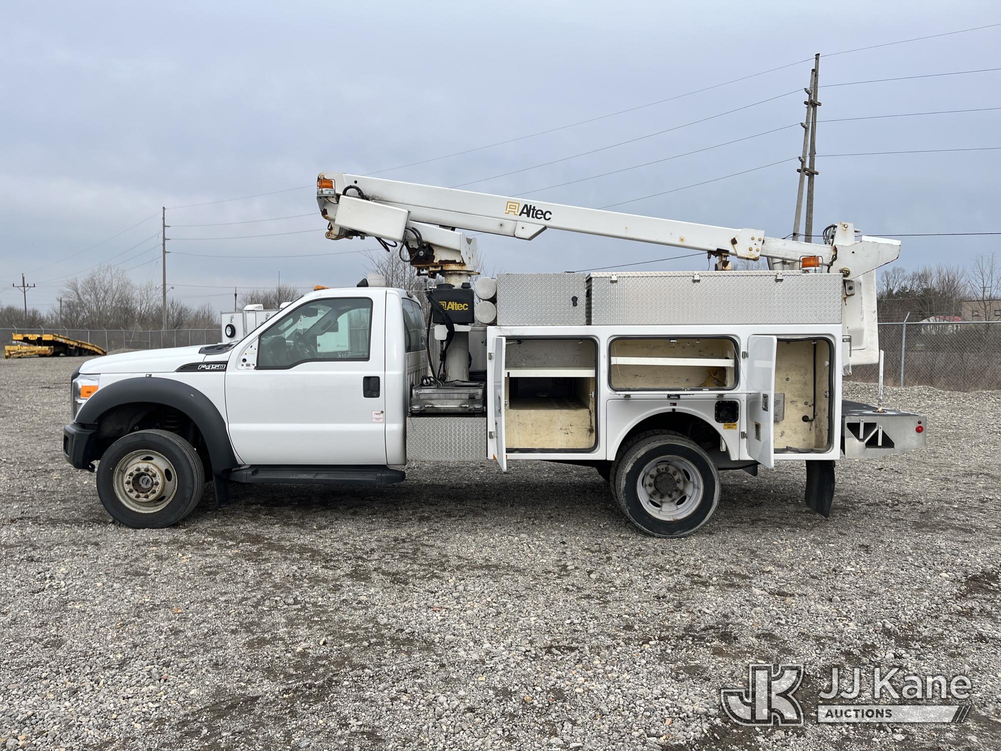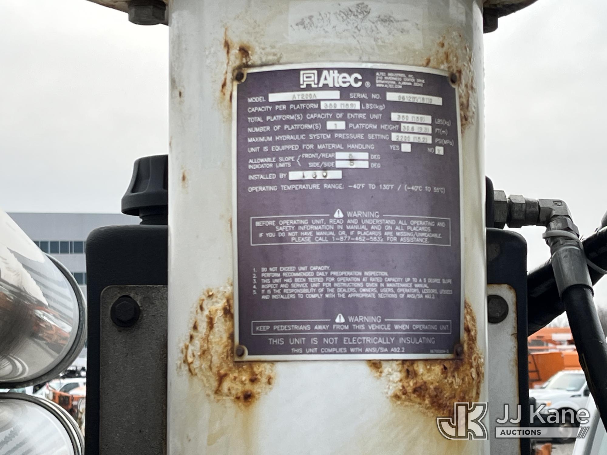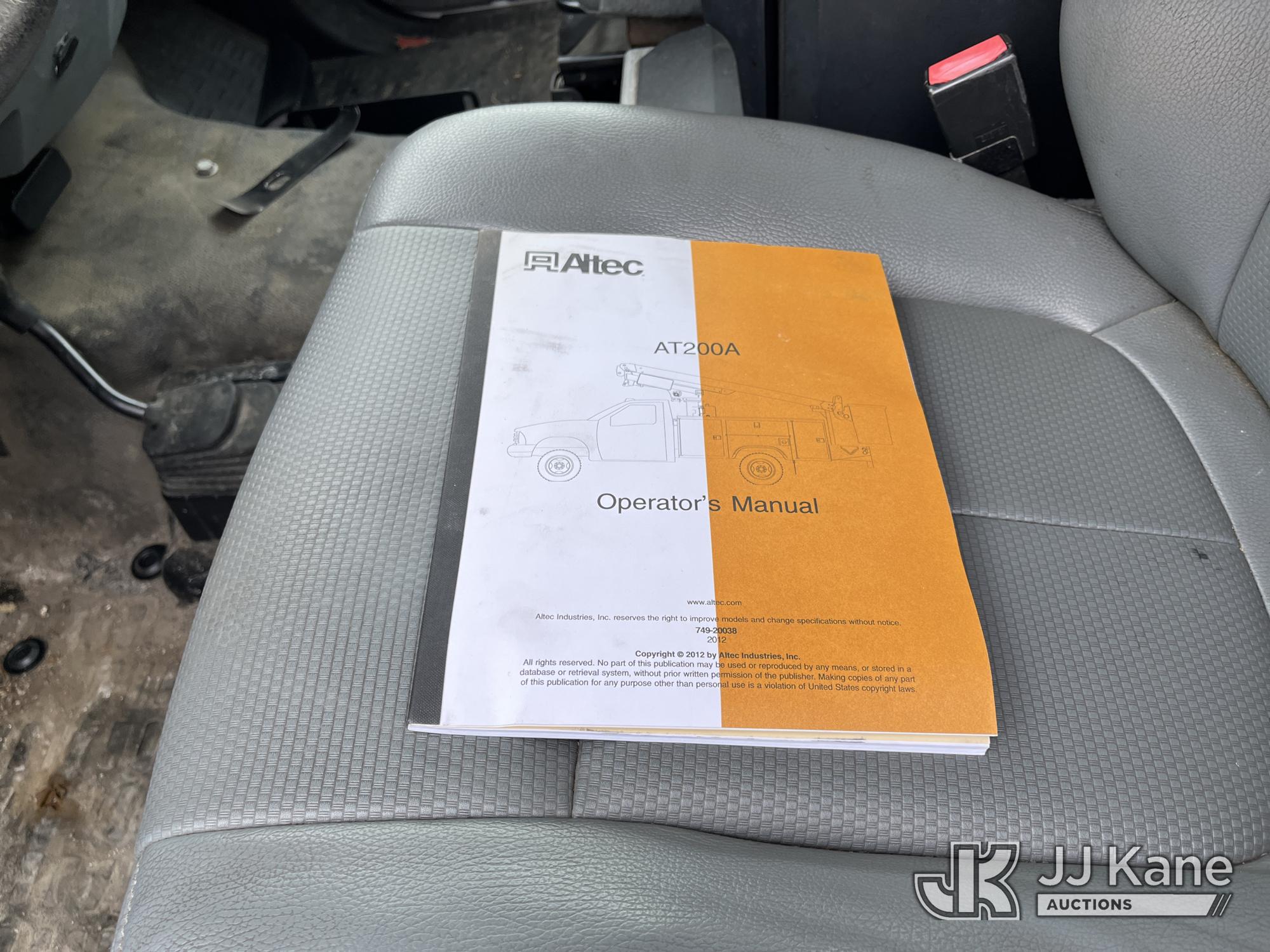 Altec AT200-A, 35 ft, Telescopic Non-Insulated Bucket Truck s/n 0612BV18110, with single-man bucket, mounted behind cab on 2012 Ford F450 4x4 Service Truck, 10-cyl gas, Auto, A/C, (117,541 miles) (Runs & Moves) (Generator Missing, Upper Operation Unknown, Gas Cap & Line Missing, Driver & Passenger Side Mirrors Missing, Body Damage.) This is a Titled Item*