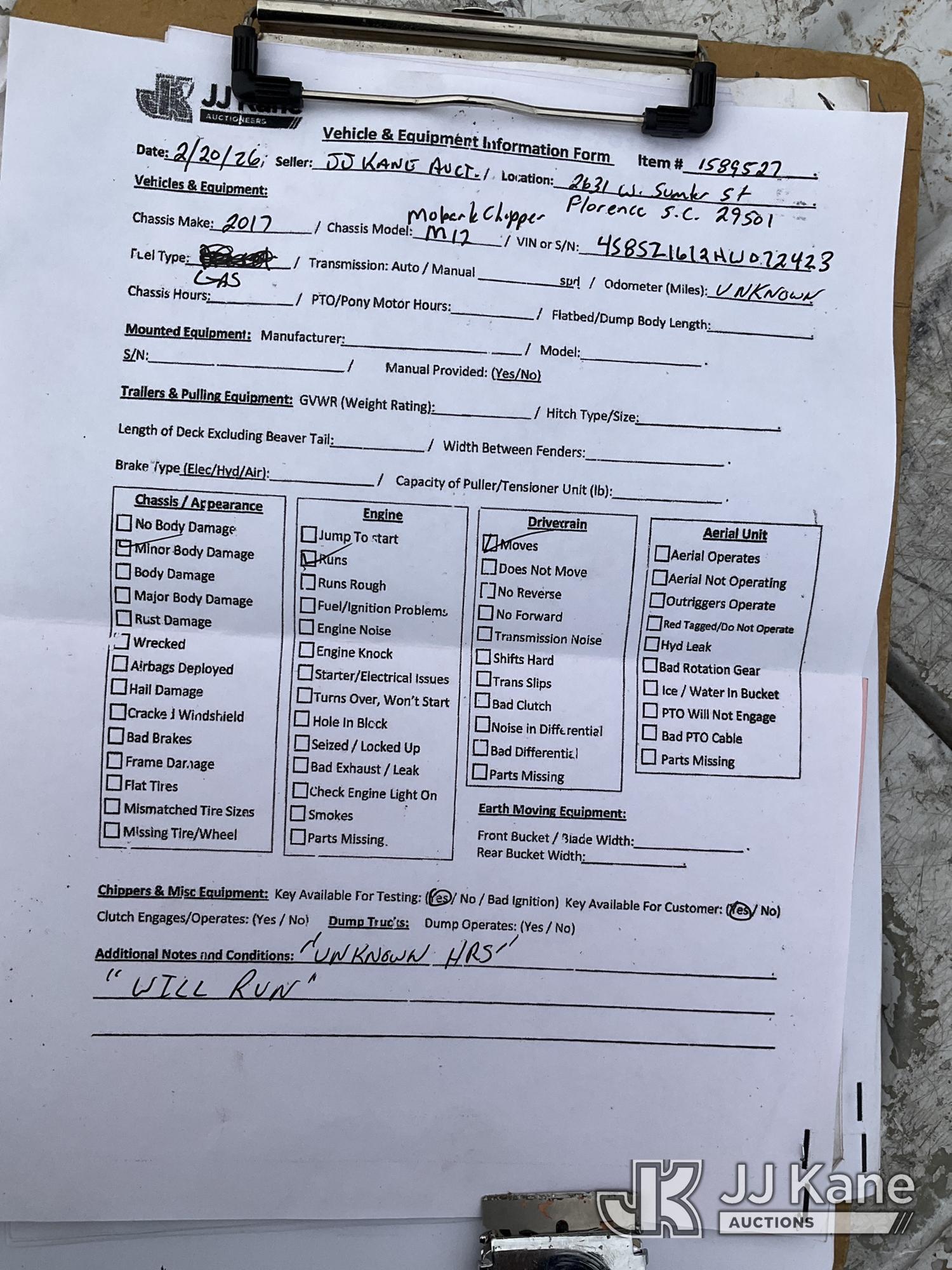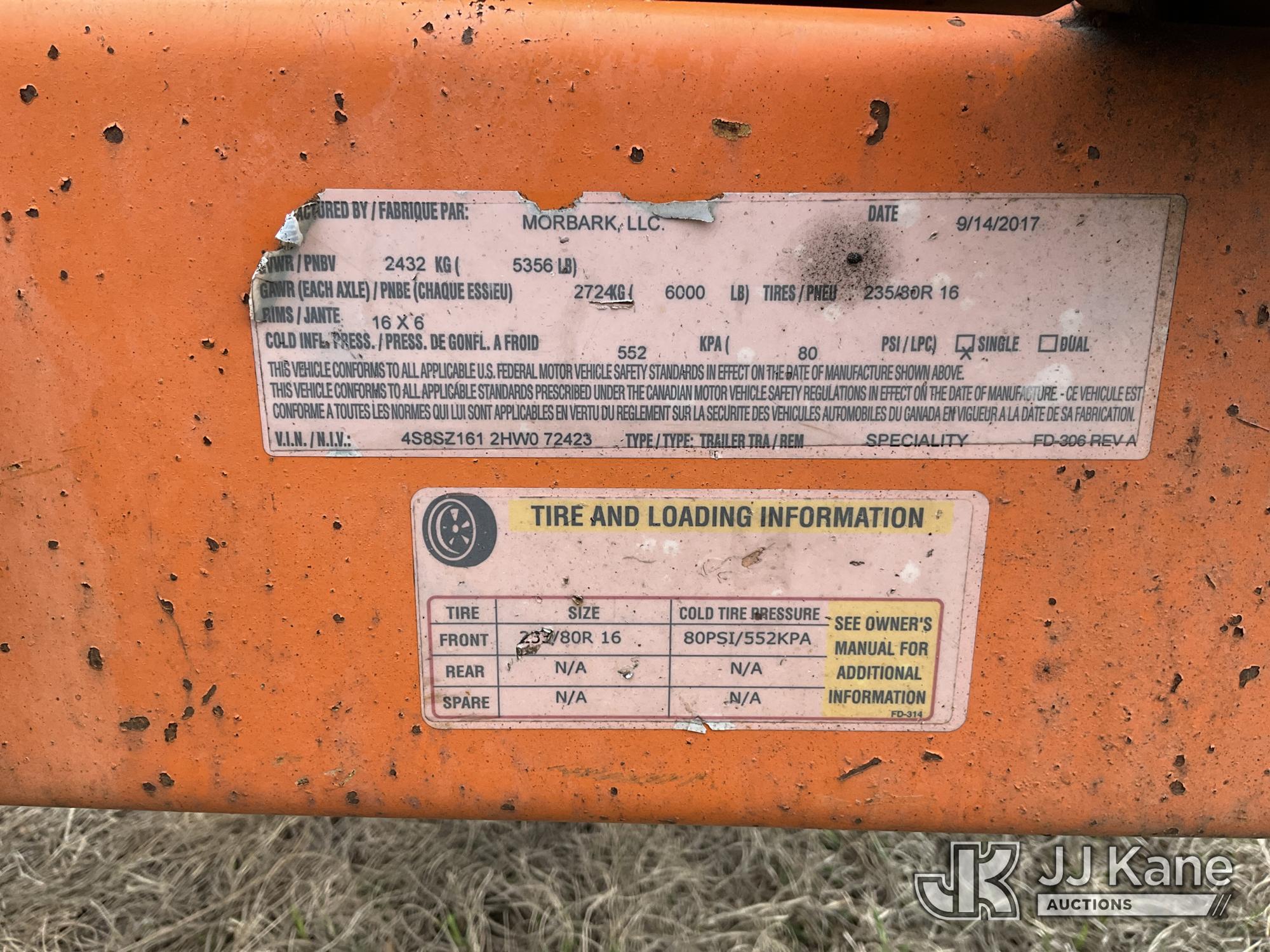 2017 Morbark M12R Chipper (12in Drum), s/n 4S8SZ1612HW072423, 4-cyl gas, trailer mtd. (No Title) (Runs, Hours Unknown) (Seller States: Chipper does start. Blades need replacing along with some mechanical issues)*