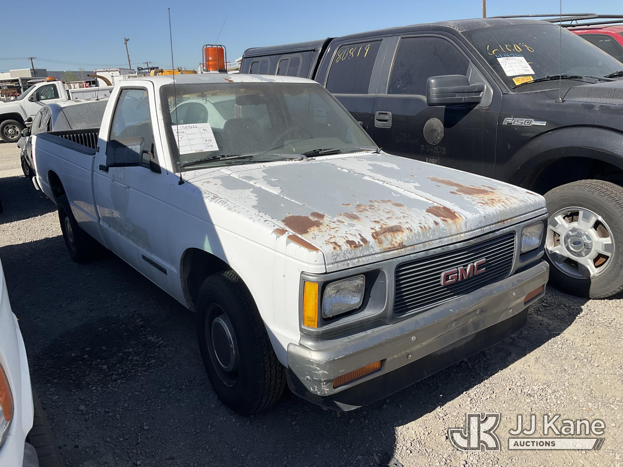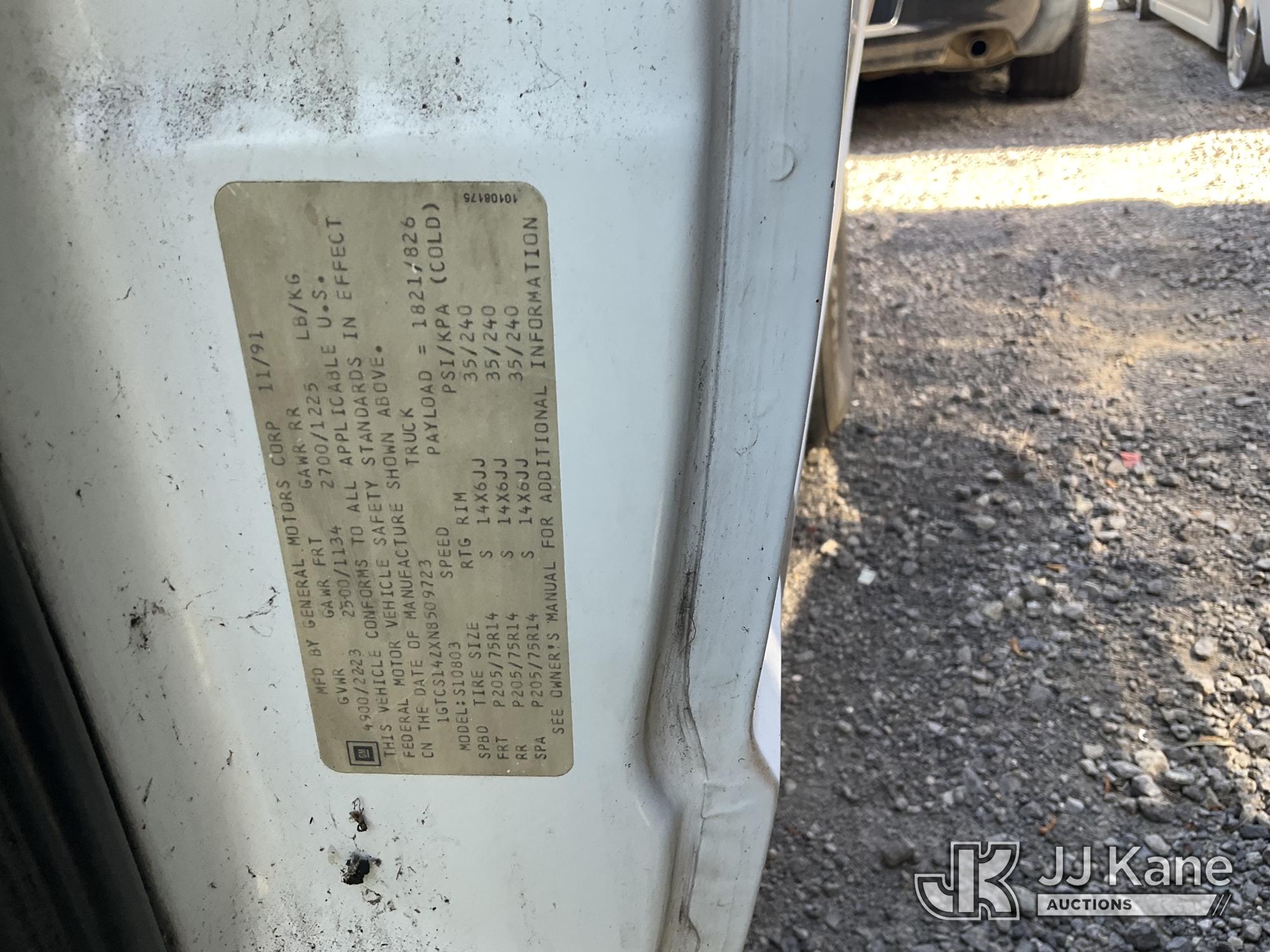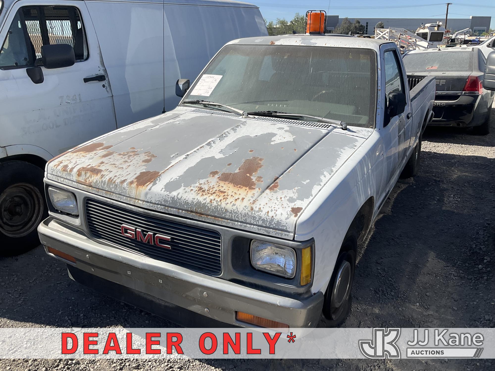 1992 GMC Sonoma Pickup Truck, s/n 1GTCS14ZXN8509723, 4.3L V6 OHV 12V RWD, GAS, Auto, A/C, (Exempt from Odometer Disclosure - Reads 77,830 miles) (Not Running, Conditions Unknown, Rust Damage, Front Tire Damage, Interior Damage, Must Be Towed) (Bidding Restricted to Licensed Vehicle Dealers Only), This is a Titled Item*