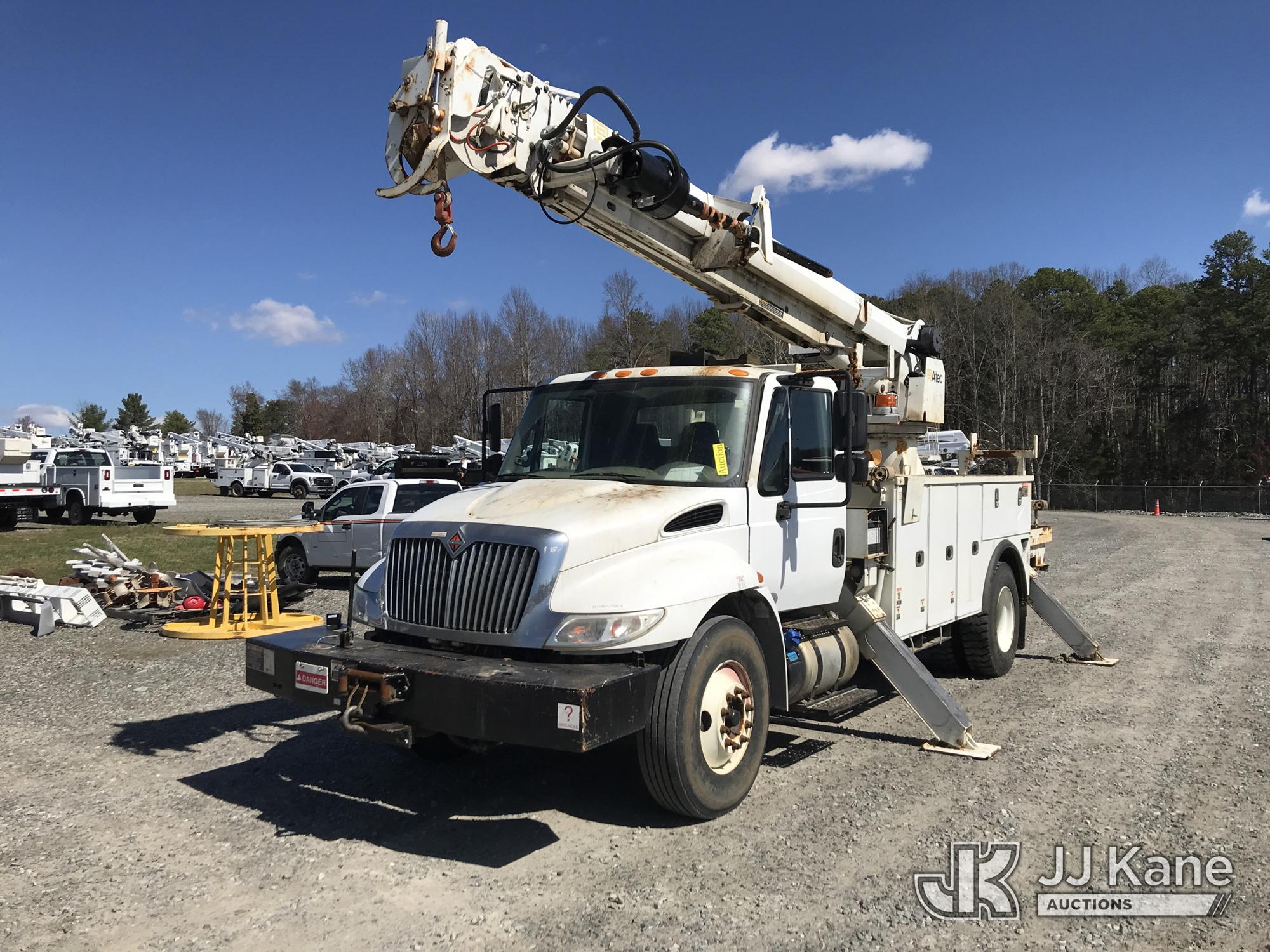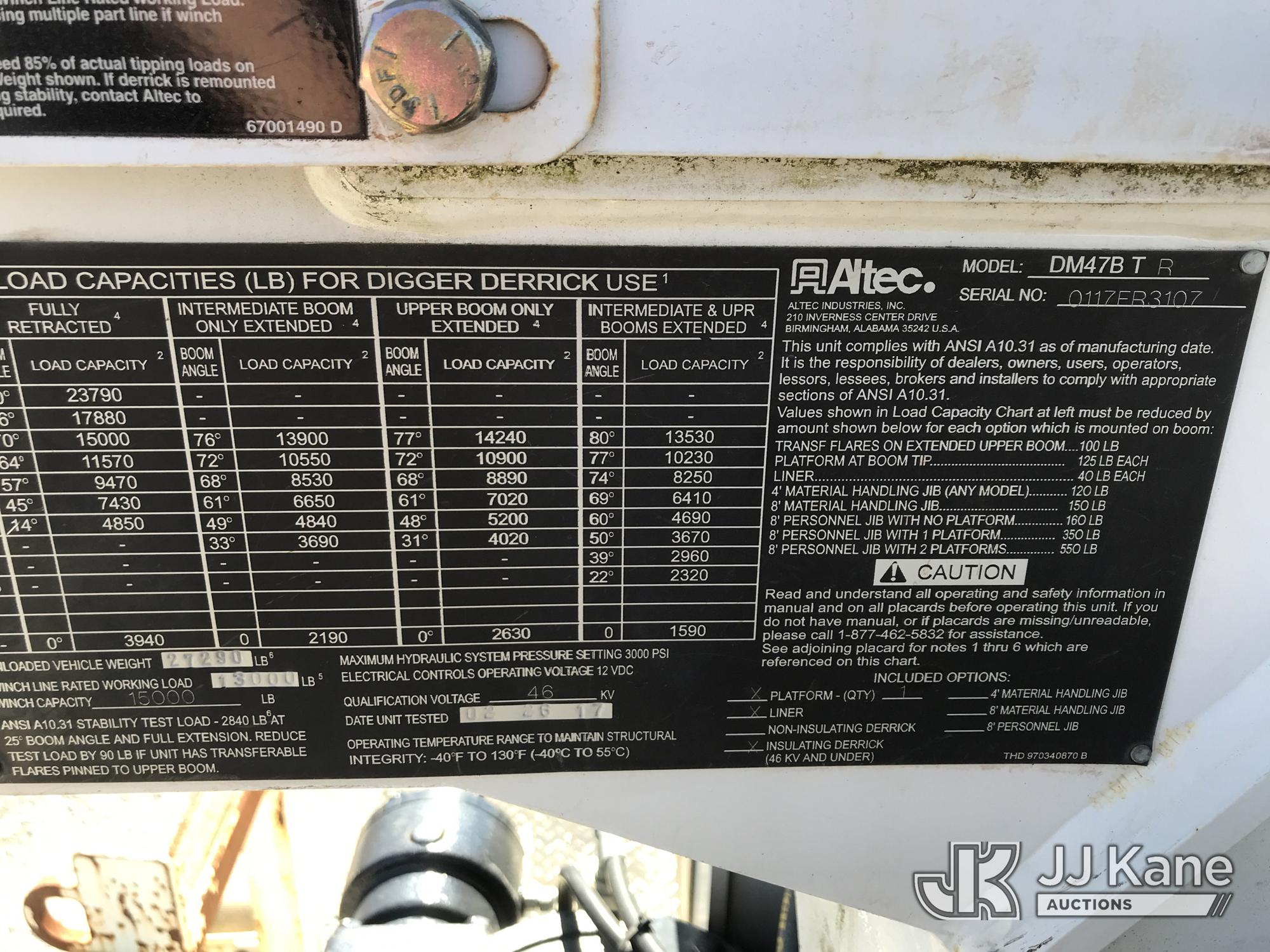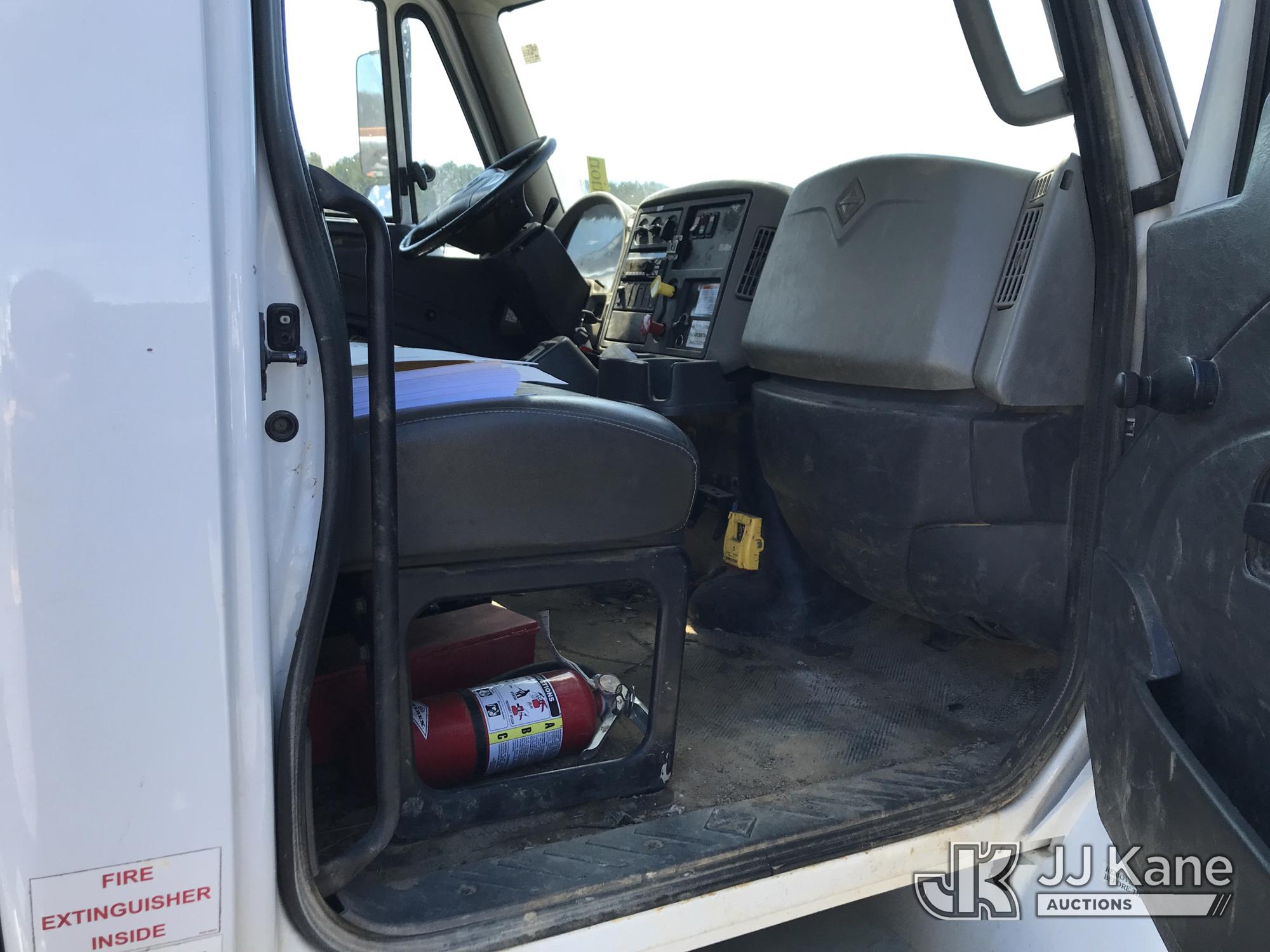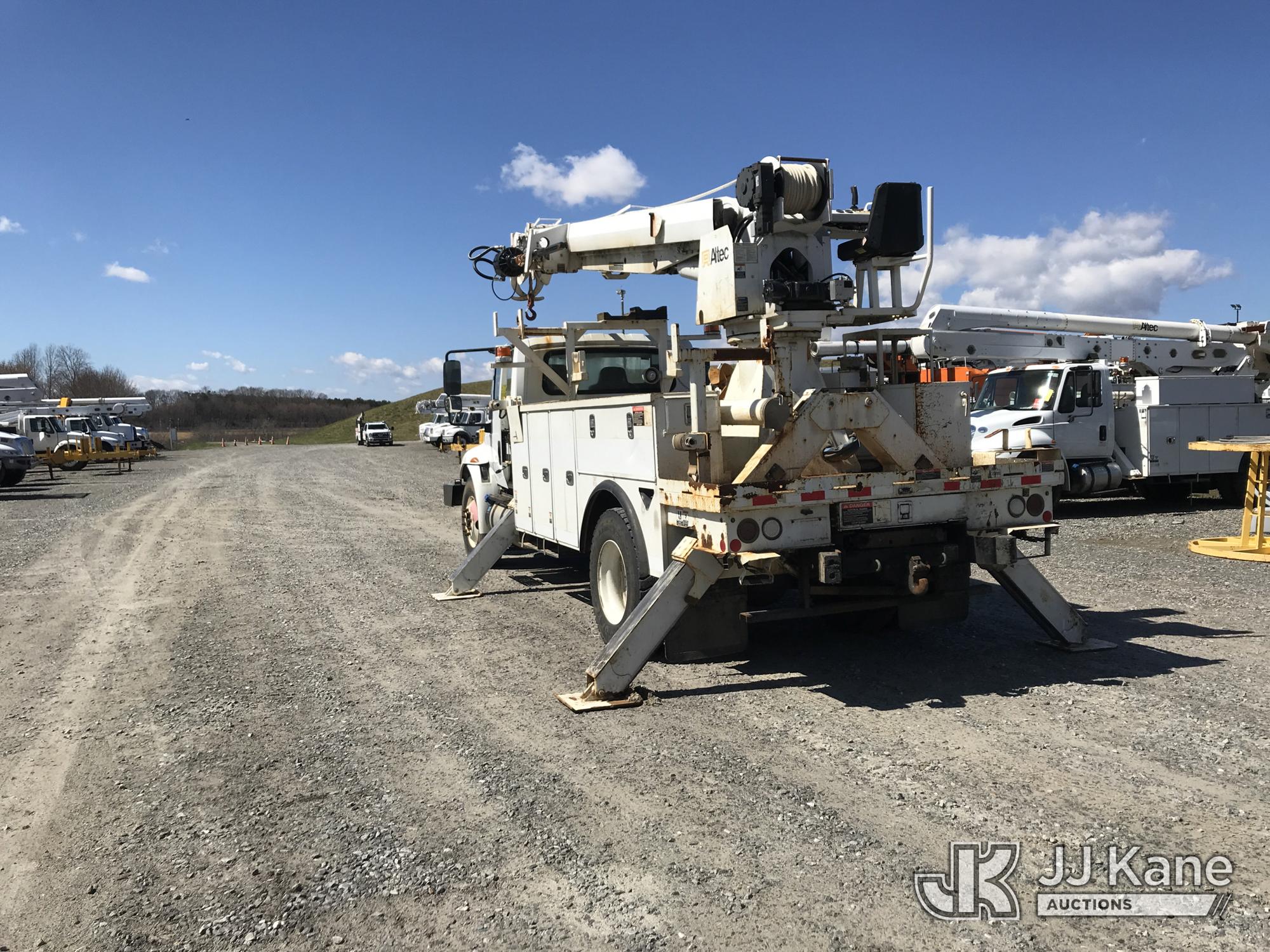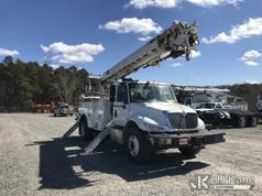 Altec DM47B-TR, 23,790 Lb Digger Derrick s/n 0117FR3107, with 47 ft. sheave height, 3 section hyd boom, 2 spd digger, heel winch, pole guides, upper controls, riding console & 4 hyd outriggers, rear mounted on 2018 International DuraStar 4300 Utility Truck, MaxxForce 10 9.3L 4X2, diesel, Auto, A/C, with front winch, (49,215 miles) (Runs, Moves & Upper Operates) (Jump To Start, Missing Auger, Body Damage) This is a Titled Item*