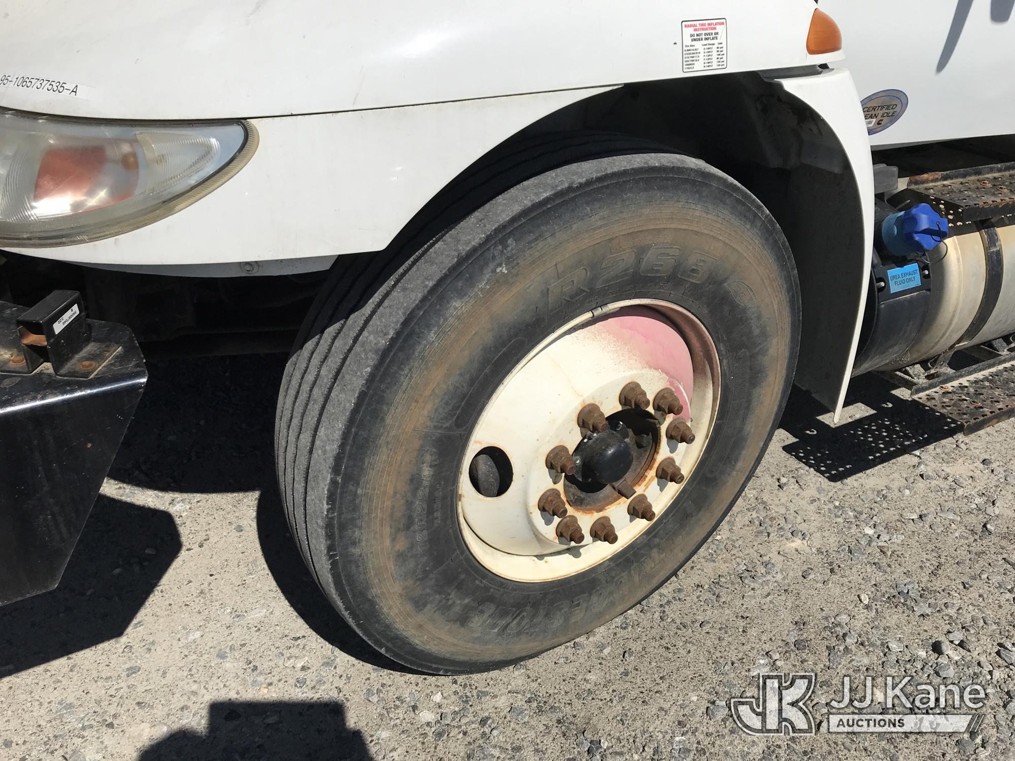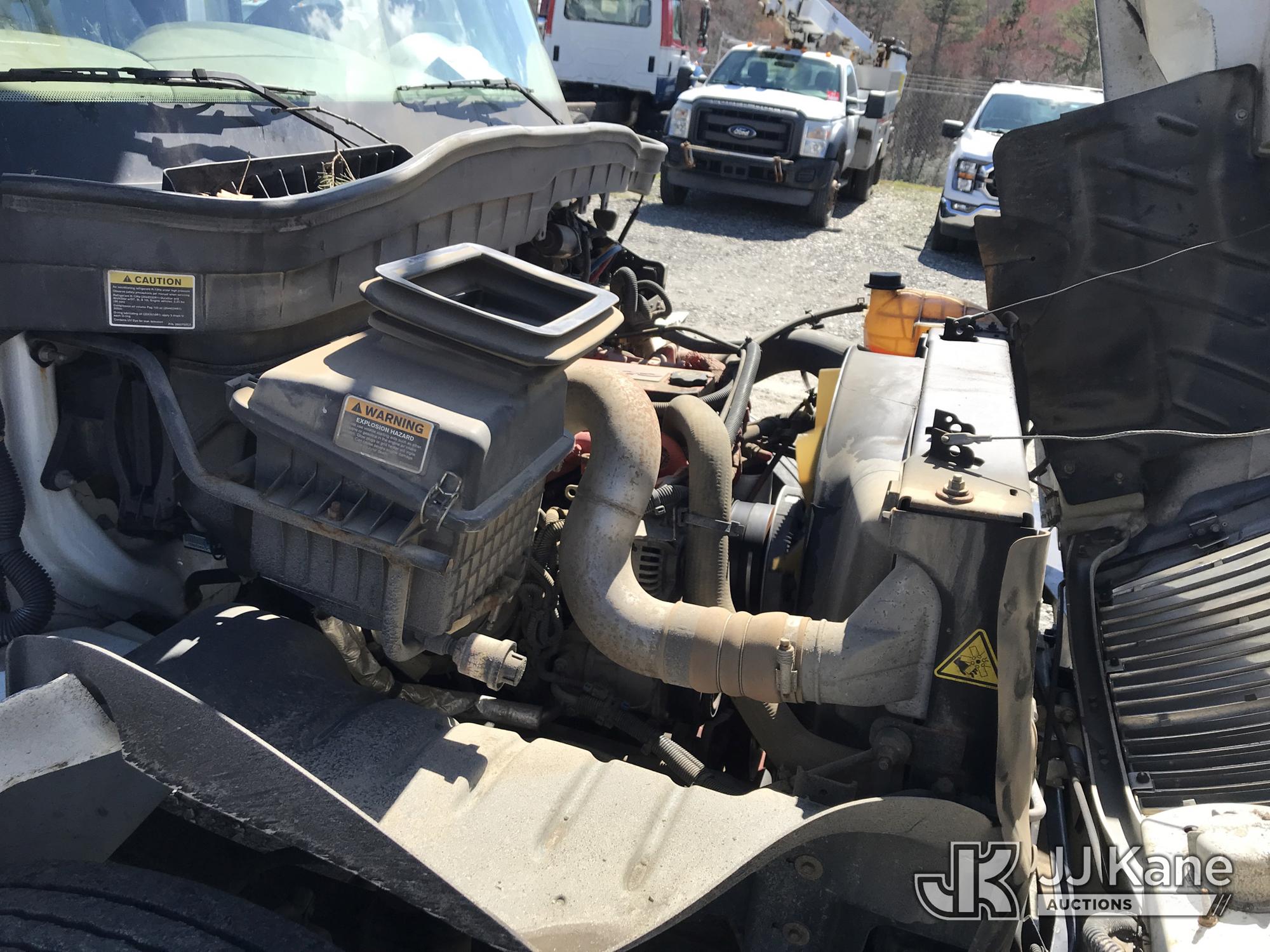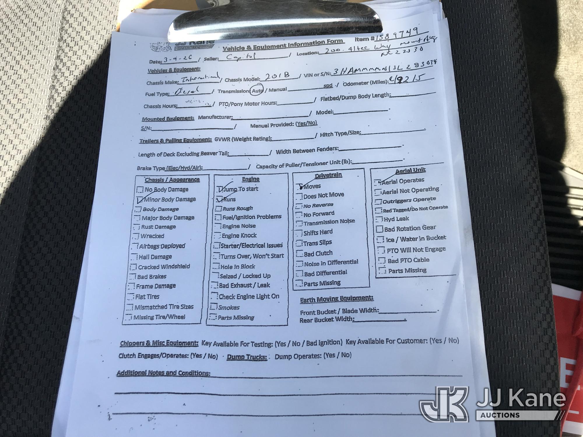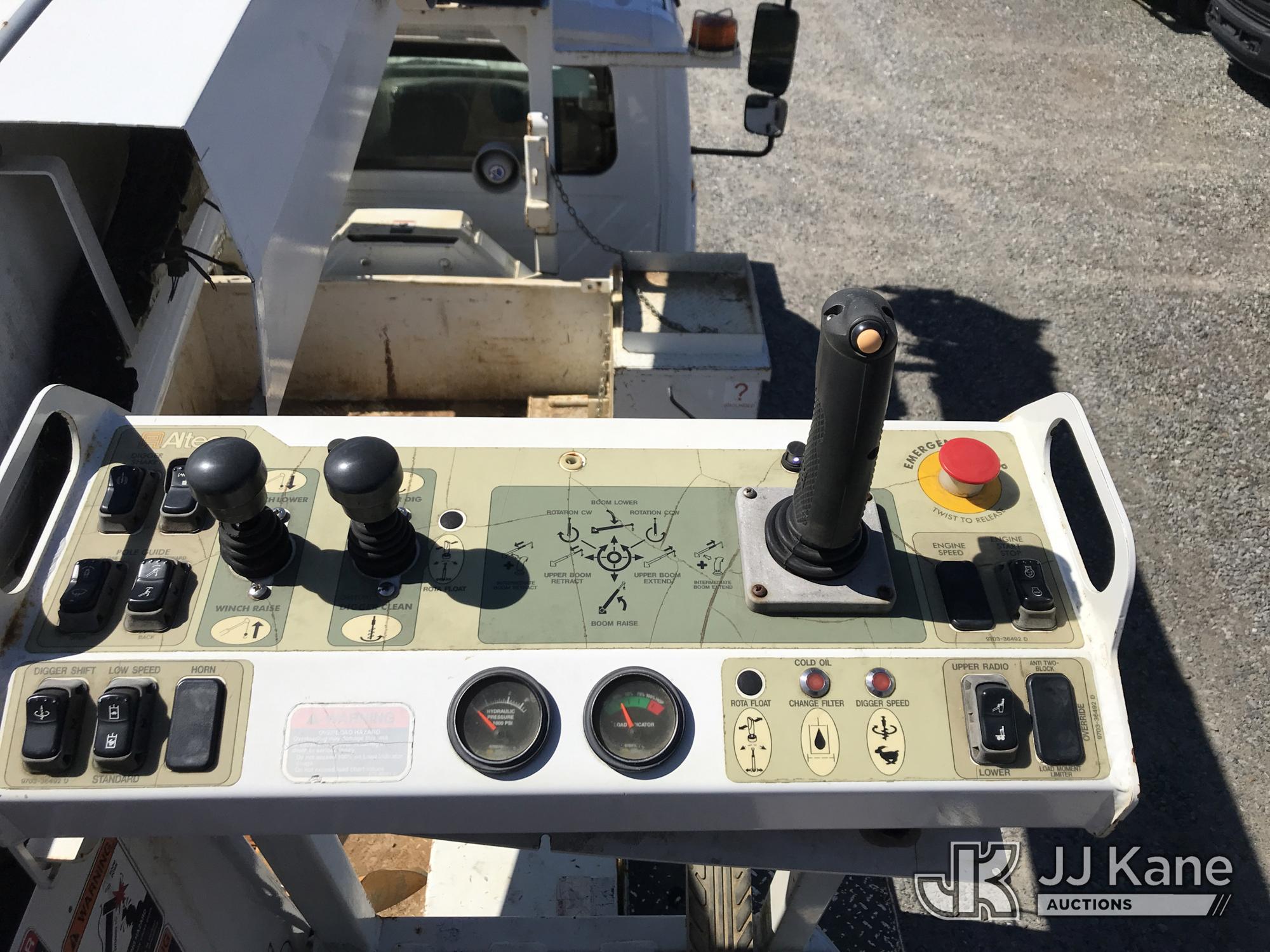 Altec DM47B-TR, 23,790 Lb Digger Derrick s/n 0117FR3107, with 47 ft. sheave height, 3 section hyd boom, 2 spd digger, heel winch, pole guides, upper controls, riding console & 4 hyd outriggers, rear mounted on 2018 International DuraStar 4300 Utility Truck, MaxxForce 10 9.3L 4X2, diesel, Auto, A/C, with front winch, (49,215 miles) (Runs, Moves & Upper Operates) (Jump To Start, Missing Auger, Body Damage) This is a Titled Item*