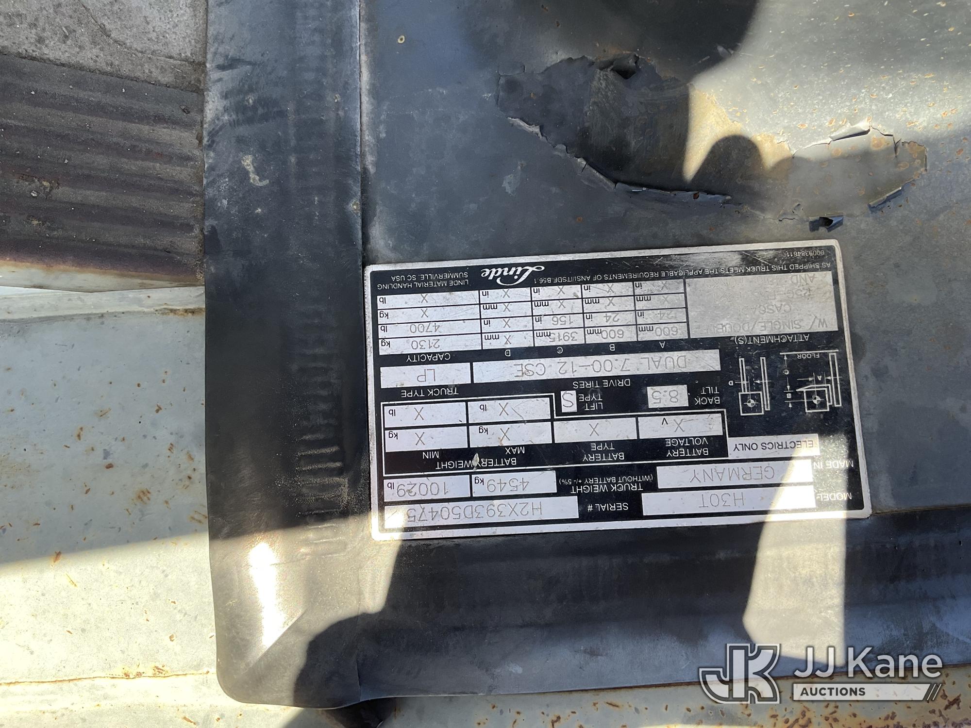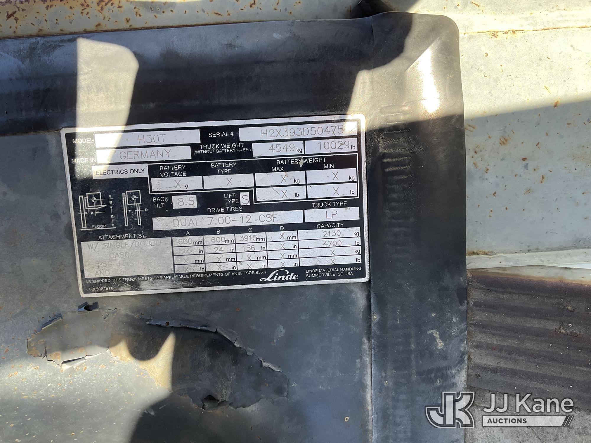 2013 Lindsey H30T Solid Tired Forklift, s/n H2X393D50475, 4-cyl, LPG, Shuttle, with 4700lbs capacity, 156in fork height, (Not Running, Condition Unknown)*
