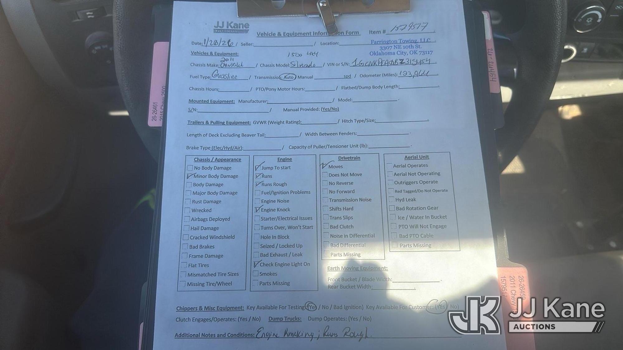 2011 Chevrolet Silverado 1500 Pickup Truck, 6-cyl gas, 4wd, Auto, A/C, (123,964 miles) (Runs & Moves) (Jump to Start, Runs Rough, Engine Knock, Bad Lifter, Check Engine Light On & Traction Control Light On, Minor Body Damage) This is a Titled Item*
