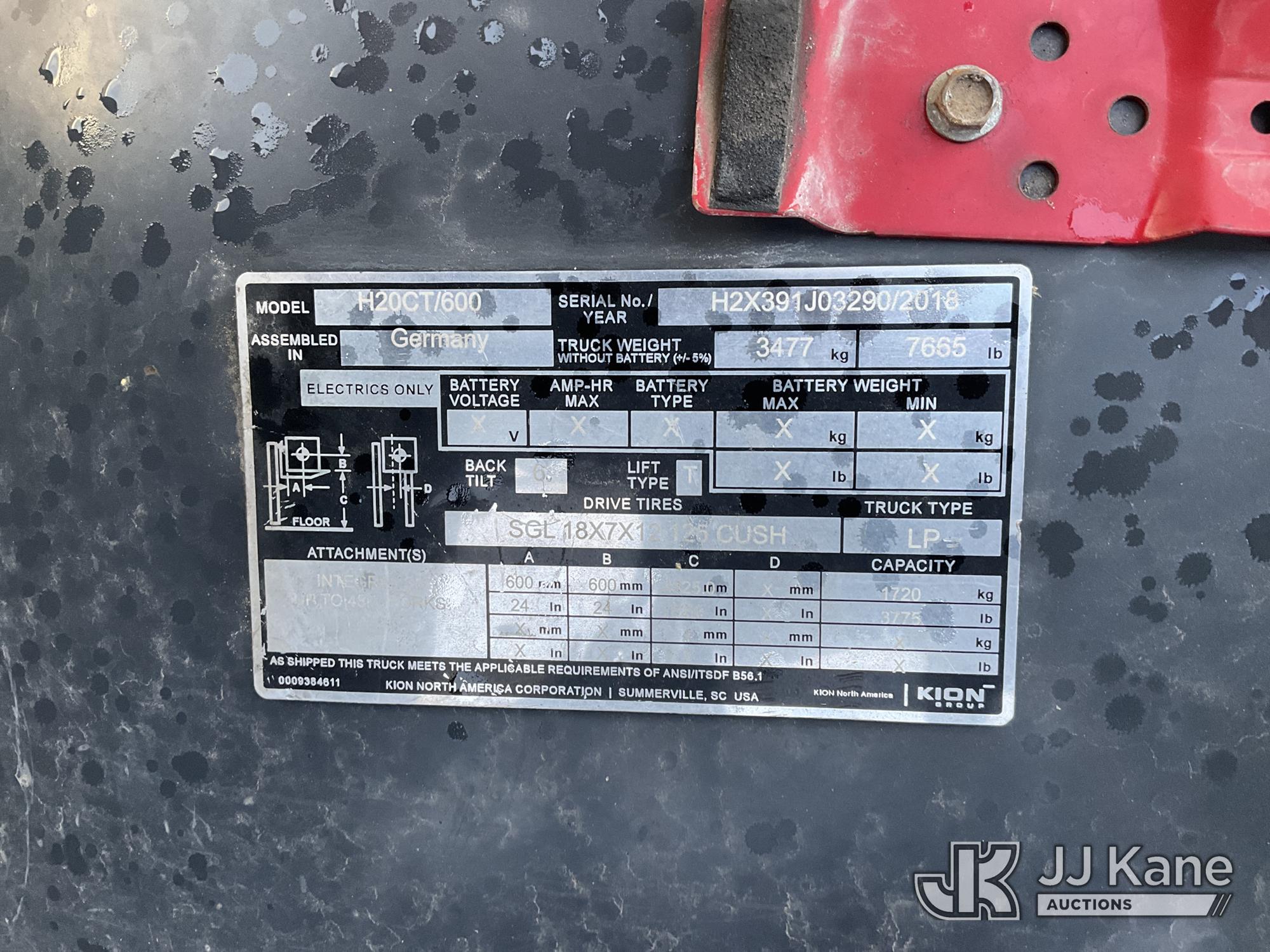 2018 Linde H20CT/600 Cushion Tired Forklift, s/n H2X391J03290, LPG, Shuttle, with 3,775 lb. capacity, 3-stage mast, side shift, For Length: 2 ft 6 inch, (Not Running, Conditions Unknown, No Tank) (Hours Unknown) (Reads 1,976 hours)*