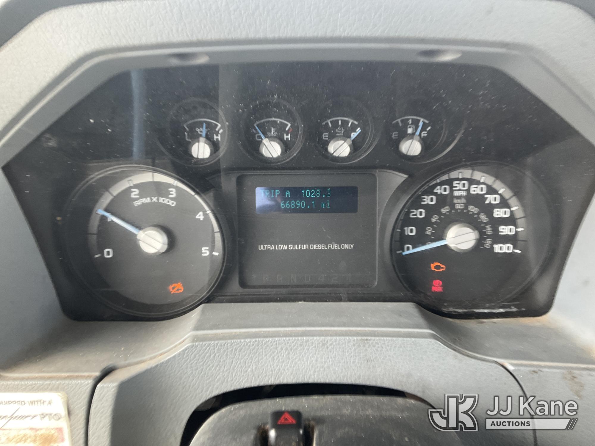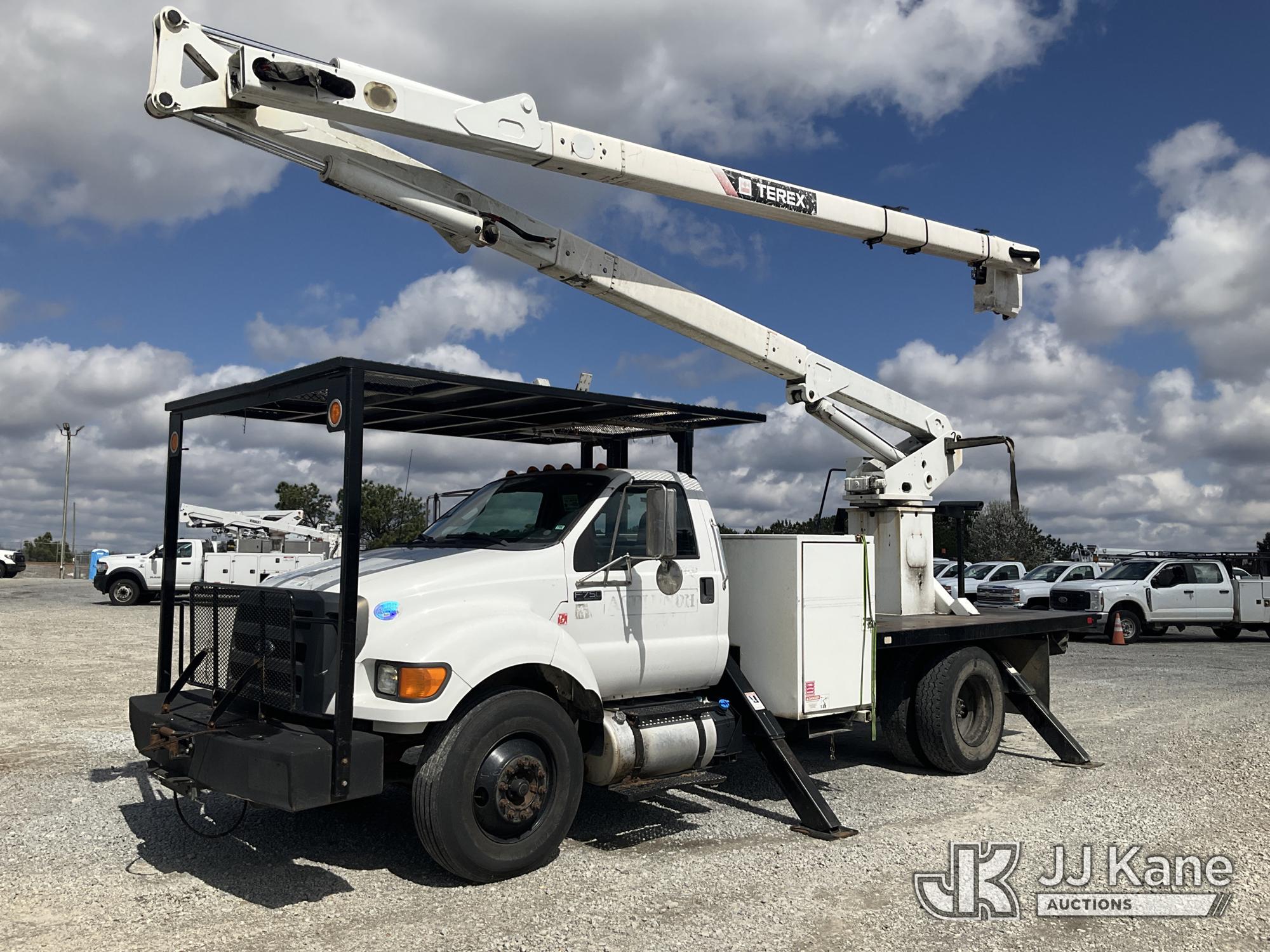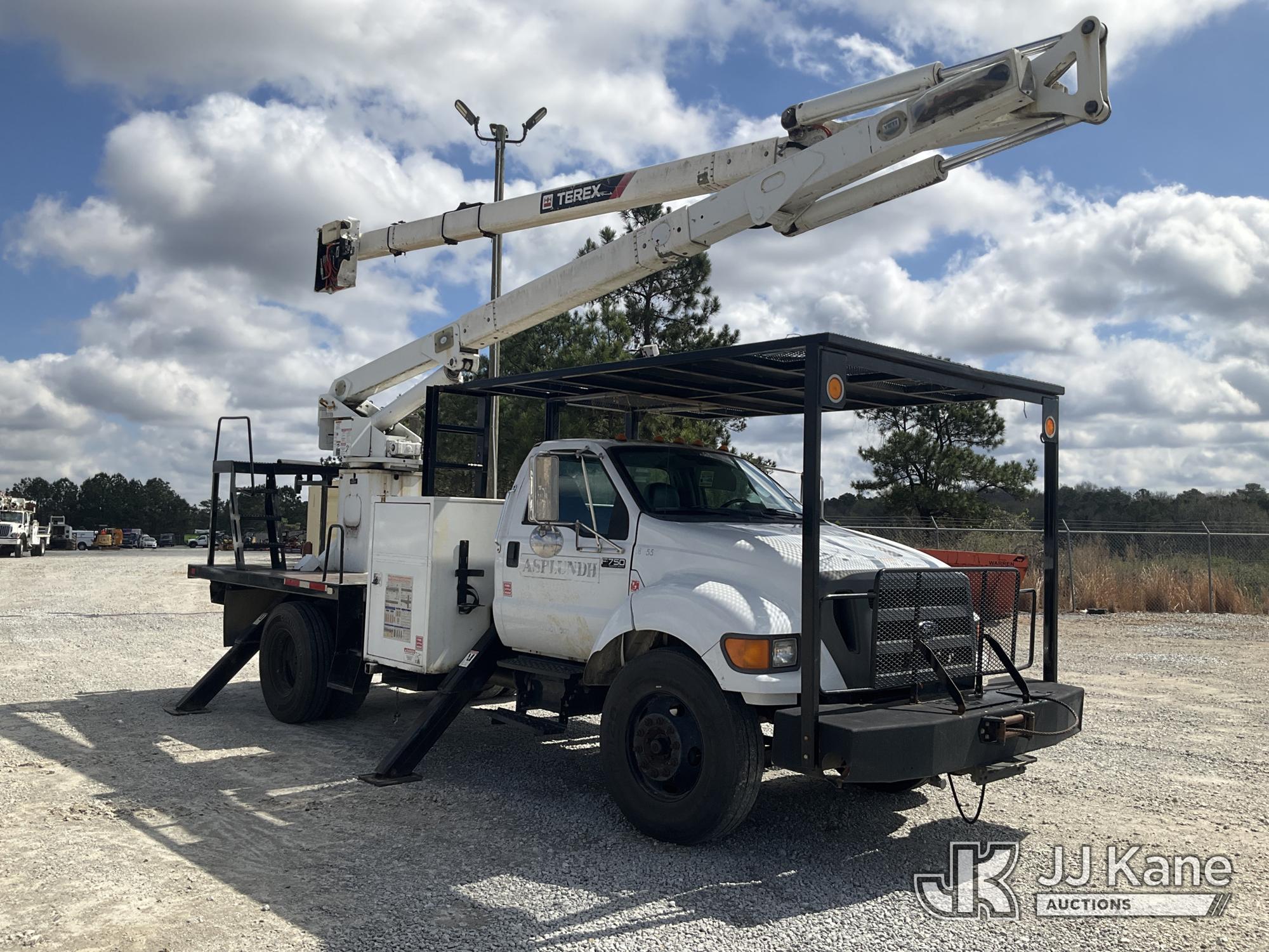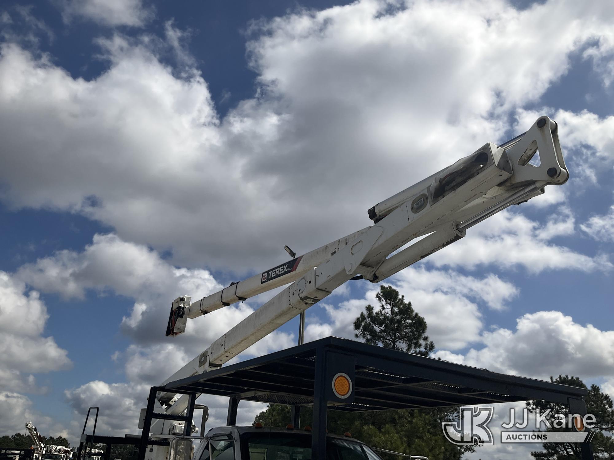 Terex/HiRanger XT60, 350 Lb 65 ft, Articulating Material Handling Bucket Truck s/n 2140853137, with single-man bucket & 4 hyd outriggers, rear mounted on 2015 Ford F-750 Regular Cab 2WD DRW Flatbed/Utility Truck, 6.7L L6 DIESEL 4X2, DIESEL, 6-spd, A/C, with Front winch , (66,890 miles) Platform Missing (Bucket) (Runs, Moves & Upper Operates) (Check Engine Light On, Missing Bucket) This is a Titled Item*
