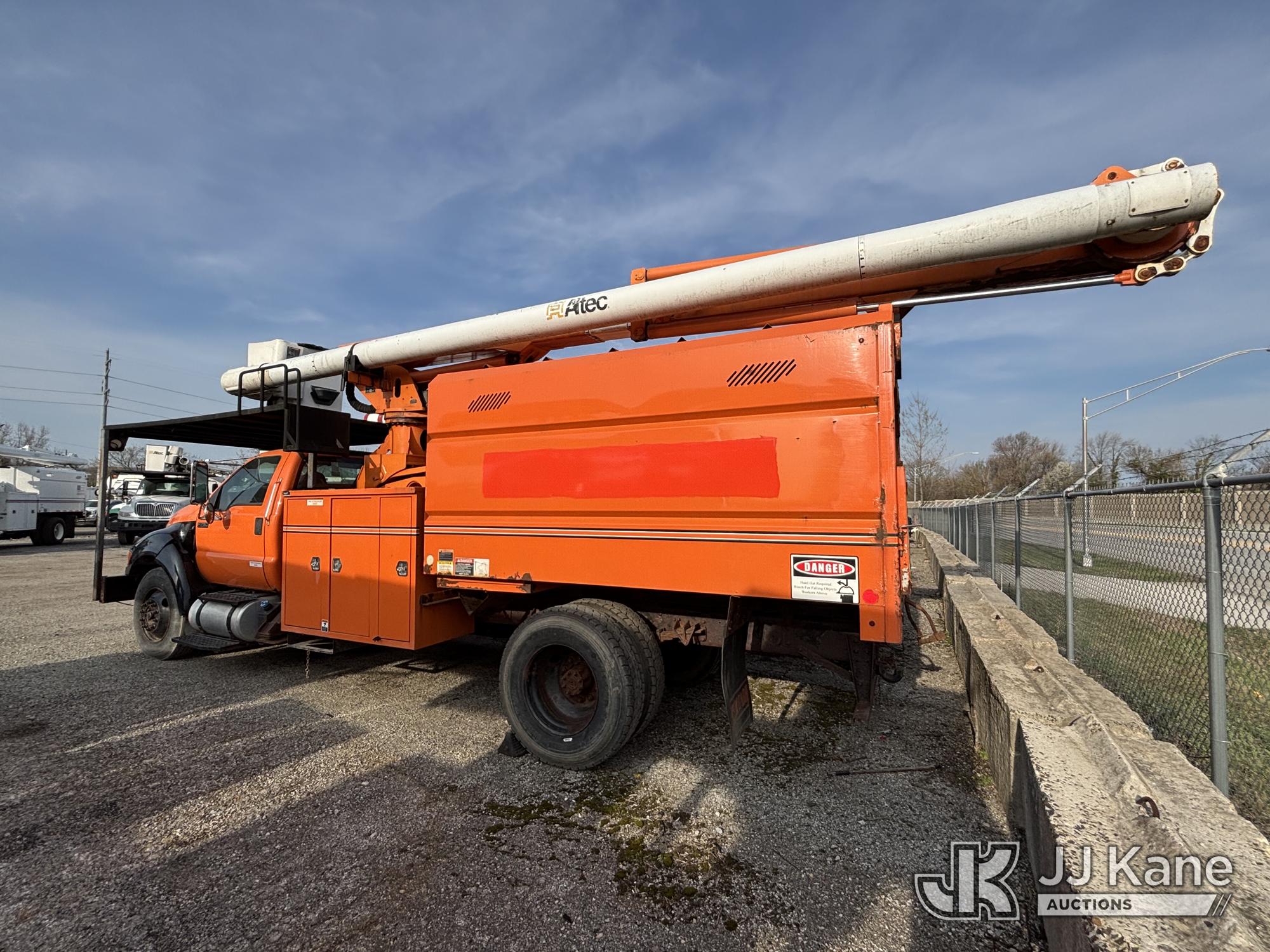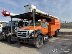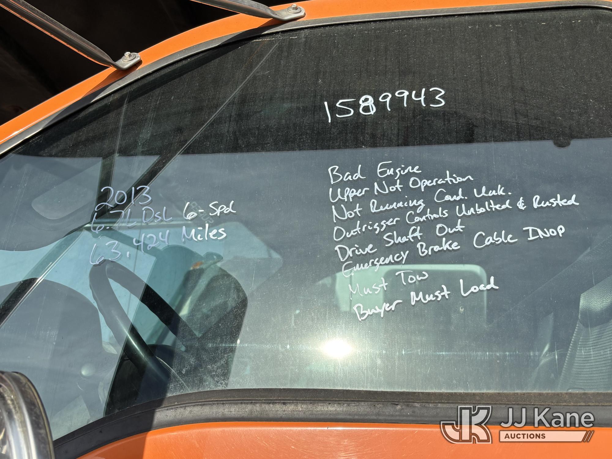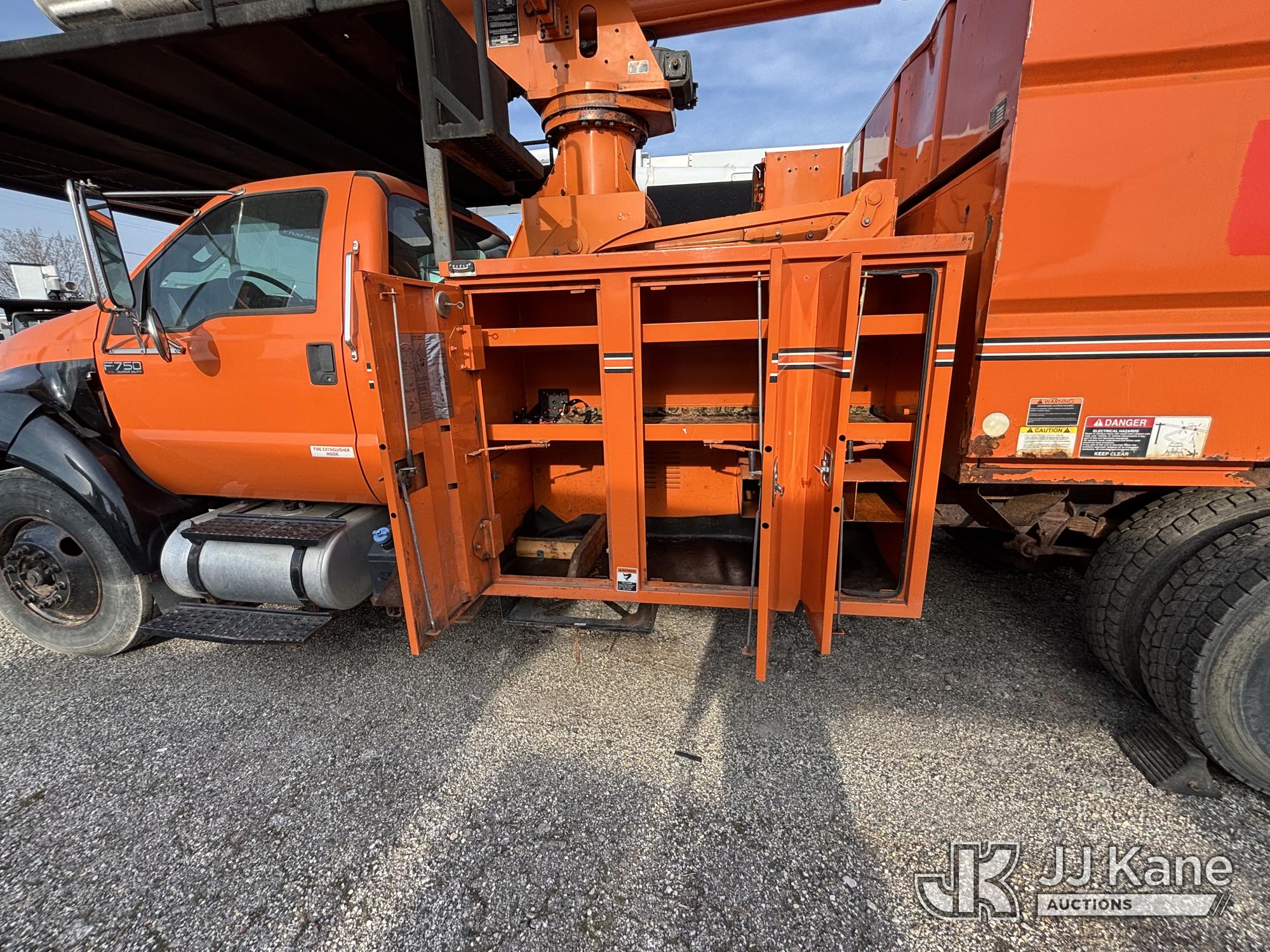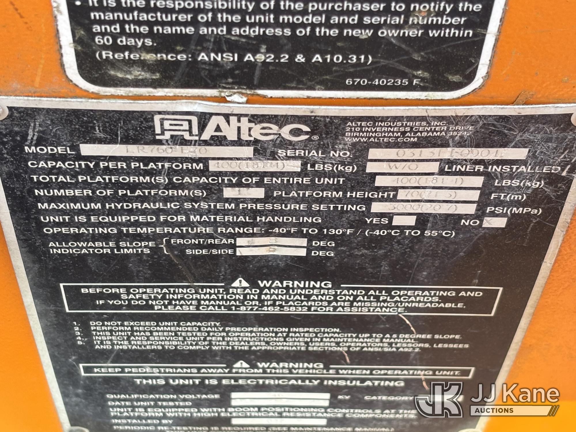 Altec LR760-E70, 75 ft, Over-Center Elevator Bucket Truck s/n 0313FF0904, with single-man bucket & 4 outriggers, mounted behind cab on 2013 Ford F750 Chipper Dump Truck, 6.7L diesel, 6-spd, with 11 ft body, (63,424 miles) (The manufacturer has notified JJ Kane that this equipment is subject to an open recall. CSN 672 LRV/LR7 Leveling Yoke Inspection The equipment should not be operated until this is addressed. Buyer is responsible for reviewing the recall notice and contacting the manufacturer to schedule the recommended corrective actions. Associated costs may be covered by the manufacturer in some cases. Bad Engine, Not Running, Upper Not Operating Condition Unknown, Out Rigger Controls Unbolted & Rusted, Drive Shaft Out, Emergency Brake Cable INOP, Must Tow Buyer Must Load) This is a Titled Item*