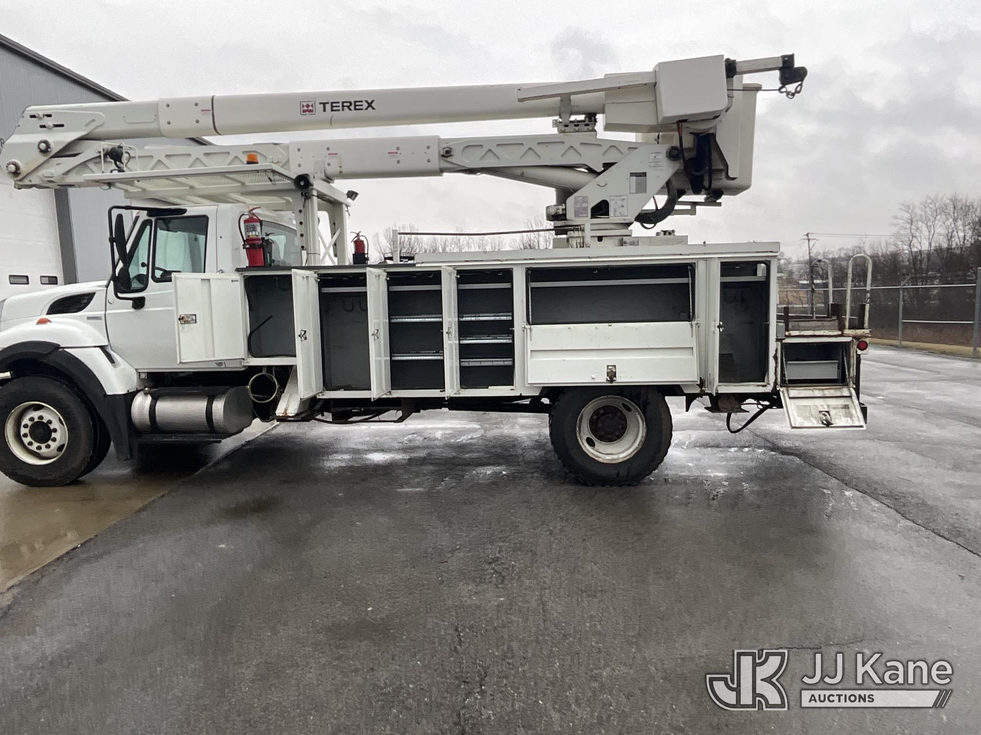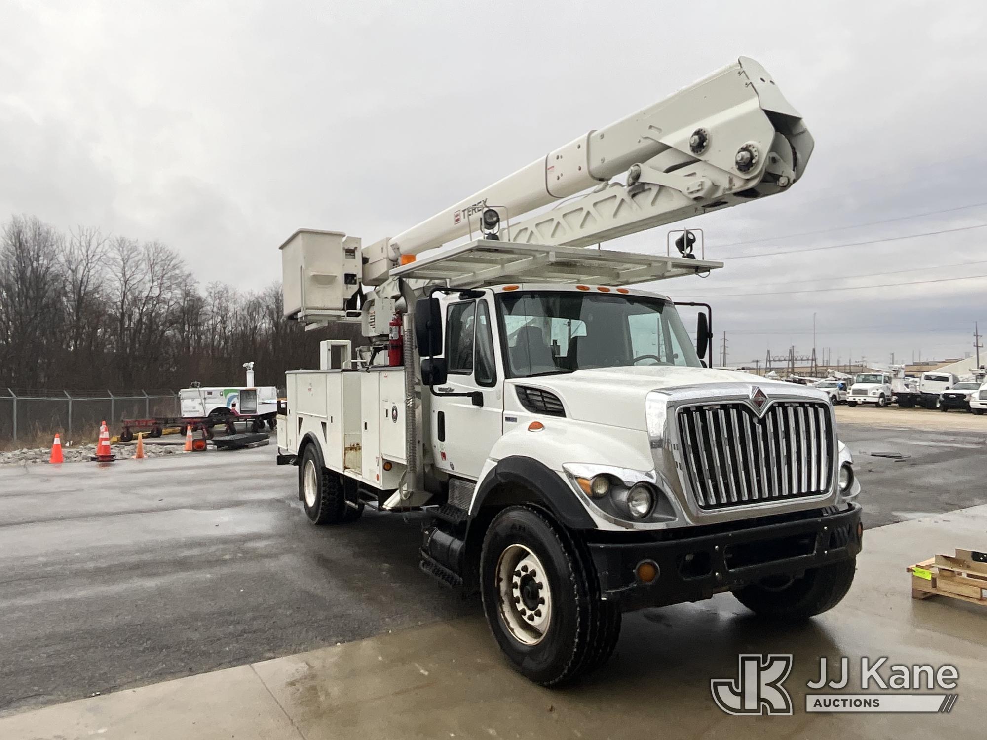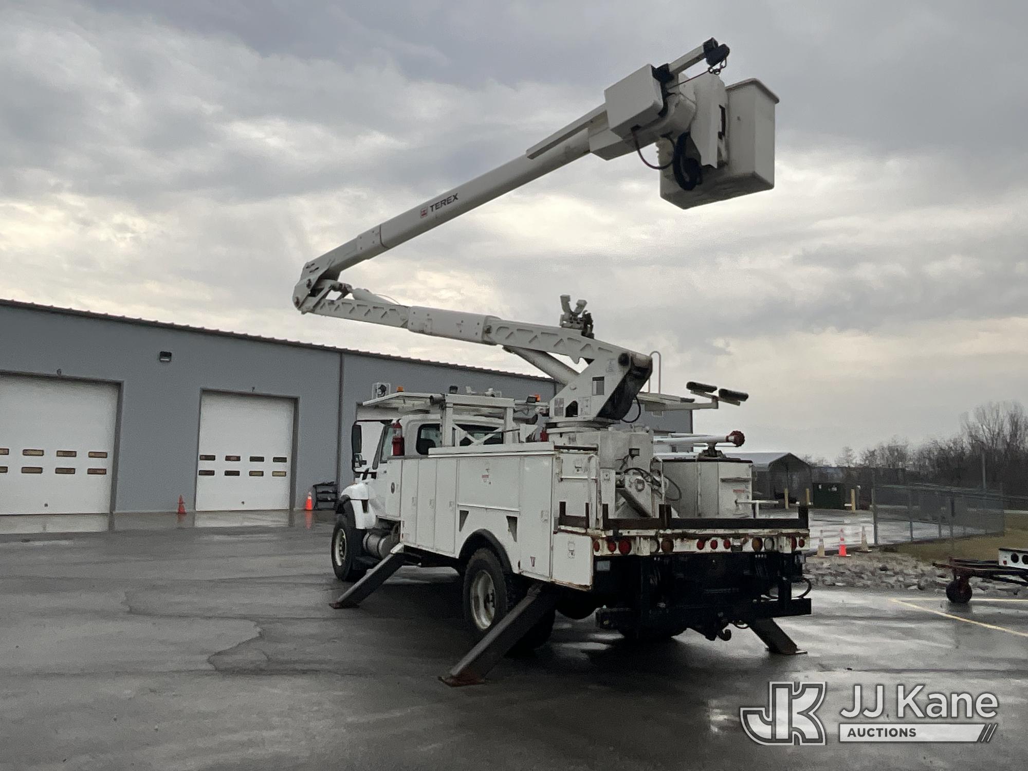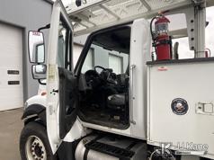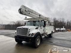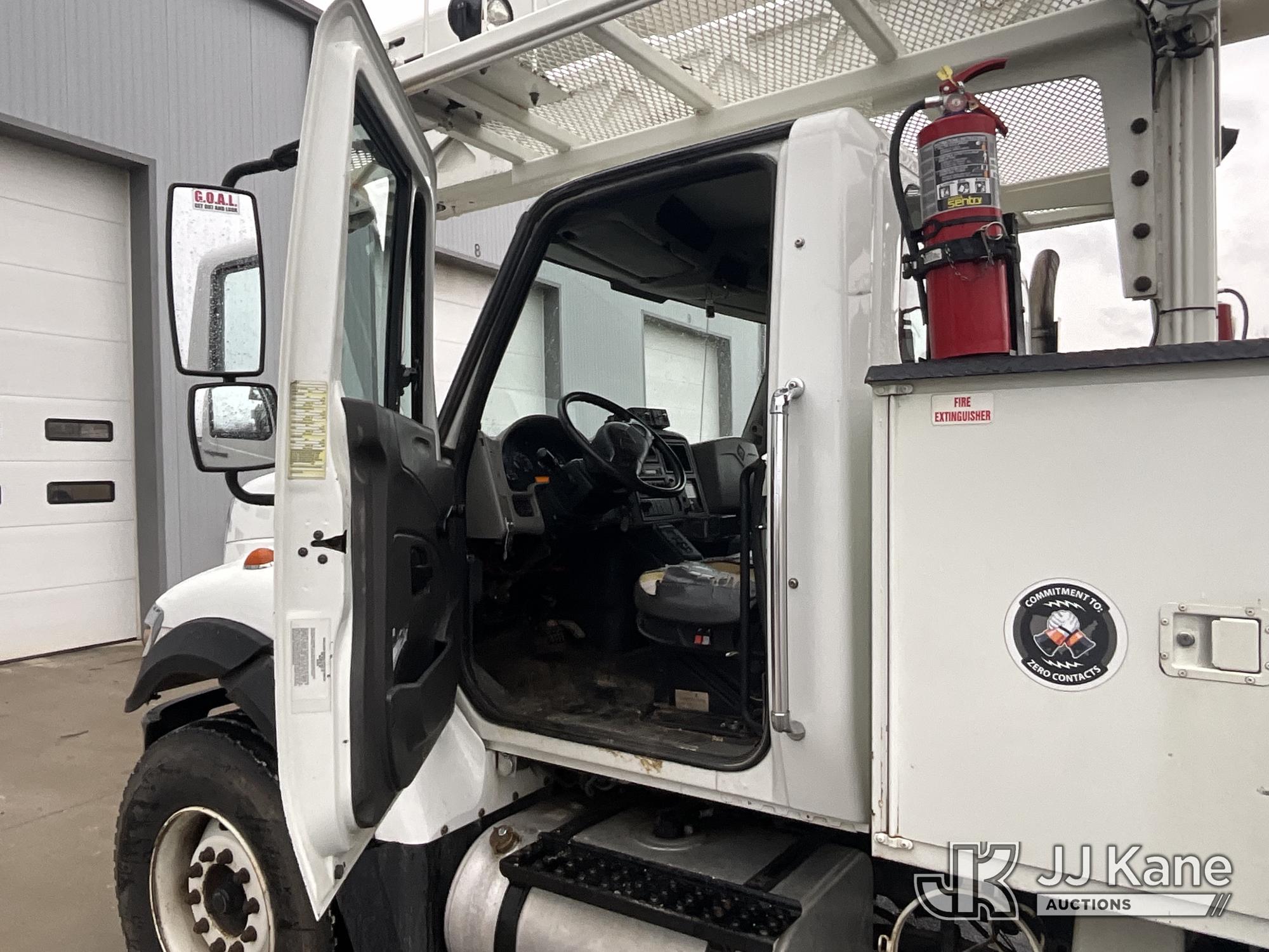 HiRanger HRX-52, 57 ft, Material Handling Bucket Truck s/n 2100742437, with two-man bucket & 4 hyd outriggers, rear mounted on 2011 International 7400 Utility Truck, 9.3L L6 DIESEL 4X2, Auto, A/C, (259,749 miles) (Runs, Moves, & Upper Operates, PTO Operates Intermittently, Missing Battery Box Cover, Bent Curbside Step) This is a Titled Item*