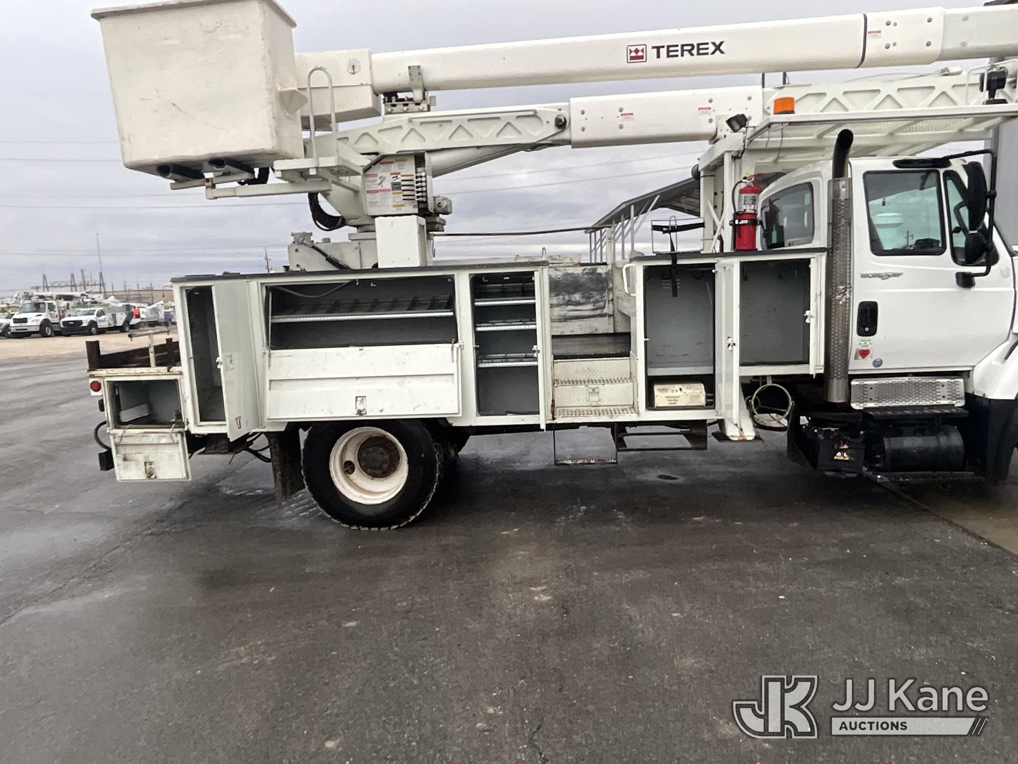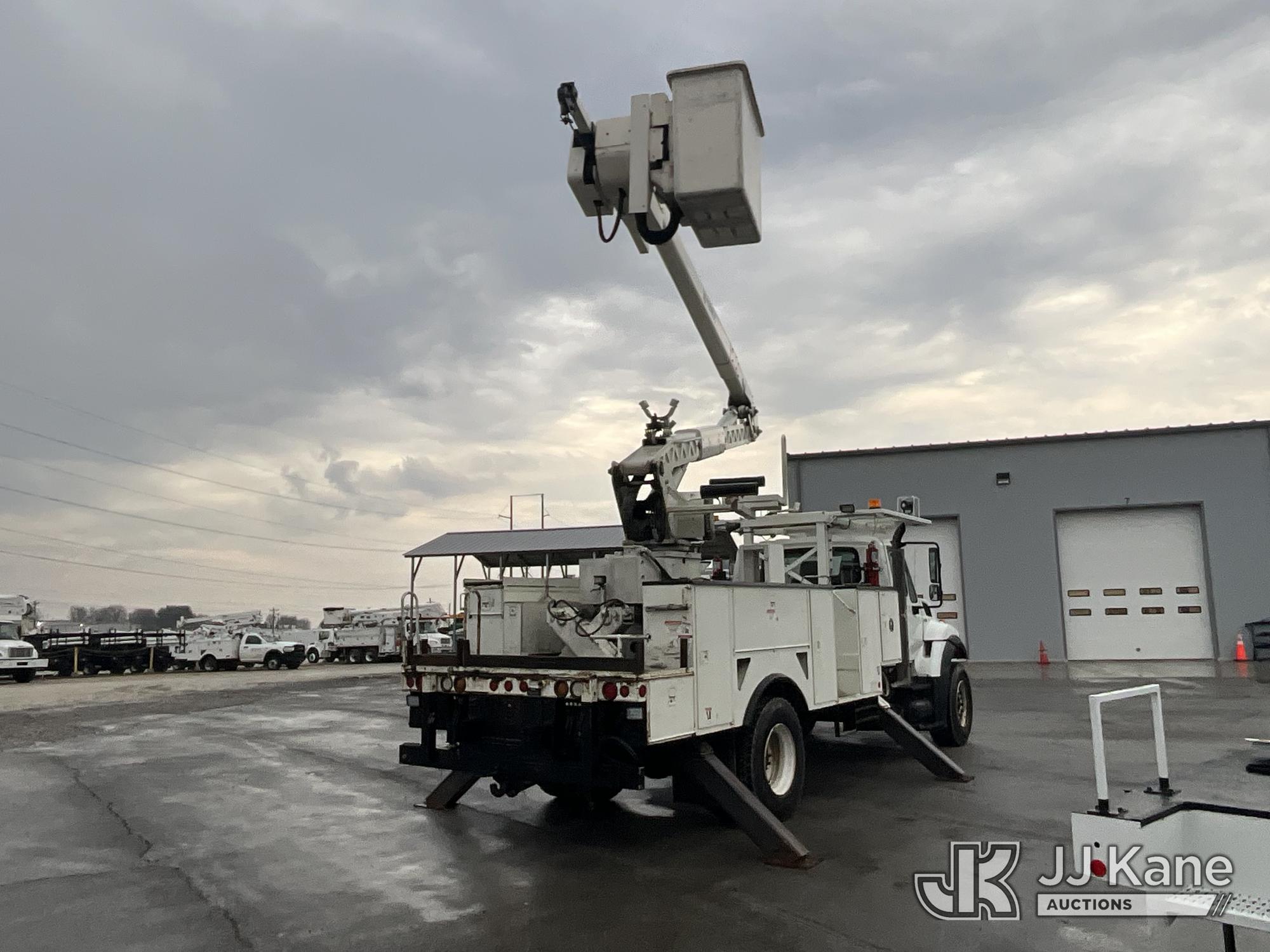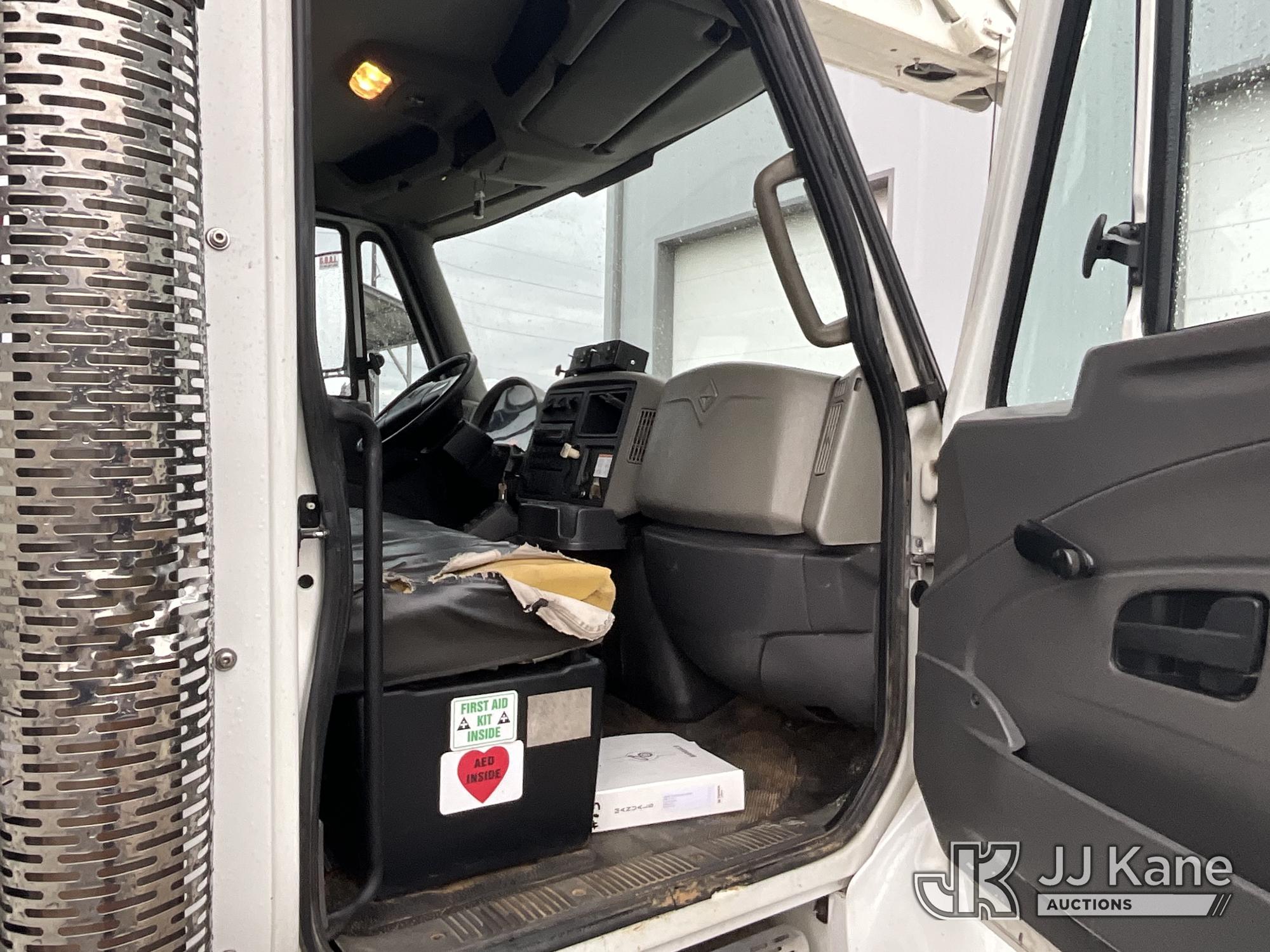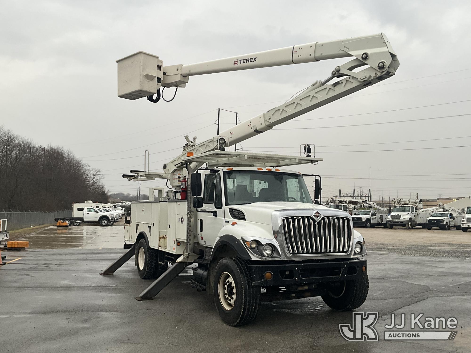 HiRanger HRX-52, 57 ft, Material Handling Bucket Truck s/n 2100742437, with two-man bucket & 4 hyd outriggers, rear mounted on 2011 International 7400 Utility Truck, 9.3L L6 DIESEL 4X2, Auto, A/C, (259,749 miles) (Runs, Moves, & Upper Operates, PTO Operates Intermittently, Missing Battery Box Cover, Bent Curbside Step) This is a Titled Item*