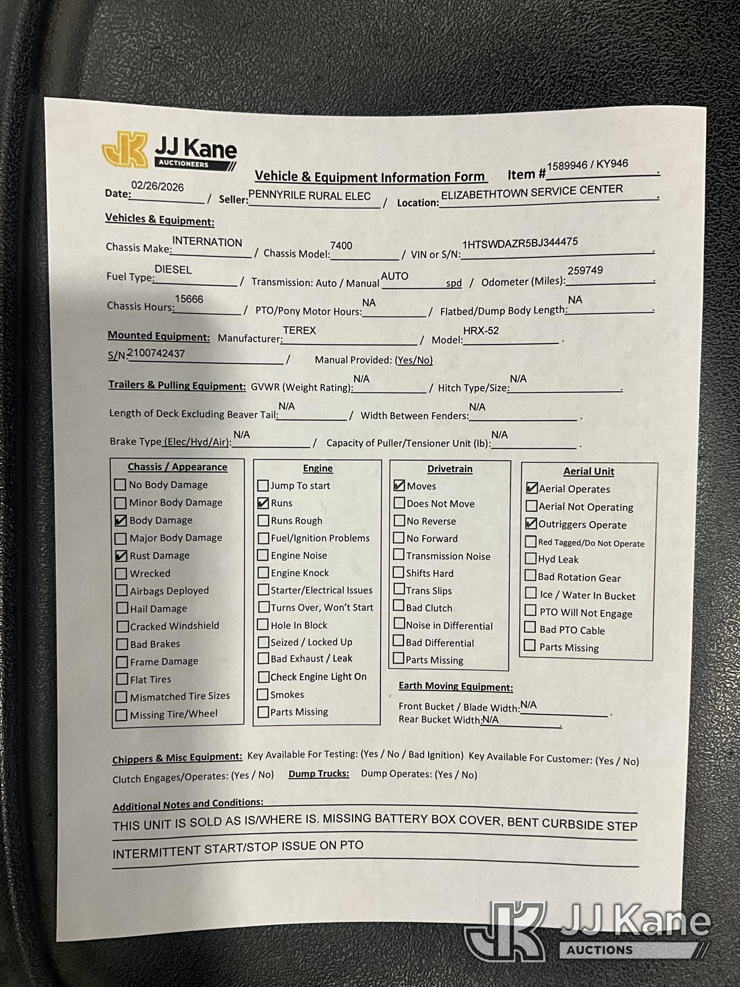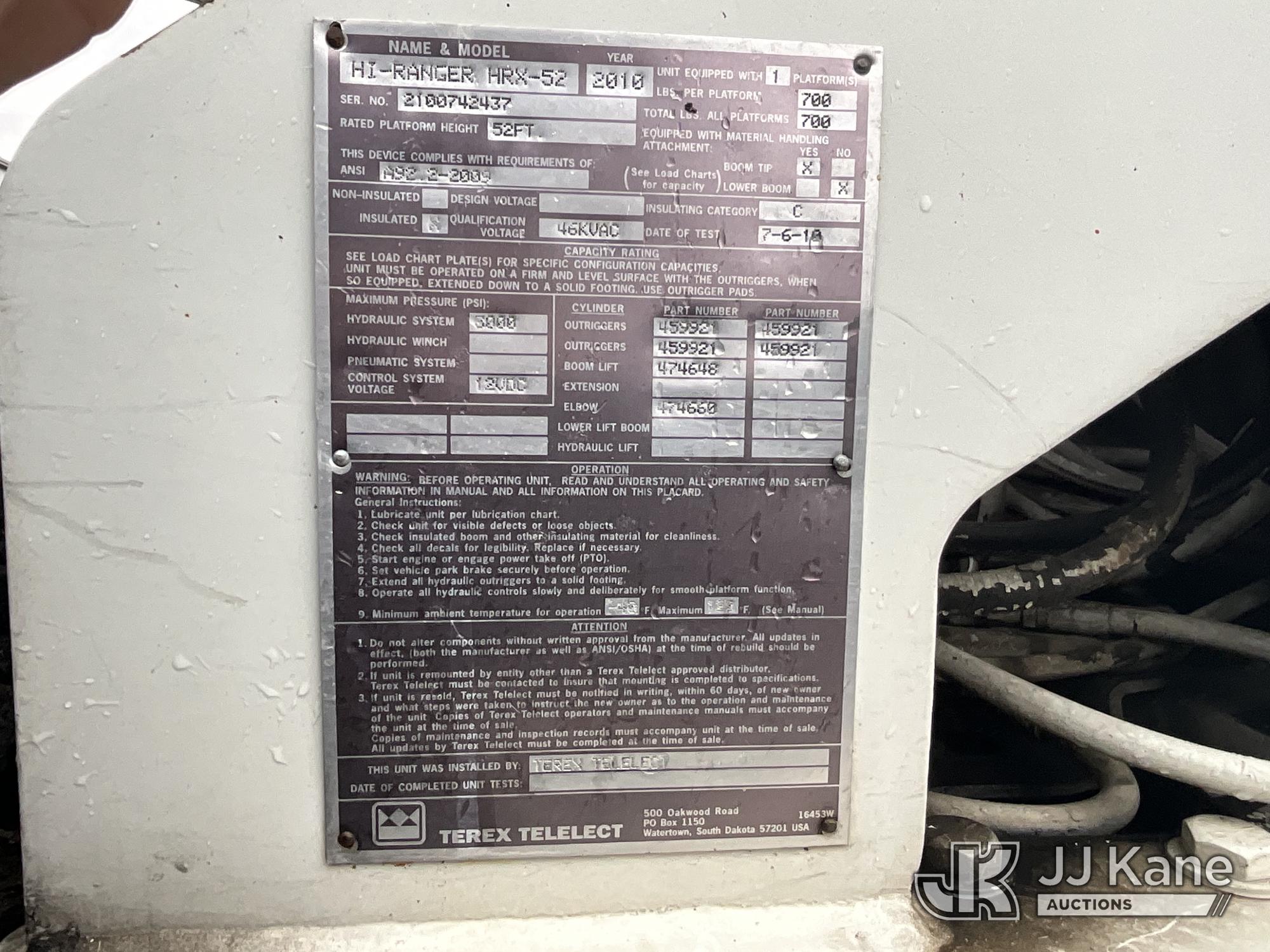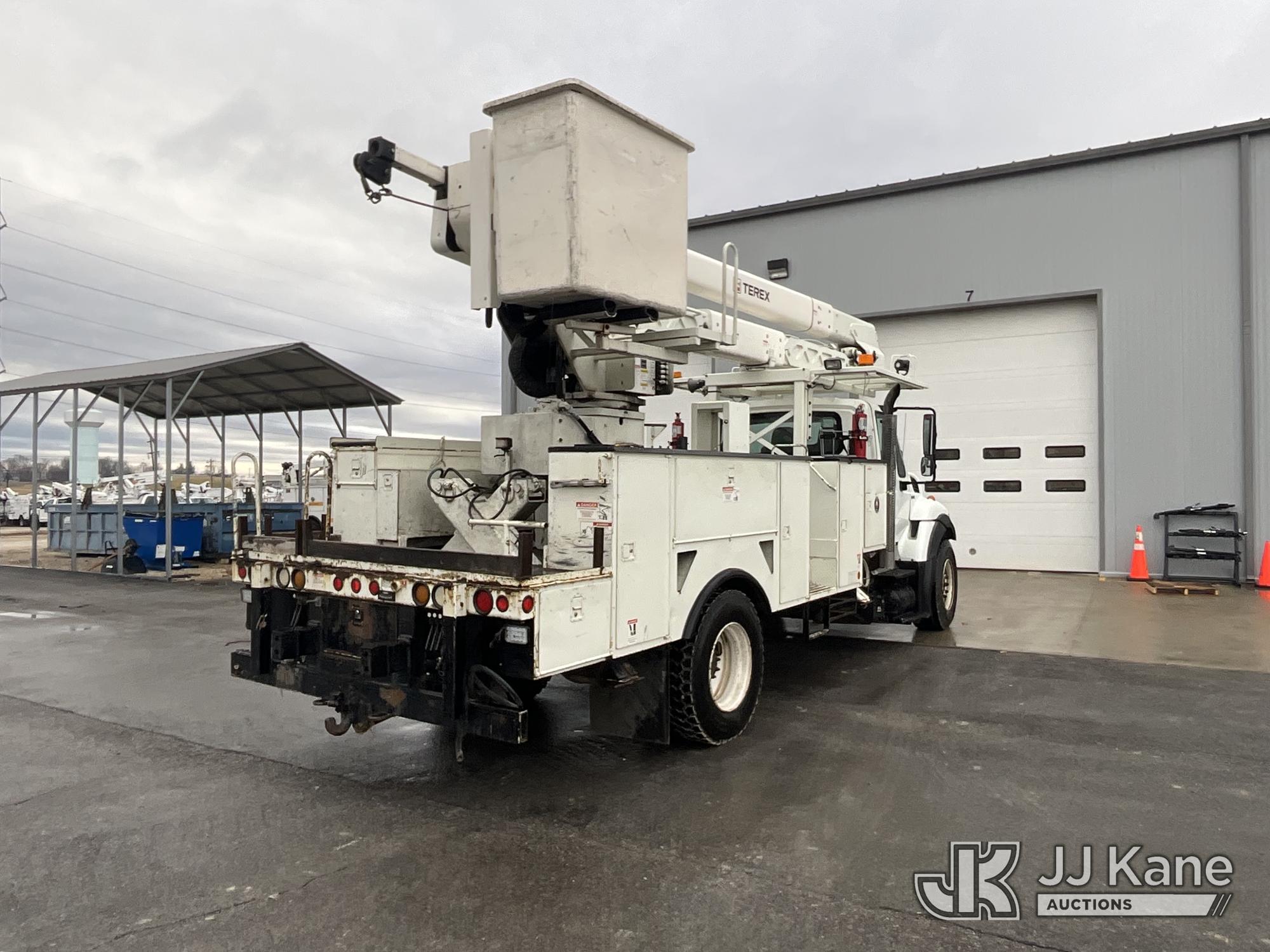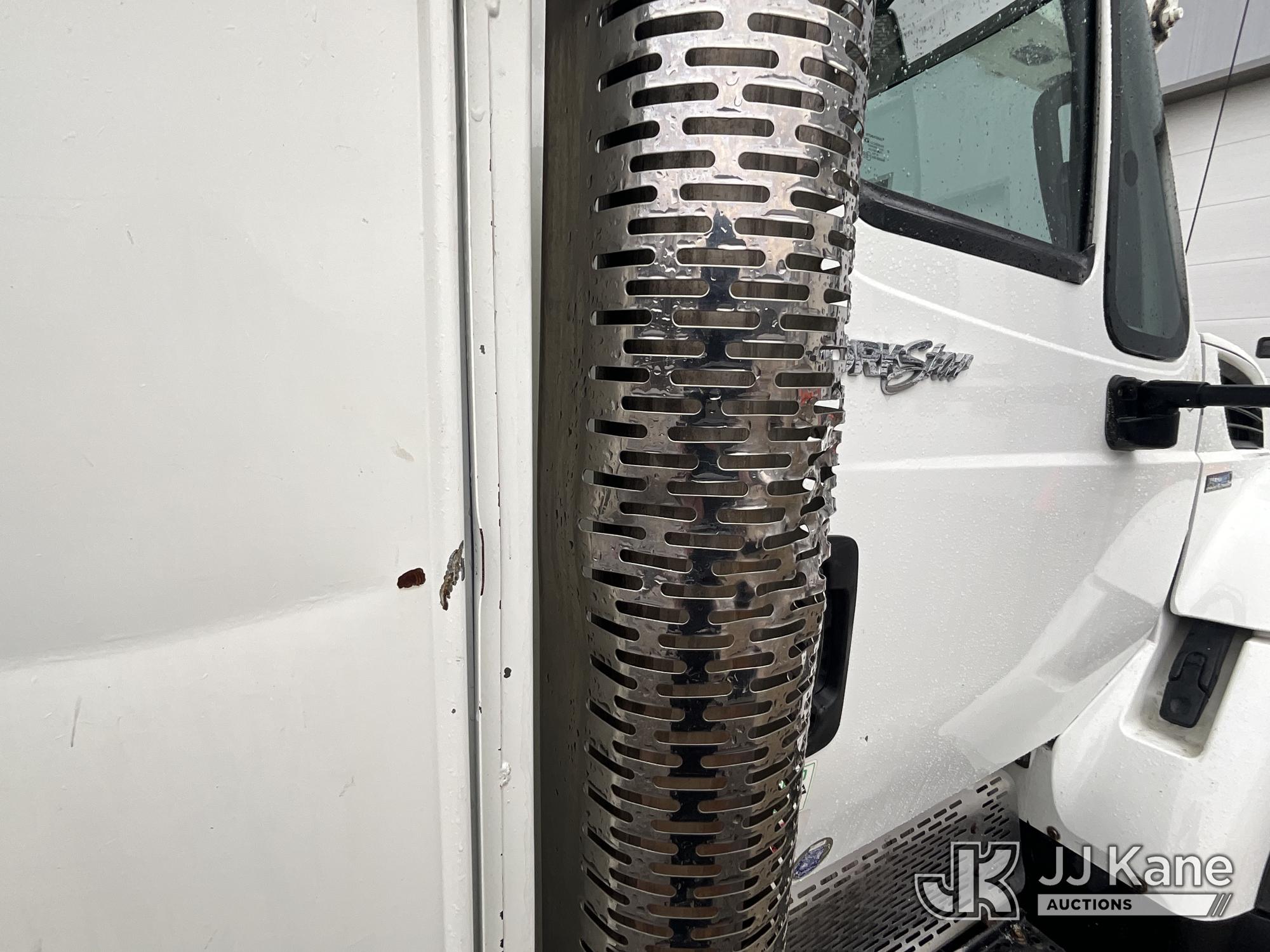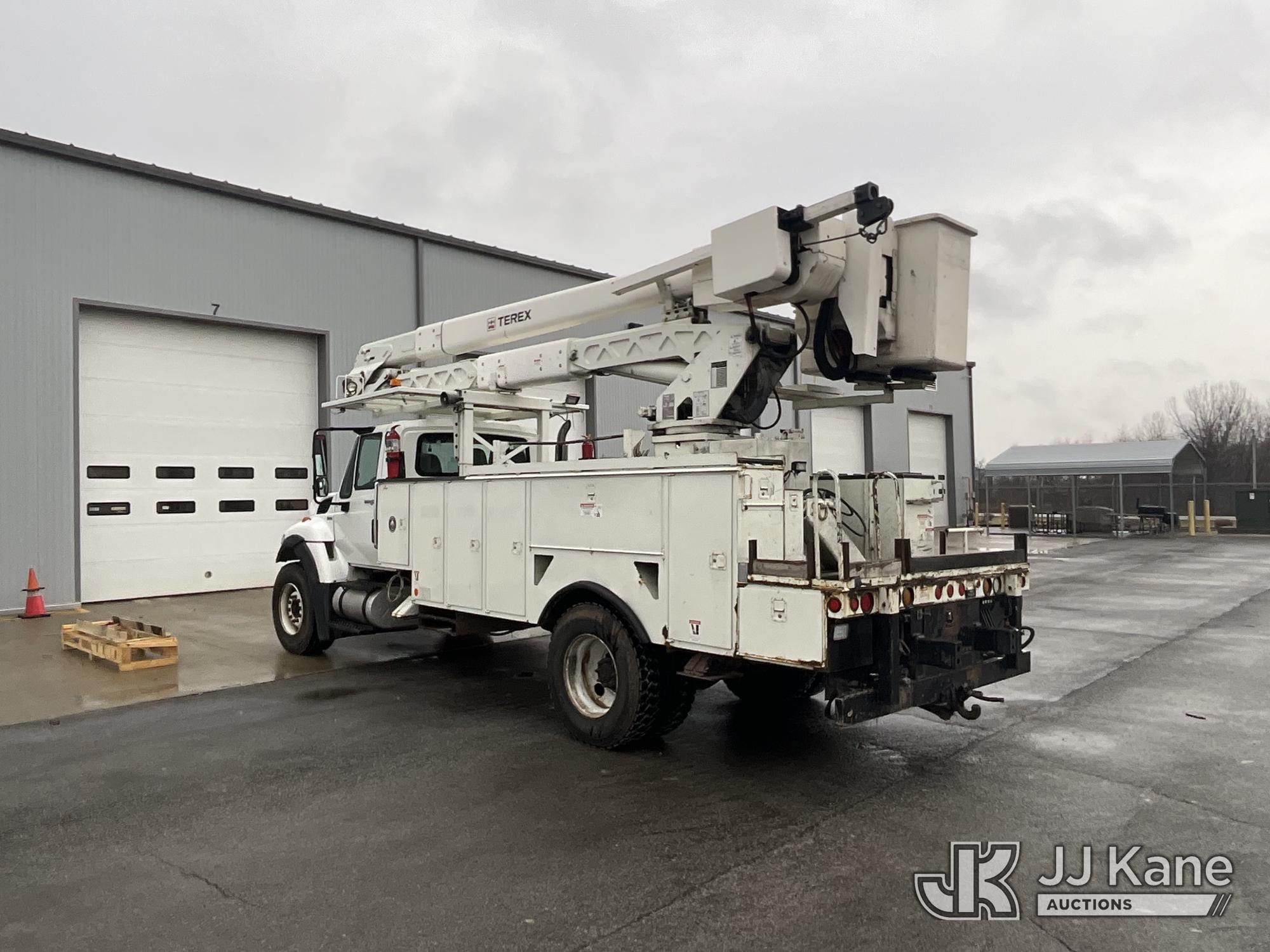 HiRanger HRX-52, 57 ft, Material Handling Bucket Truck s/n 2100742437, with two-man bucket & 4 hyd outriggers, rear mounted on 2011 International 7400 Utility Truck, 9.3L L6 DIESEL 4X2, Auto, A/C, (259,749 miles) (Runs, Moves, & Upper Operates, PTO Operates Intermittently, Missing Battery Box Cover, Bent Curbside Step) This is a Titled Item*