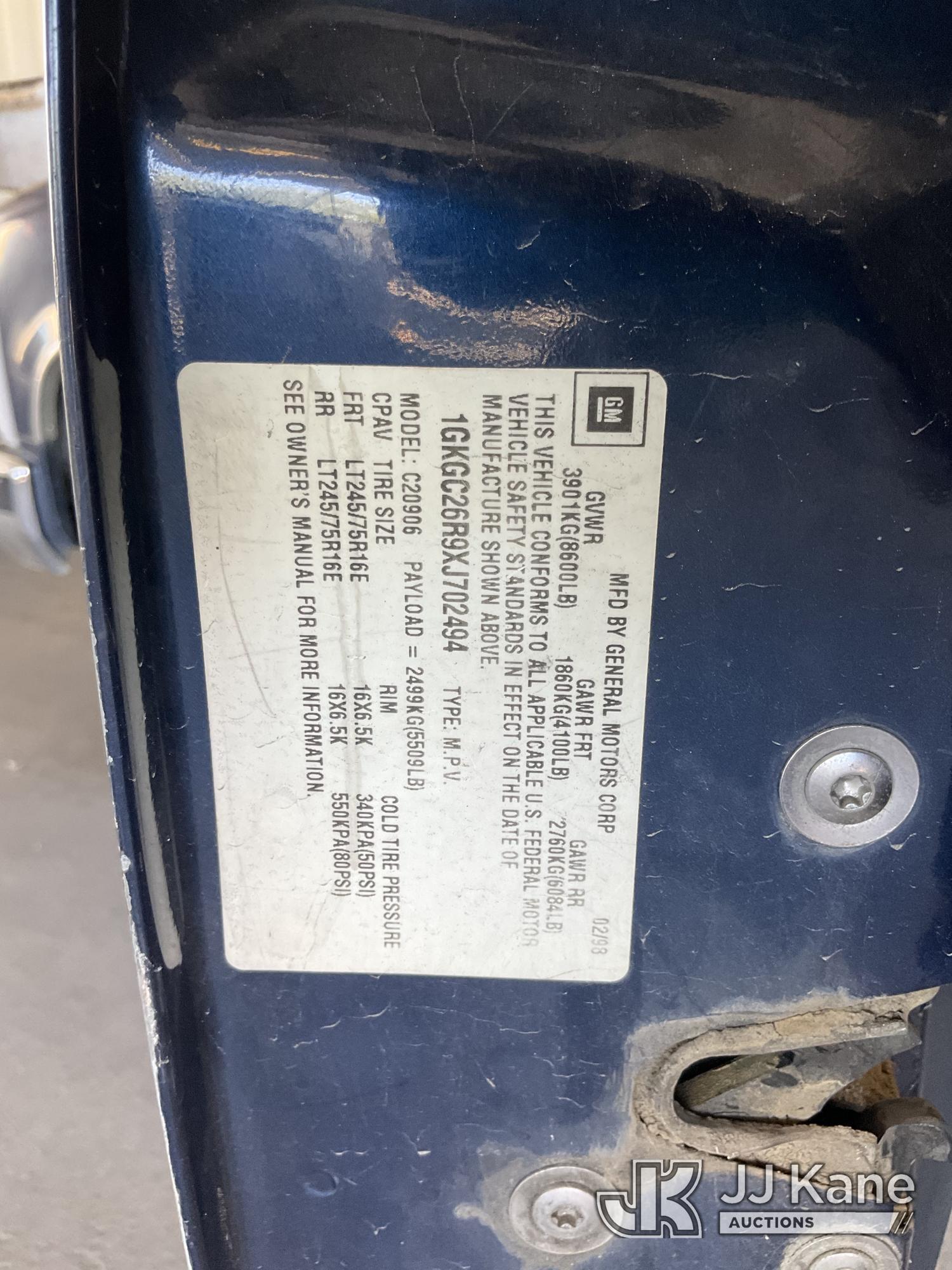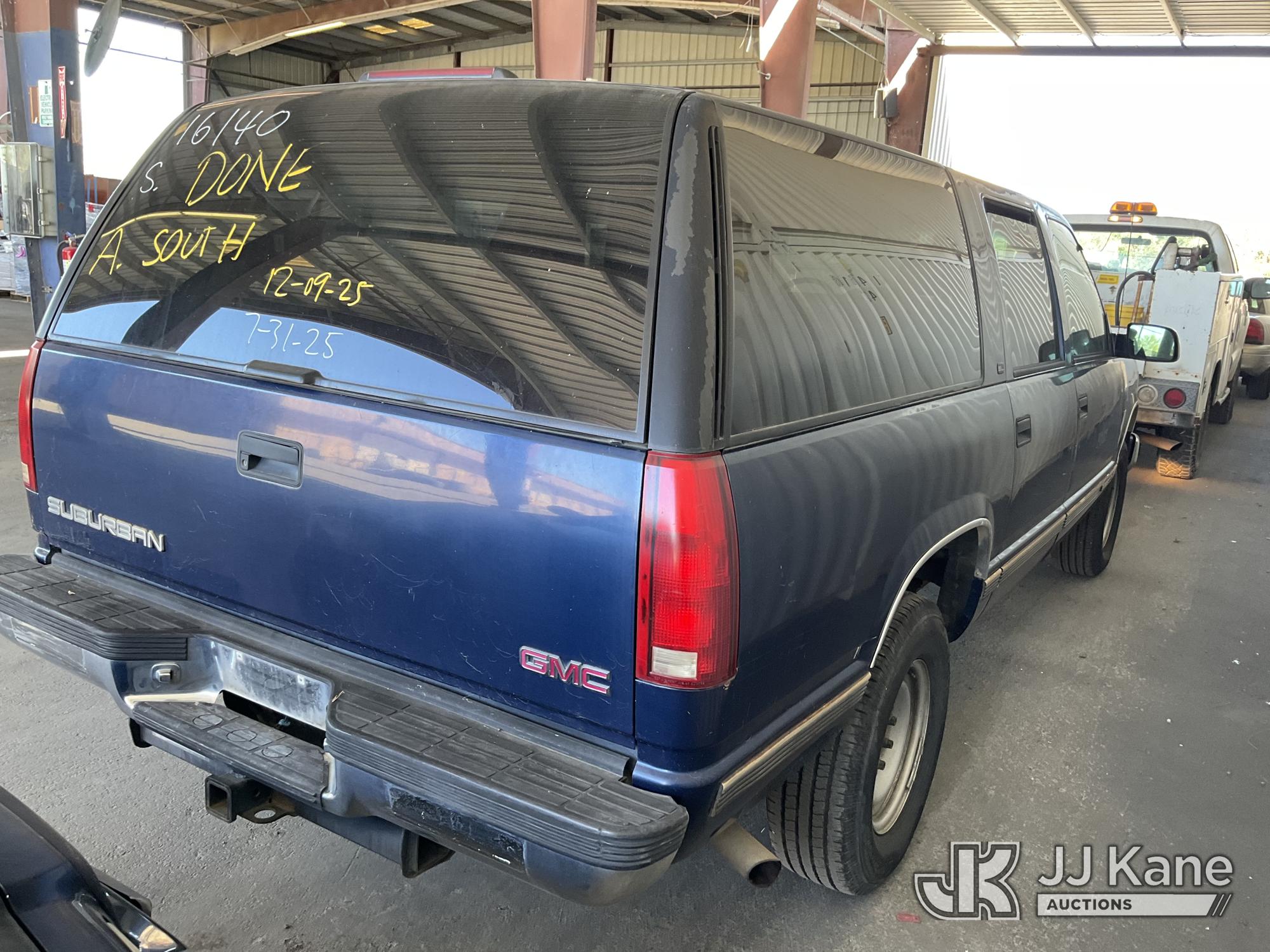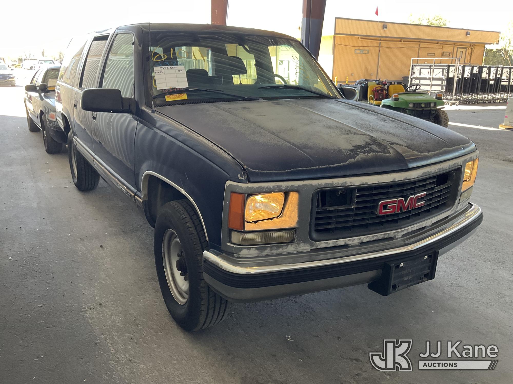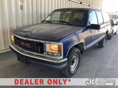 1999 GMC Suburban 2500 4-Door Sport Utility Vehicle, s/n 1GKGC26R9XJ702494, 8-cyl gas, 4-Speed Automatic, A/C, with Tow package, (Exempt from Odometer Disclosure - Reads 116,928 miles) (Runs & Moves) (Missing Seatbelt Buckle, Broken/Missing Side Mirrors) (Bidding Restricted to Licensed Vehicle Dealers Only), This is a Titled Item*