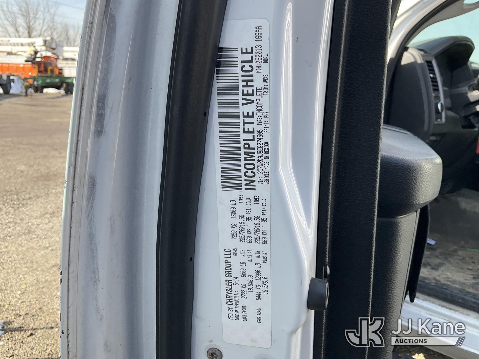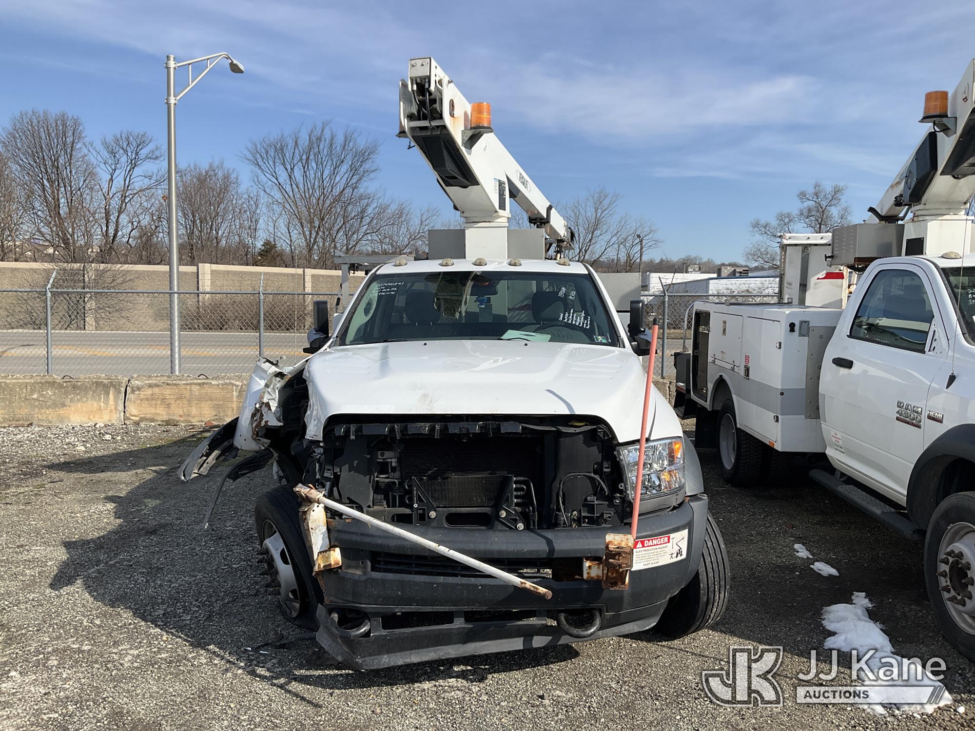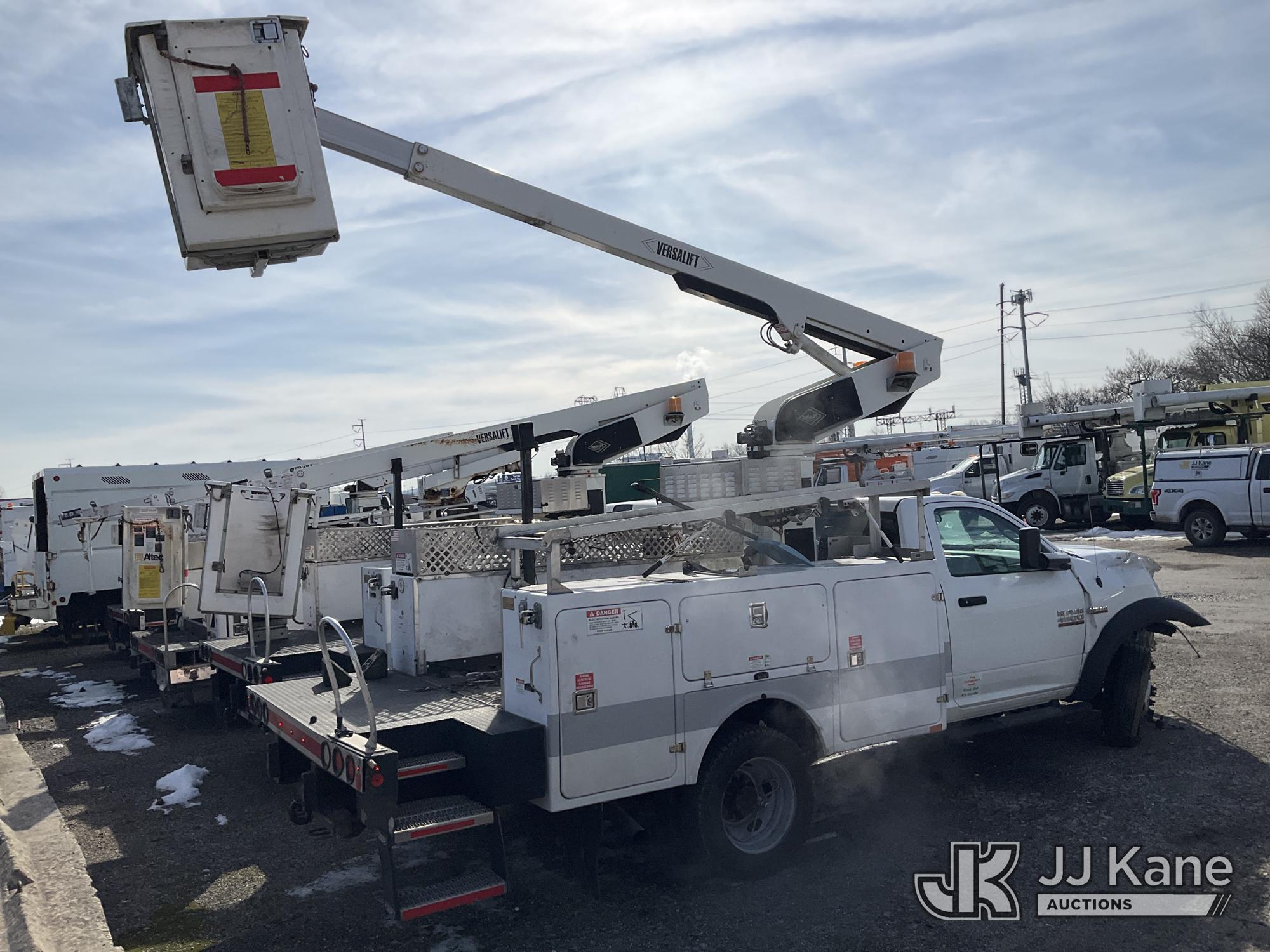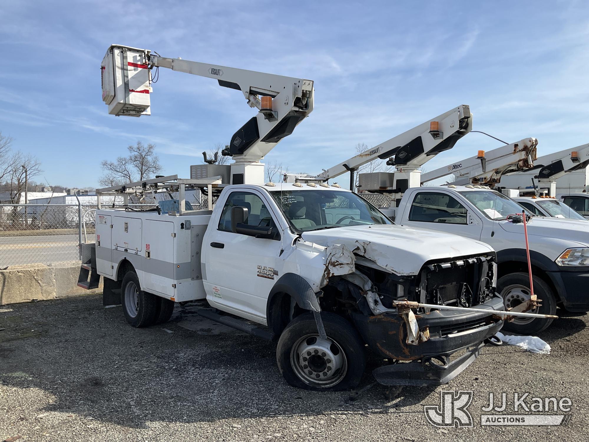 Versalift TEL29N03, 34 ft, Telescopic Non-Insulated Bucket Truck s/n AG140257, with single-man bucket, mounted behind cab on 2014 RAM 4500 Service Truck, 8-cyl gas, Auto, A/C, (128,996 miles) (Wrecked, Jump To Start, Runs, Does Not Move, Upper Operates, ABS Light On, Traction Control Light On, Must Tow, **Dealer Only** This item has been removed from service due to the listed safety repairs that were not completed. The safety items below must be completed by an approved upper OEM facility before the unit can return to service: UNIT WRECKED; REQUIRES MAJOR UNIT DAMAGE INSPECTION; COMPLETE ANY REQUIRED TESTING AND REPAIRS AFTER INSPECTIONS ARE COMPLETED. Buyer Must Load, Driveshaft Disconnected) (Bidding Restricted to Licensed Vehicle Dealers Only), This is a Titled Item*