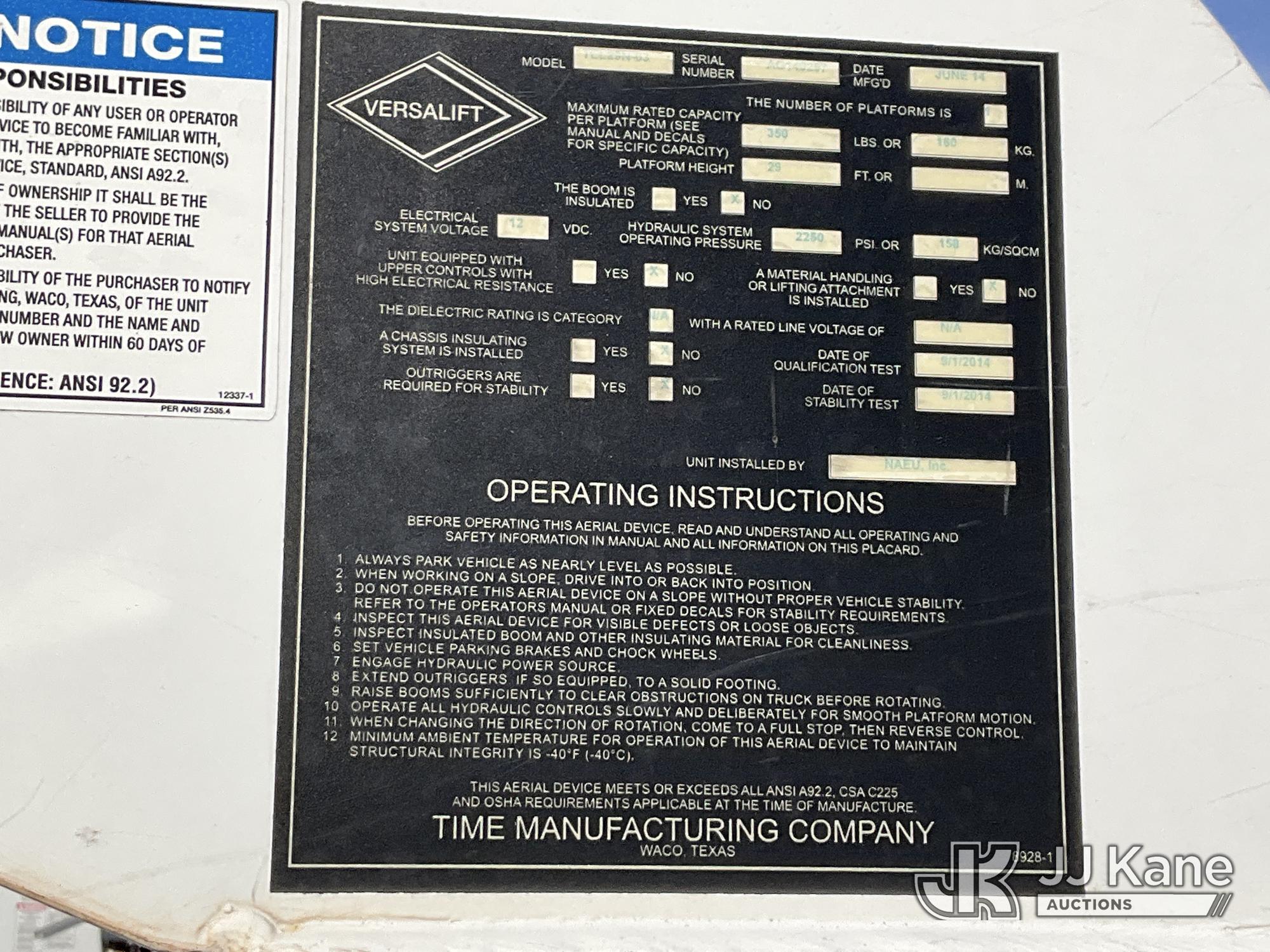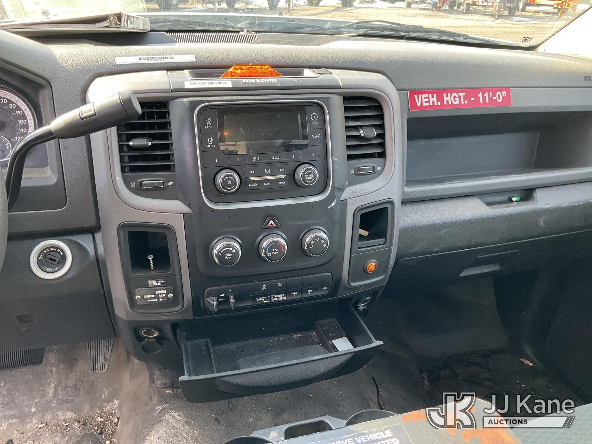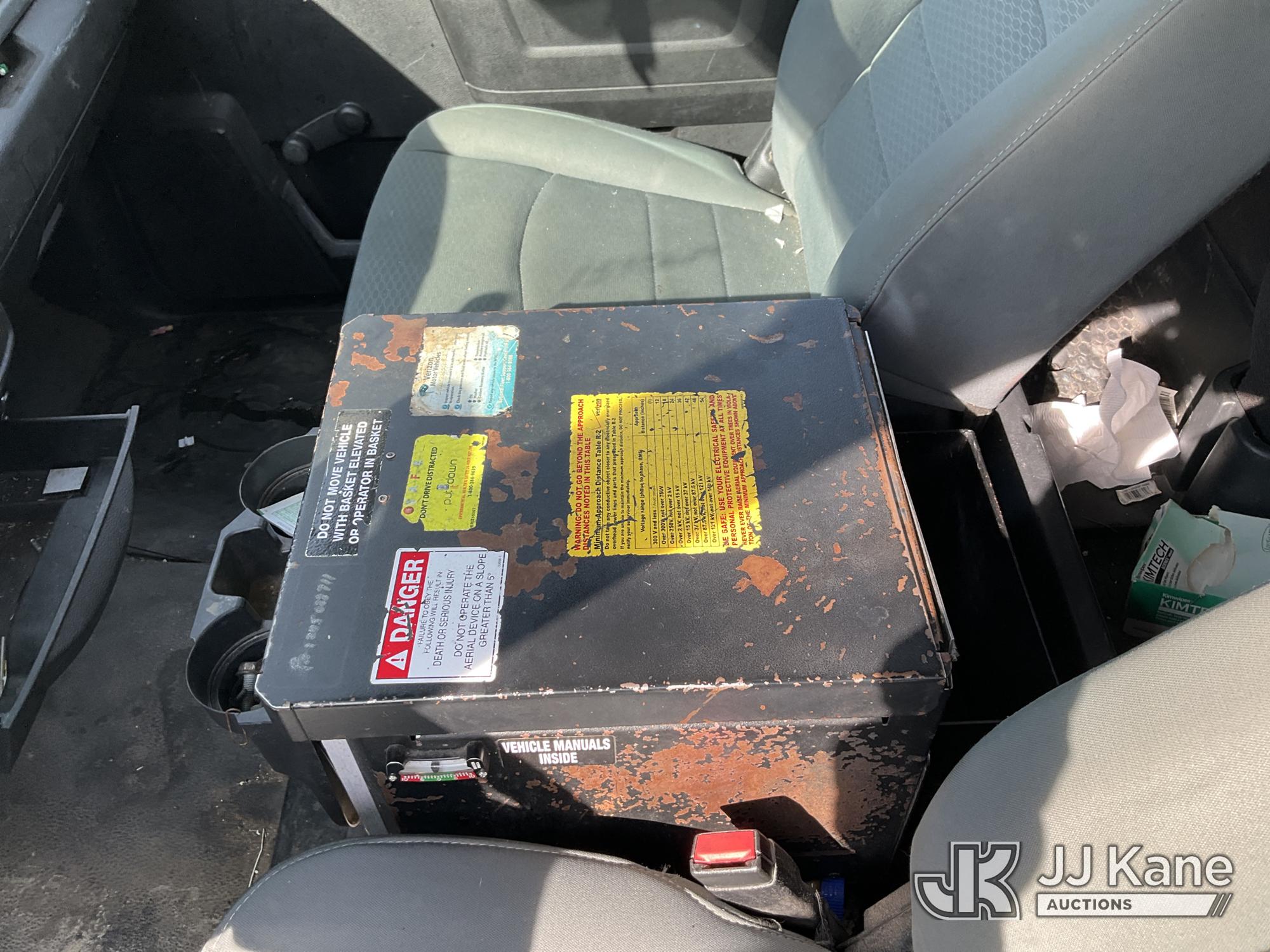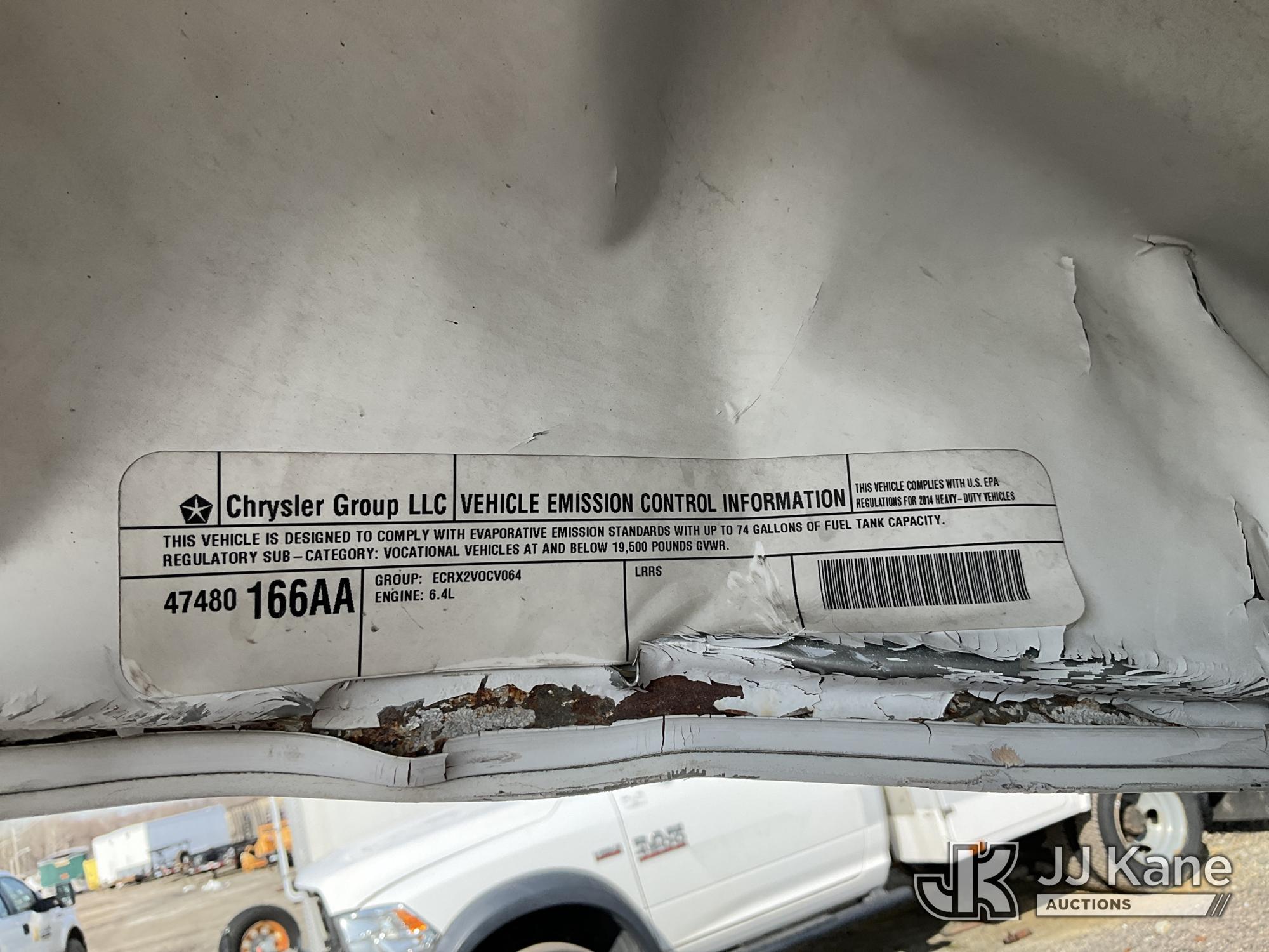 Versalift TEL29N03, 34 ft, Telescopic Non-Insulated Bucket Truck s/n AG140257, with single-man bucket, mounted behind cab on 2014 RAM 4500 Service Truck, 8-cyl gas, Auto, A/C, (128,996 miles) (Wrecked, Jump To Start, Runs, Does Not Move, Upper Operates, ABS Light On, Traction Control Light On, Must Tow, **Dealer Only** This item has been removed from service due to the listed safety repairs that were not completed. The safety items below must be completed by an approved upper OEM facility before the unit can return to service: UNIT WRECKED; REQUIRES MAJOR UNIT DAMAGE INSPECTION; COMPLETE ANY REQUIRED TESTING AND REPAIRS AFTER INSPECTIONS ARE COMPLETED. Buyer Must Load, Driveshaft Disconnected) (Bidding Restricted to Licensed Vehicle Dealers Only), This is a Titled Item*