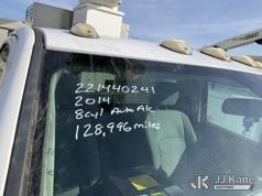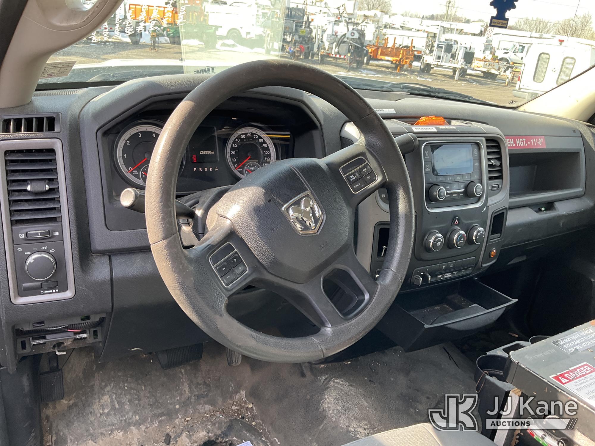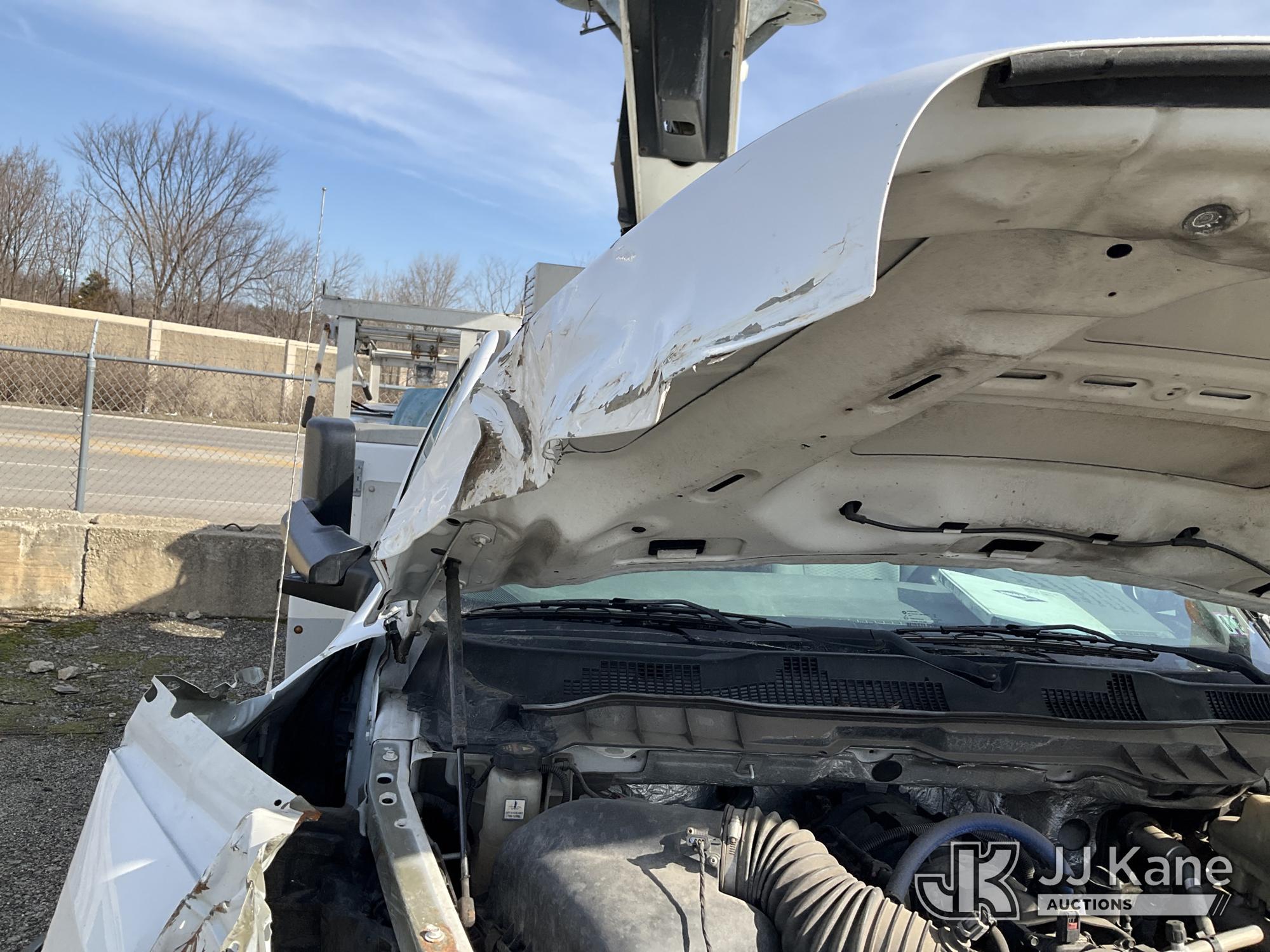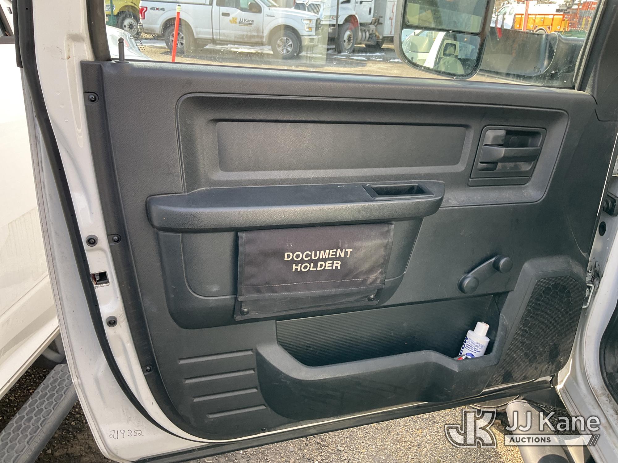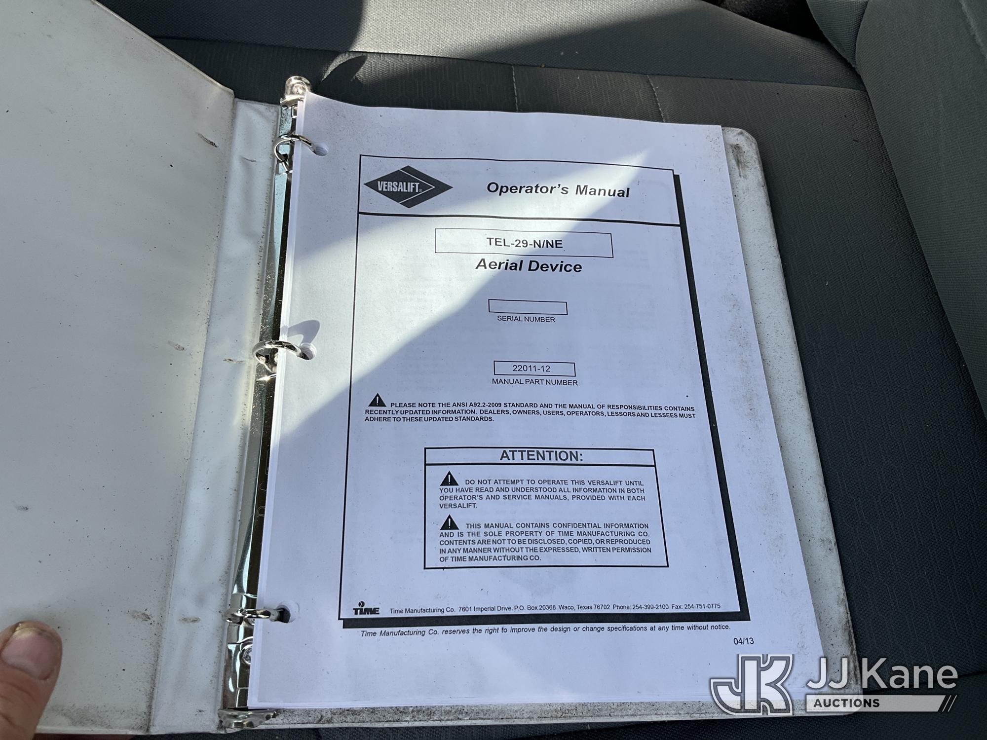 Versalift TEL29N03, 34 ft, Telescopic Non-Insulated Bucket Truck s/n AG140257, with single-man bucket, mounted behind cab on 2014 RAM 4500 Service Truck, 8-cyl gas, Auto, A/C, (128,996 miles) (Wrecked, Jump To Start, Runs, Does Not Move, Upper Operates, ABS Light On, Traction Control Light On, Must Tow, **Dealer Only** This item has been removed from service due to the listed safety repairs that were not completed. The safety items below must be completed by an approved upper OEM facility before the unit can return to service: UNIT WRECKED; REQUIRES MAJOR UNIT DAMAGE INSPECTION; COMPLETE ANY REQUIRED TESTING AND REPAIRS AFTER INSPECTIONS ARE COMPLETED. Buyer Must Load, Driveshaft Disconnected) (Bidding Restricted to Licensed Vehicle Dealers Only), This is a Titled Item*