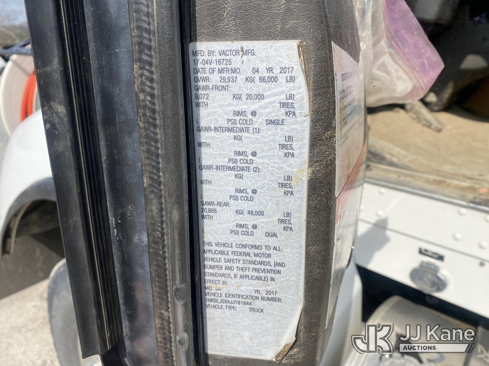 Vactor 2100/2112P-18, Vactor/Sewer & Jet Rodder System s/n 17-04V-16725, mounted on 2018 Kenworth T4 Series Vacuum Excavation Truck, Paccar PX-9 8.9L Diesel, 6X4, Auto, A/C, with Stainless Steel Filter Kit on Upper and Internal Battery Charging System with Wireless Remote Operation., (87,060 miles) (Runs, Moves & Unit Operates Rodder and Blower) (Seller States: Rodder Pump Needs Replaced, Intermittent Short in Engine Electrical Harness. JUMP TO START. A/C Line Leak and Blows Hot.) (Reads 8,360 hours) This is a Titled Item*