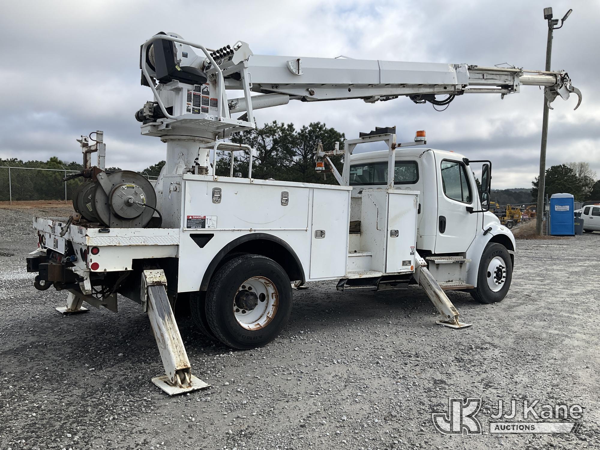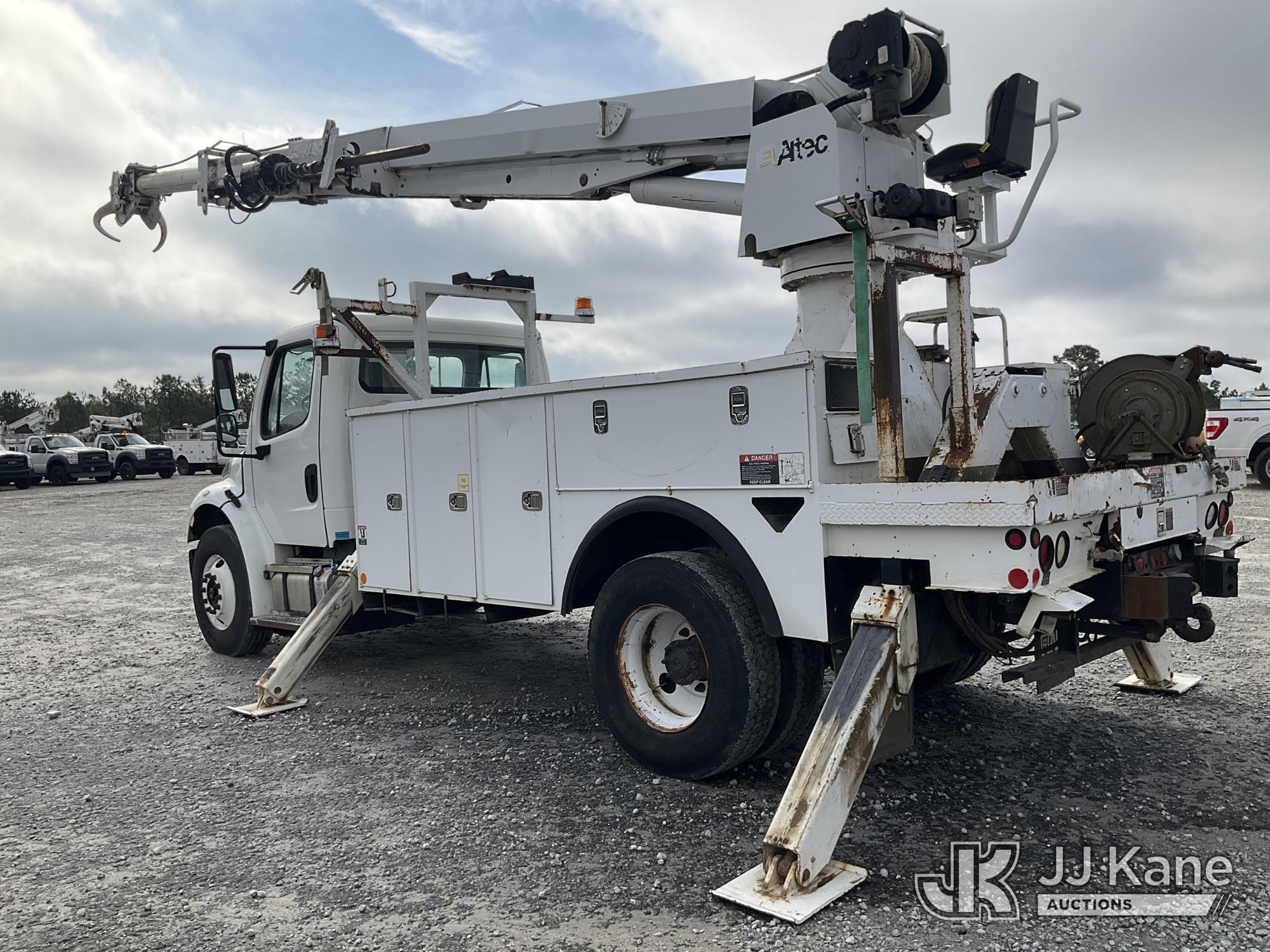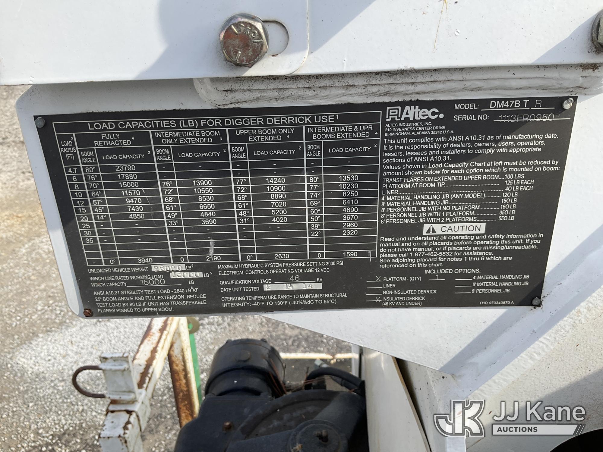 Altec DM47B-TR, 23,790 Lb Digger Derrick s/n 1113FR0950, with 47 ft. sheave height, 3 section hyd boom, 2-spd digger, heel winch, riding console & 4 hyd outriggers, rear mounted on 2014 Freightliner M2 106 Utility Truck, 6.7L L6 DIESEL 4X2, DIESEL, Auto, A/C, (117,169 miles) (Runs, Moves, & Upper Operates) (Missing Auger, Check Engine Light On)( The manufacturer has notified JJ Kane that this equipment is subject to an open recall. CSN 612 Trailer Relay Module Circuit Breaker Change CSN 713A Reinforcement Plate Installation The equipment should not be operated until this is addressed. Buyer is responsible for reviewing the recall notice and contacting the manufacturer to schedule the recommended corrective actions. Associated costs may be covered by the manufacturer in some cases.) (Reads 7,918 hours) This is a Titled Item*
