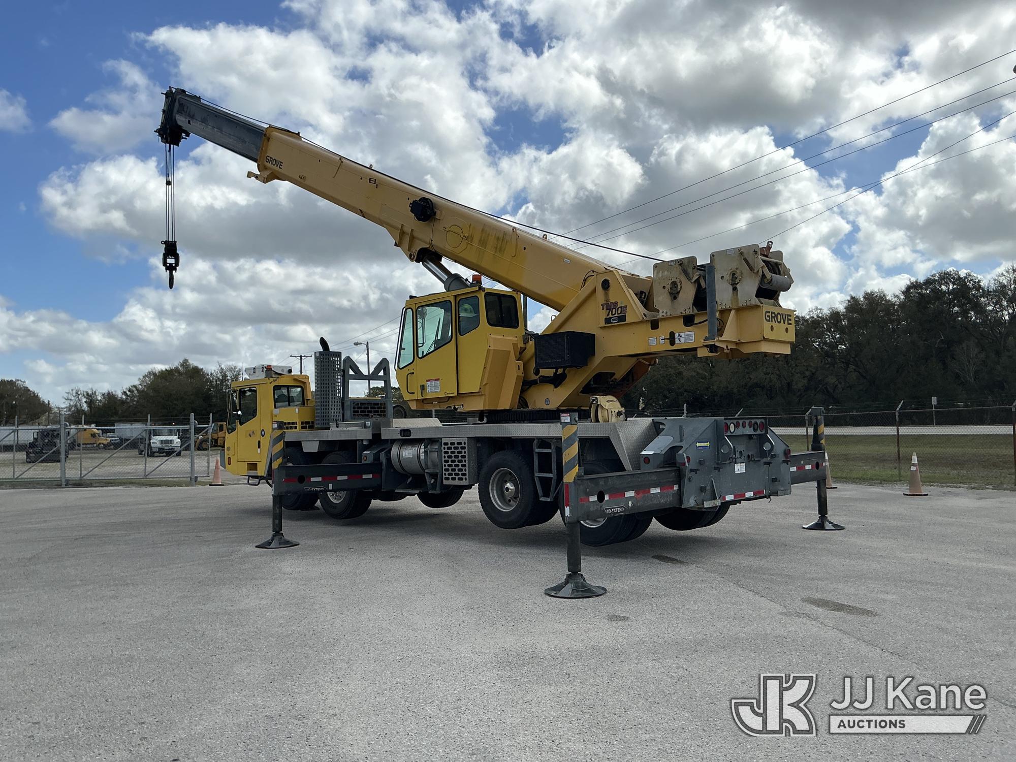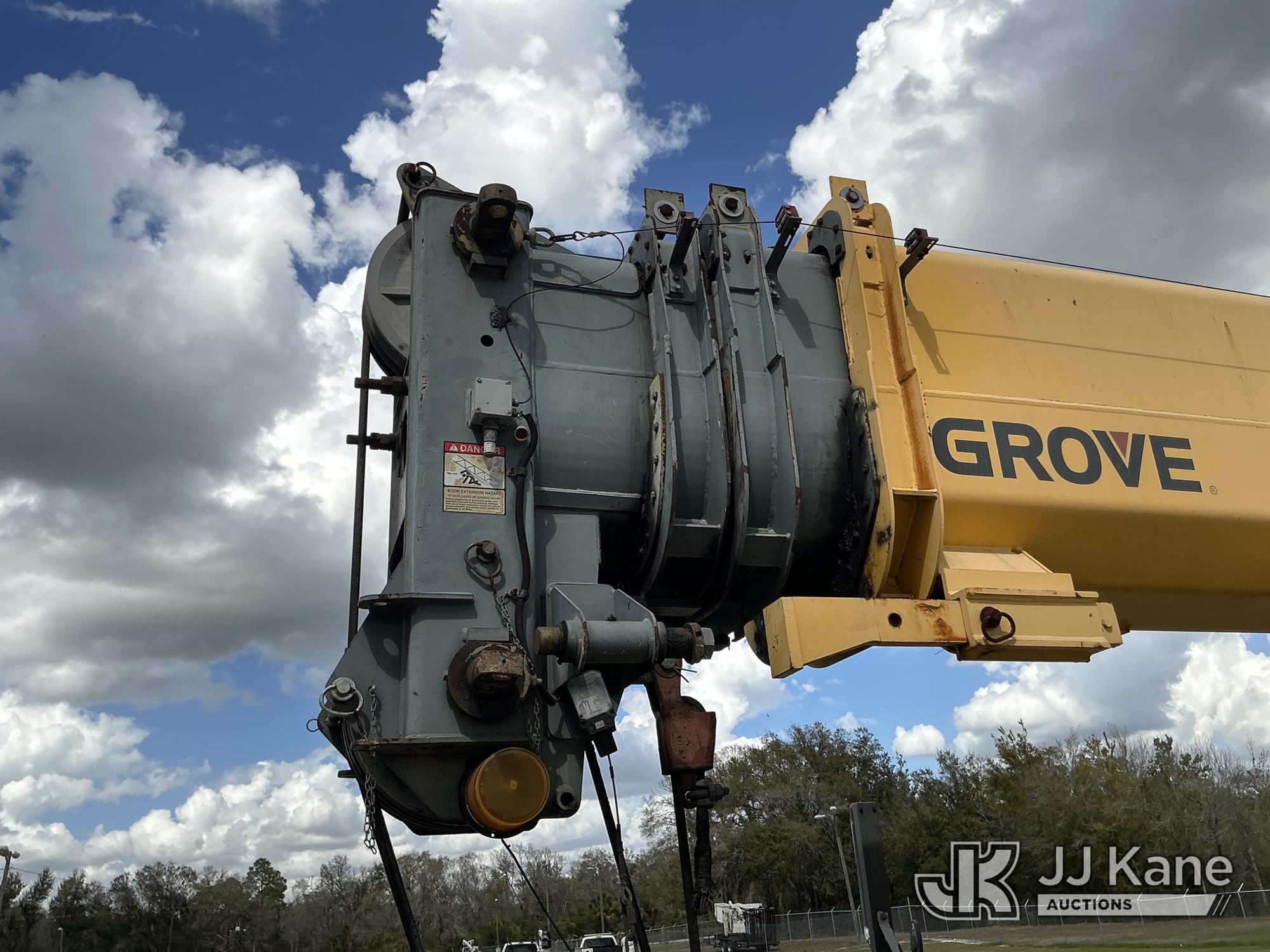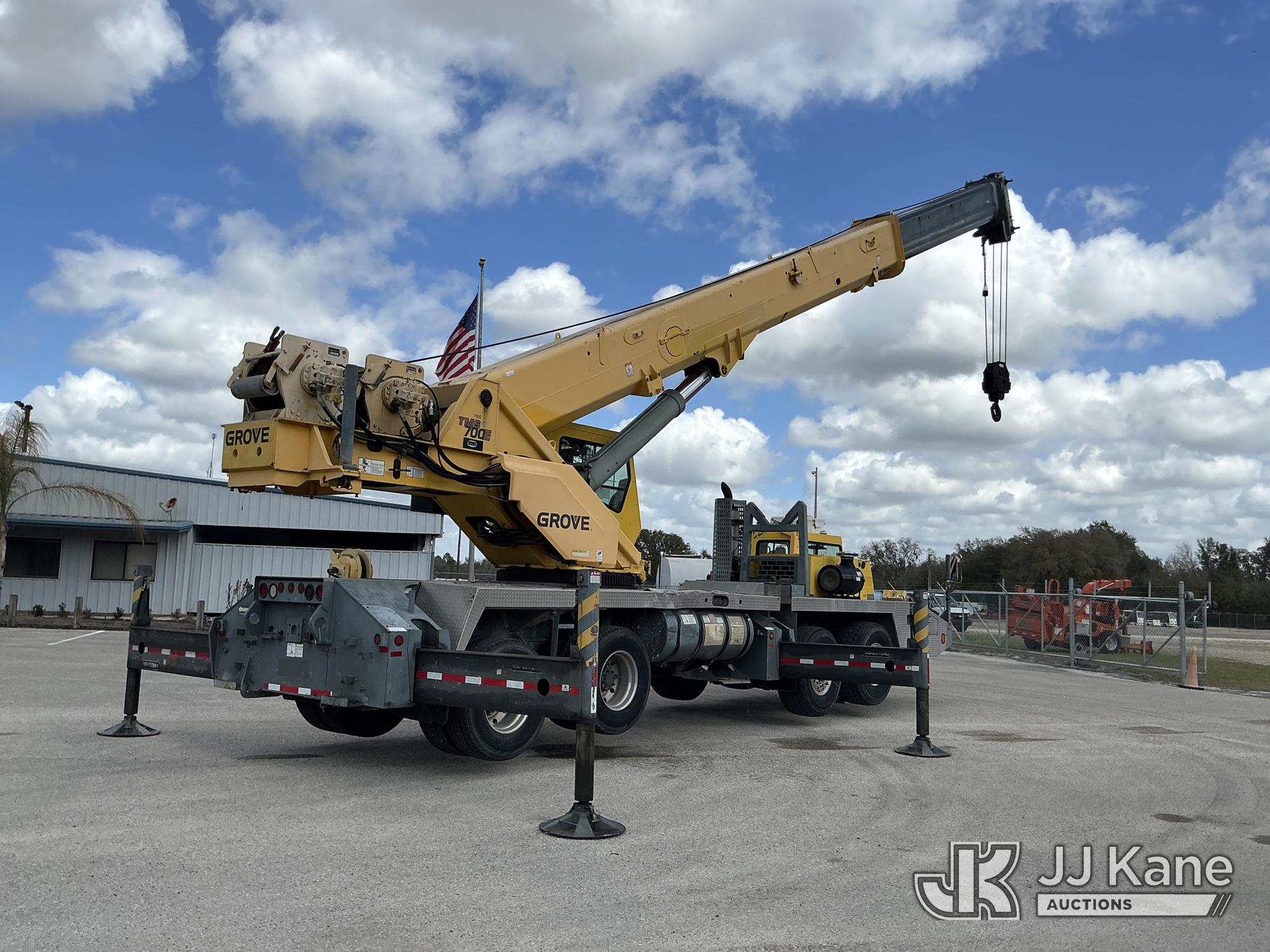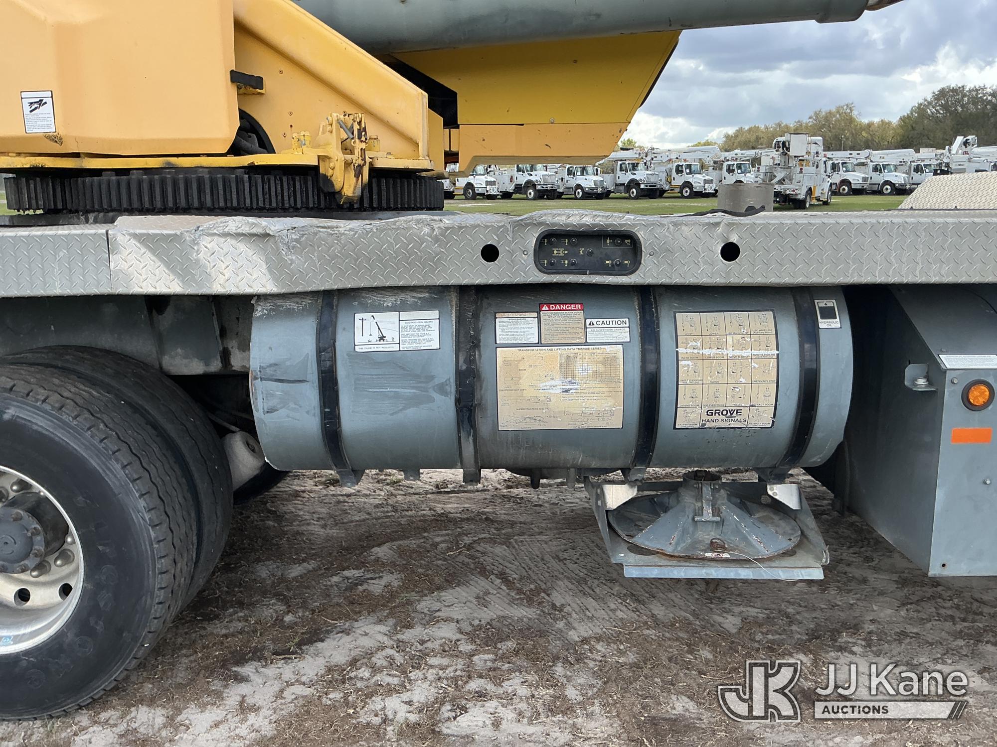 Grove TMS700E, 60-Ton Hydraulic Crane s/n 230030, with 36 ft. to 110 ft. 4 section main boom, 36 ft. to 56 ft. lattice jib, main heel winch, anti-two block system, 2 winches, aux boom head sheave block, 8.5 ton headache ball, 5 hyd outriggers & enclosed riding console, rear mounted on 2009 Grove 8460GE 8x4 Carrier, s/n 476S700E29S230030, Cummins diesel, Eaton/Fuller Auto Shift, A/C, with (3) 5.500 lbs. Crane Heavy Counterweight Package., (36,119 miles) (Runs, Moves & Operates)(FL Residents Purchasing Titled Items – tax, title & registration fees will be collected at the maximum rate of $400.00 under 25,999 and $800.00 for Over 26,000 and $250.00 trailers – Proof of insurance is mandatory; Out of State Residents Purchasing Title Items – tax will be collected based upon your state rate.) (Reads 5,544 hours) This is a Titled Item*