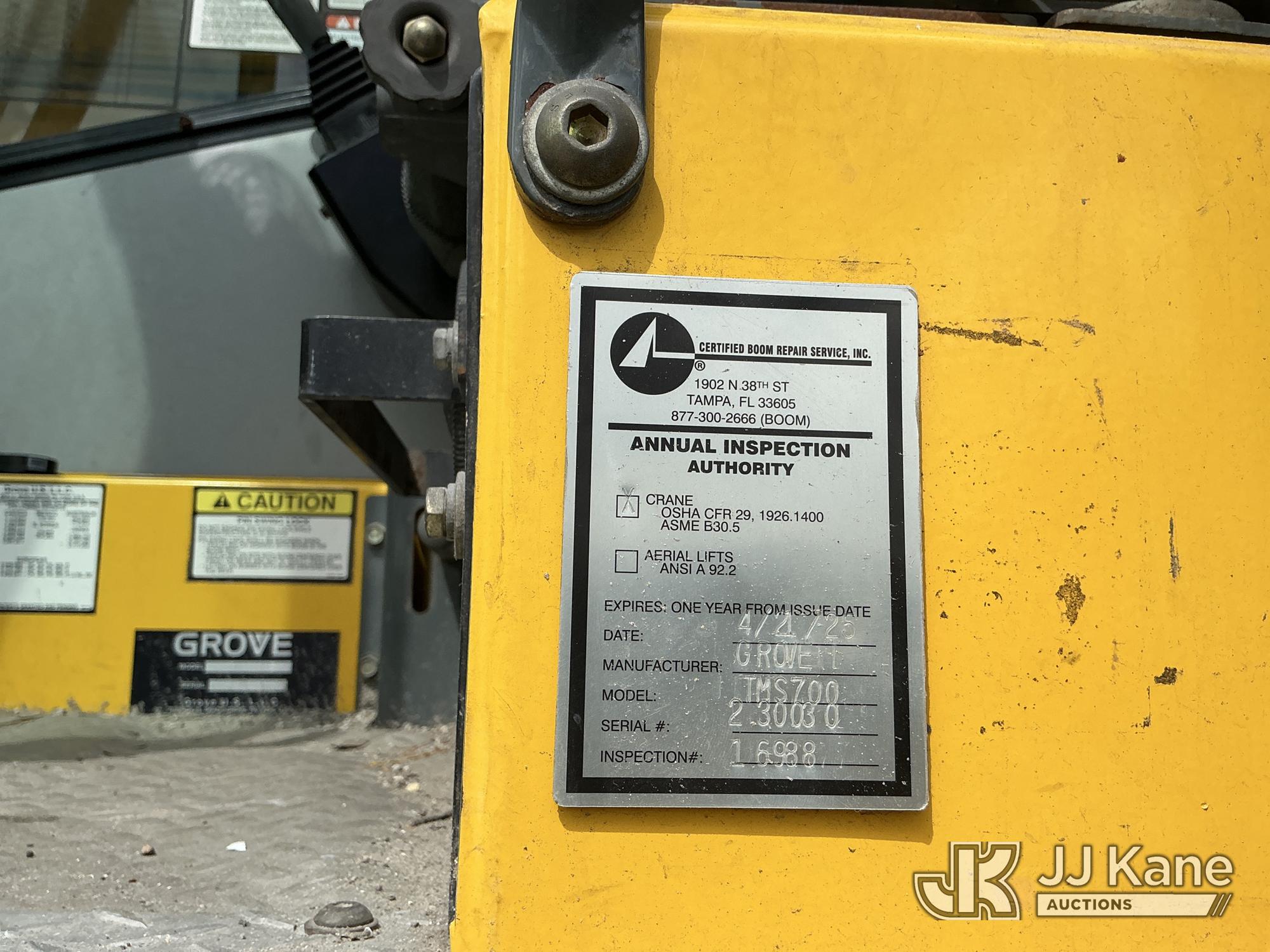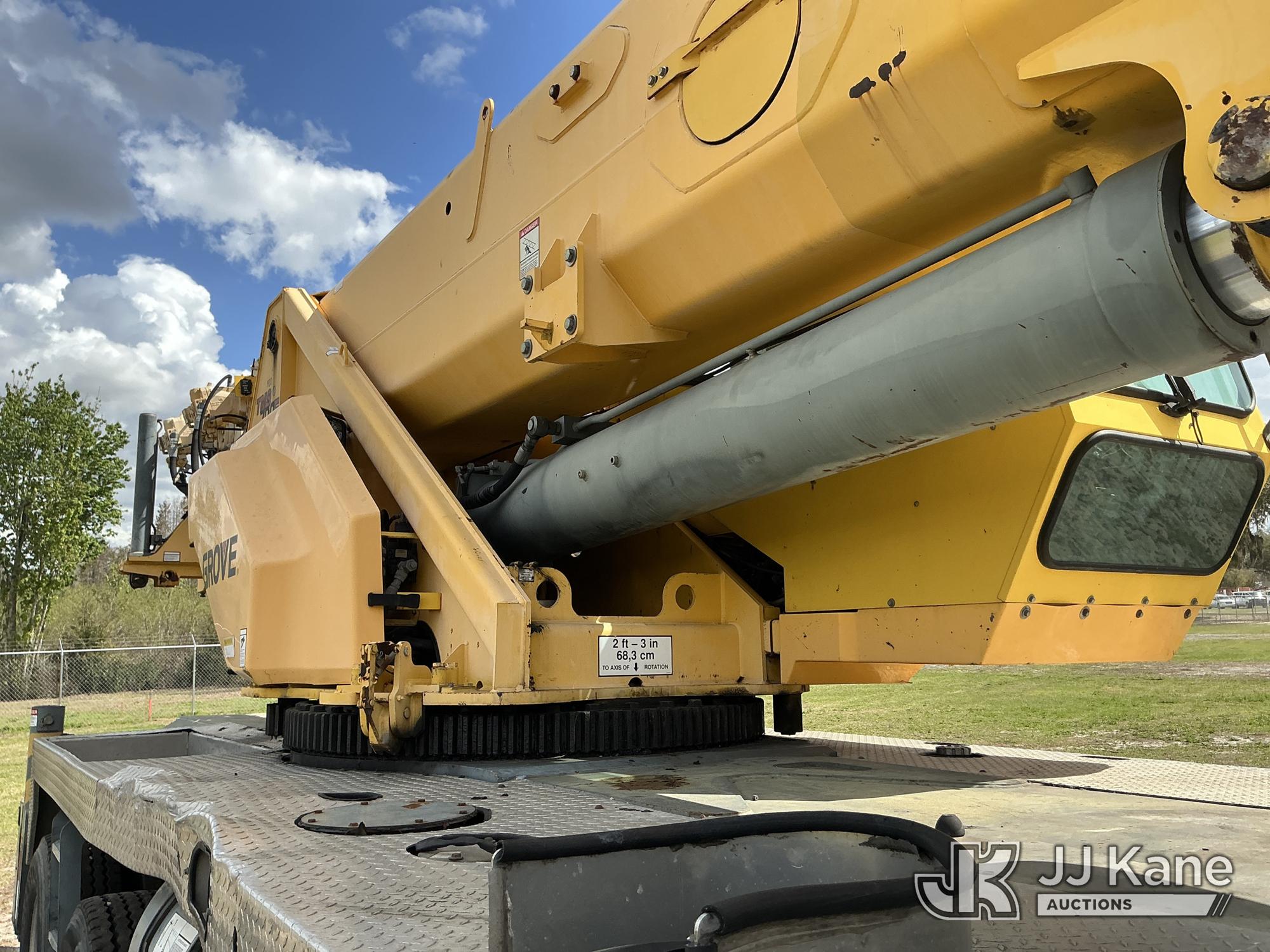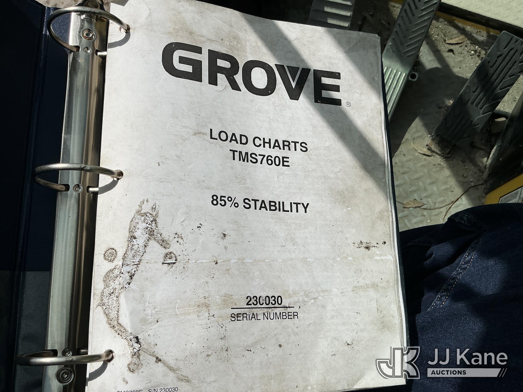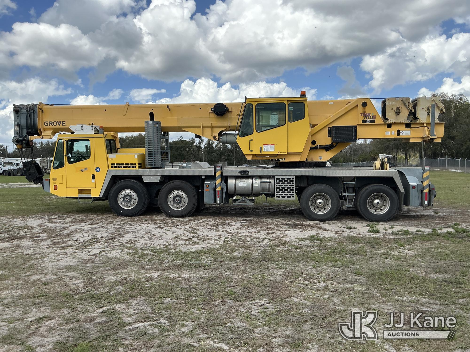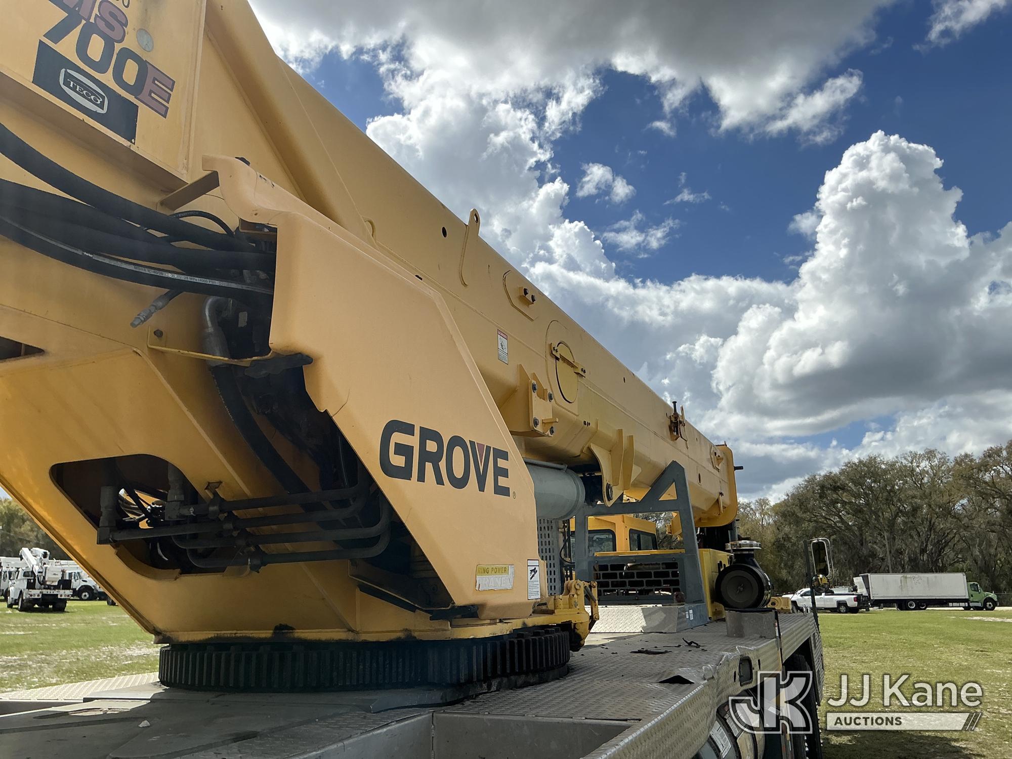 Grove TMS700E, 60-Ton Hydraulic Crane s/n 230030, with 36 ft. to 110 ft. 4 section main boom, 36 ft. to 56 ft. lattice jib, main heel winch, anti-two block system, 2 winches, aux boom head sheave block, 8.5 ton headache ball, 5 hyd outriggers & enclosed riding console, rear mounted on 2009 Grove 8460GE 8x4 Carrier, s/n 476S700E29S230030, Cummins diesel, Eaton/Fuller Auto Shift, A/C, with (3) 5.500 lbs. Crane Heavy Counterweight Package., (36,119 miles) (Runs, Moves & Operates)(FL Residents Purchasing Titled Items – tax, title & registration fees will be collected at the maximum rate of $400.00 under 25,999 and $800.00 for Over 26,000 and $250.00 trailers – Proof of insurance is mandatory; Out of State Residents Purchasing Title Items – tax will be collected based upon your state rate.) (Reads 5,544 hours) This is a Titled Item*