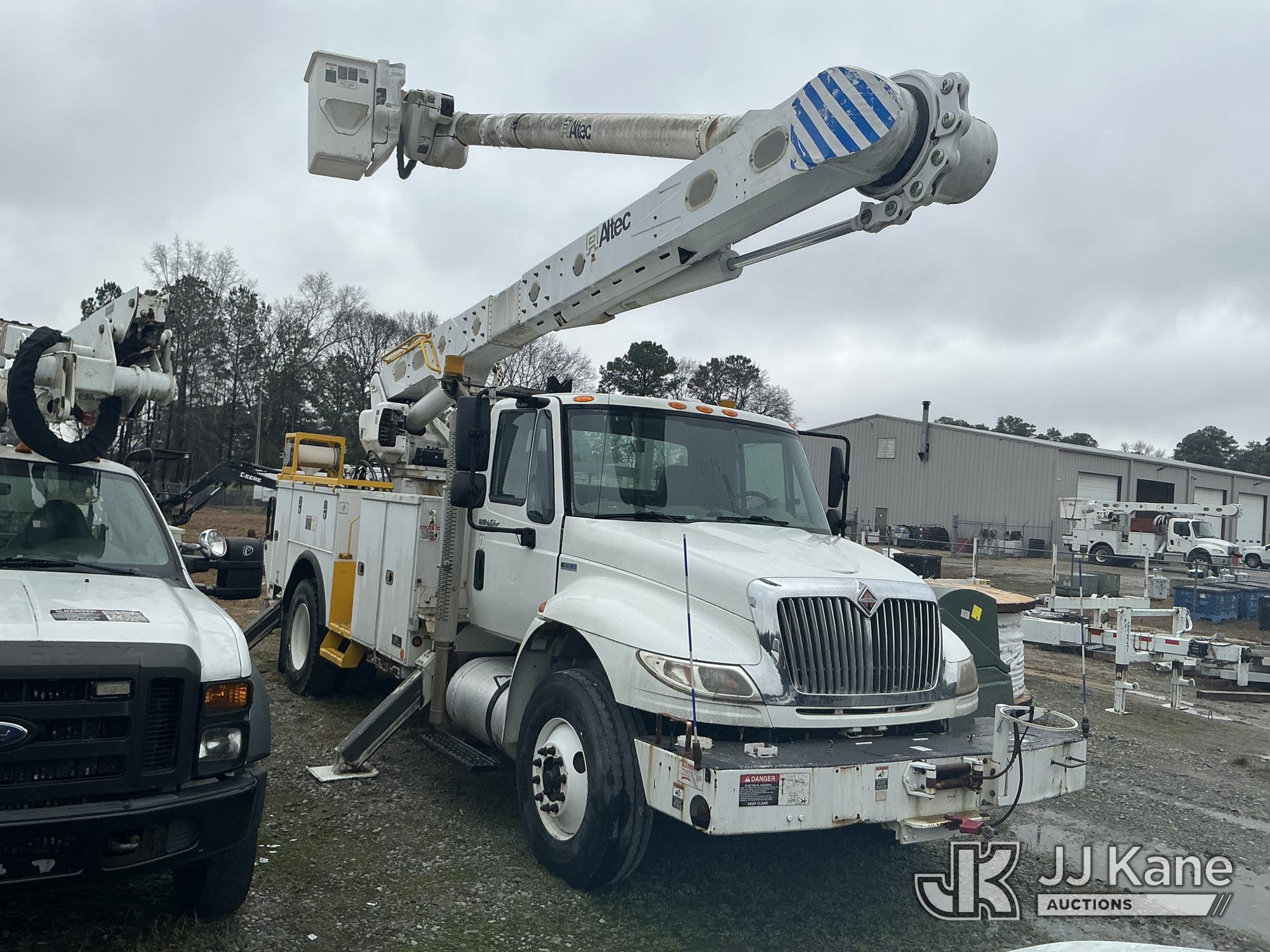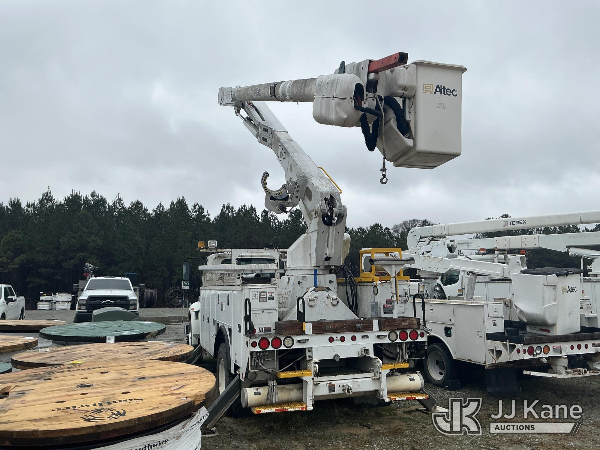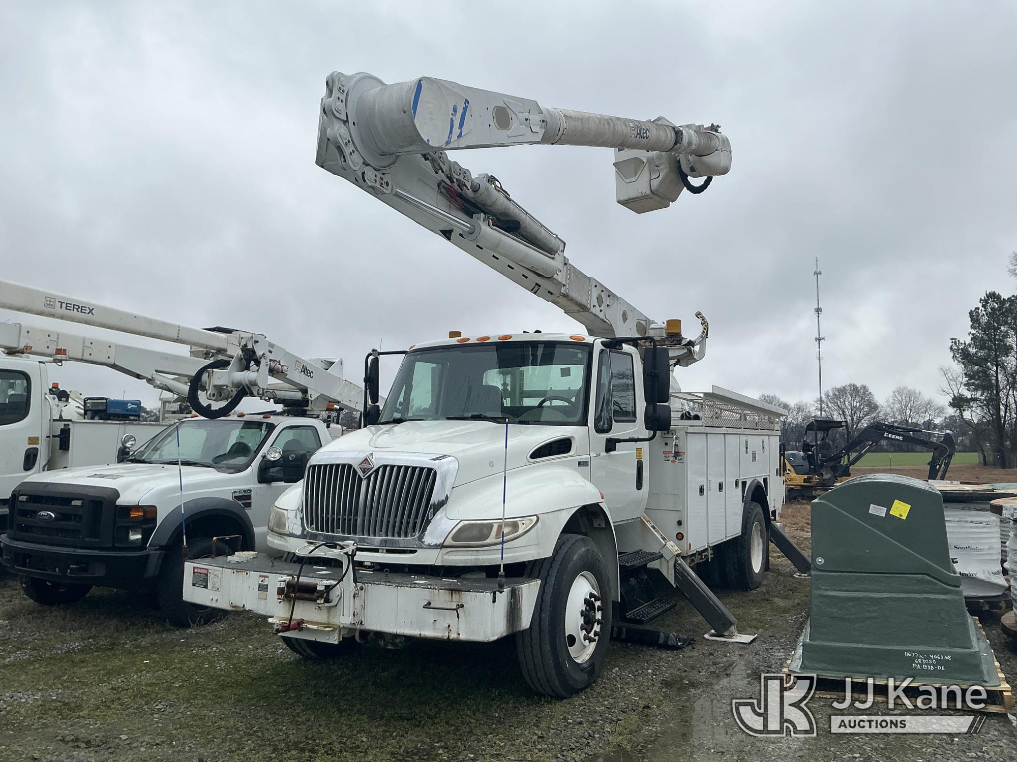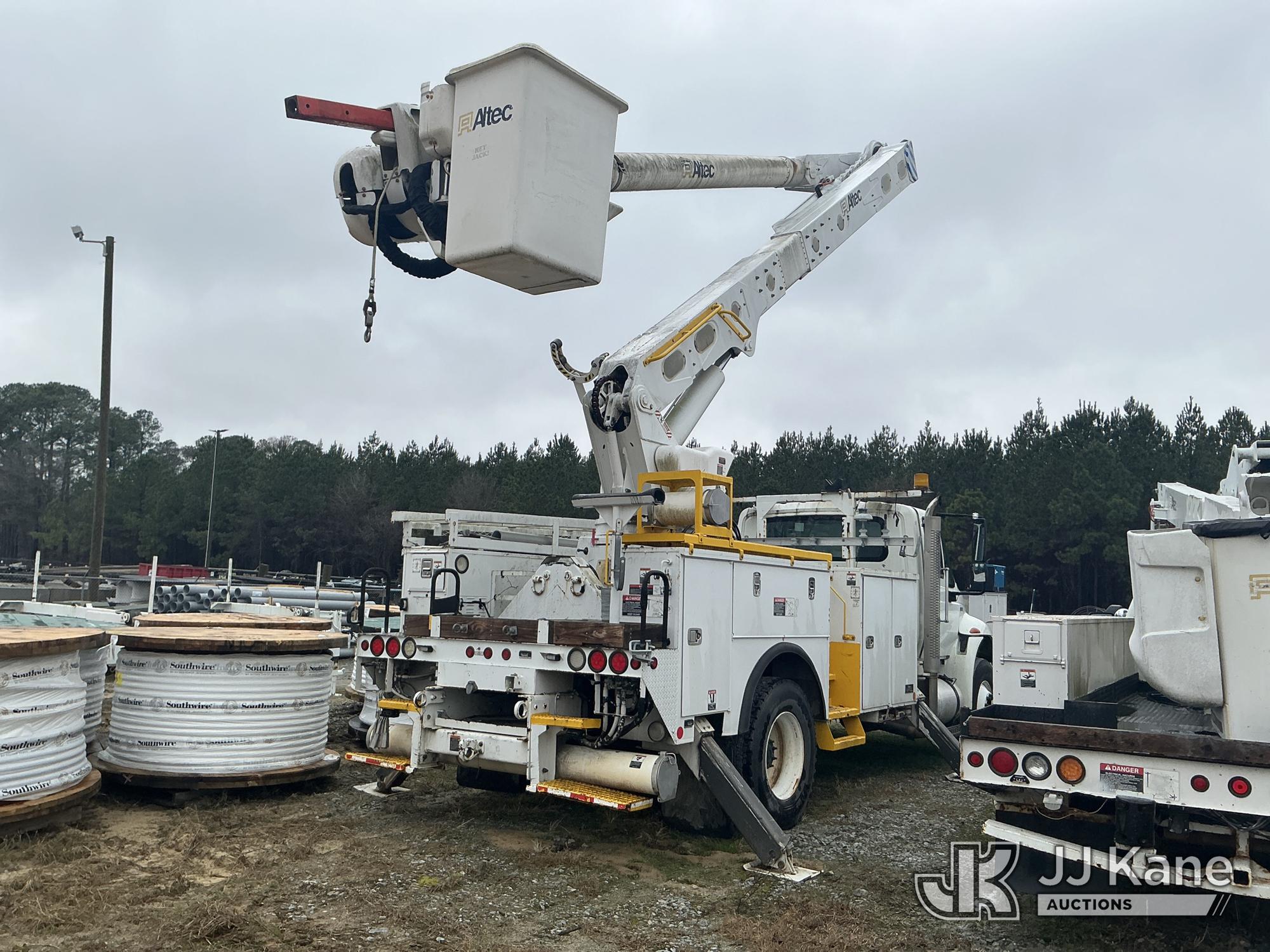 Altec AM55-MH, 60 ft, Over-Center Material Handling Bucket Truck s/n 0813DM4692, with single man bucket & 4 hydraulic outriggers, rear mounted on 2014 International 4300 Utility Truck, 7.6L L6 diesel, Auto, A/C, with front winch, (82,824 miles) (Runs, Moves, Upper Operates) (Missing Upper Plate) This is a Titled Item*
