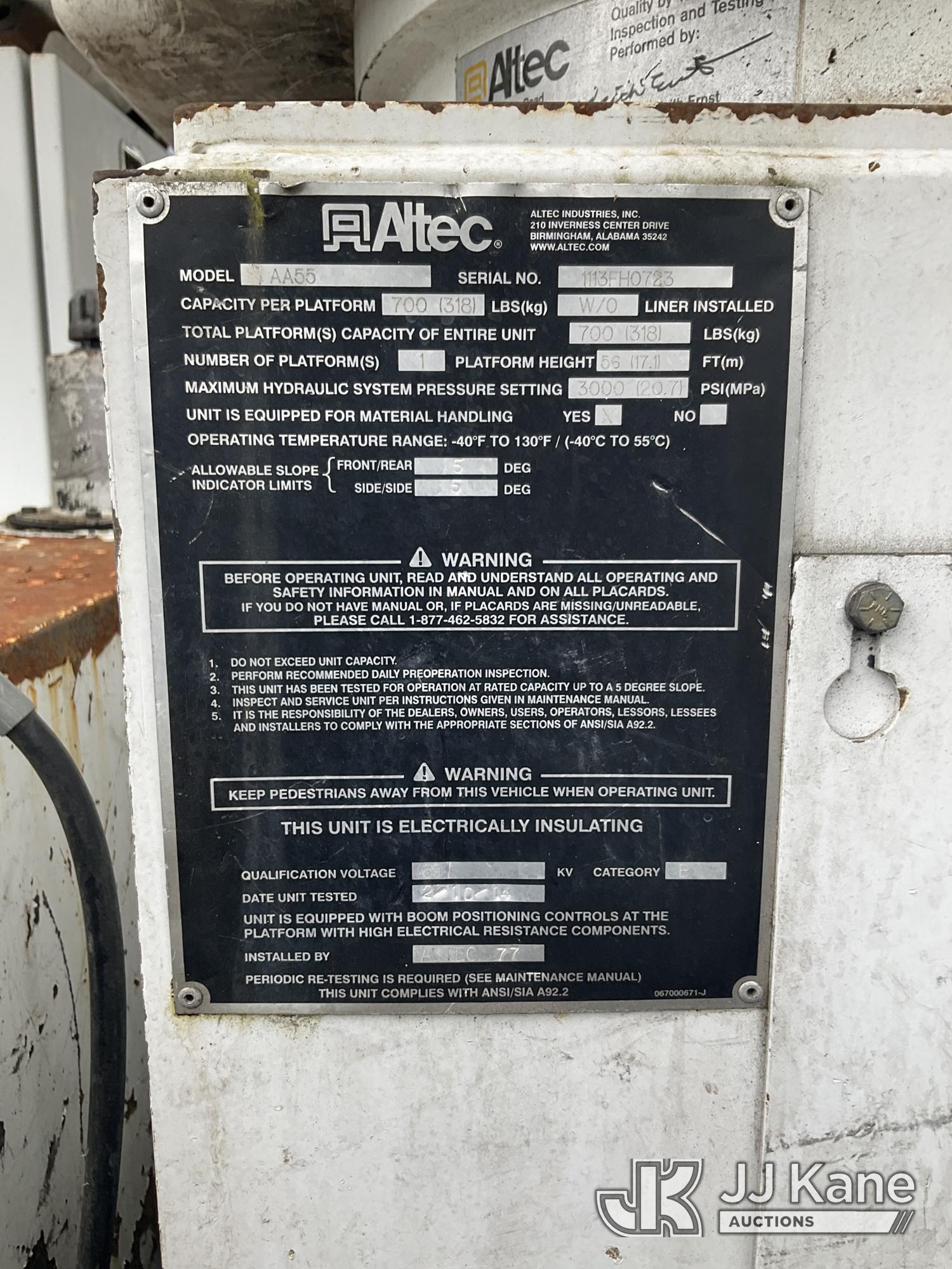 Altec AA55, 56 ft, Material Handling Bucket Truck s/n 1113FH0723, with two man bucket, rear mounted on 2014 Freightliner M2 112 Utility Truck, s/n 1FVAC4DX3EHFU6754, 8.9L LNG, 4X2, Auto, A/C, (88,971 miles) (Not Running, Condition Unknown) ( The manufacturer has notified JJ Kane that this equipment is subject to an open recall. CSN 612 Trailer Relay Module Circuit Breaker Change The equipment should not be operated until this is addressed. Buyer is responsible for reviewing the recall notice and contacting the manufacturer to schedule the recommended corrective actions. Associated costs may be covered by the manufacturer in some cases.) This is a Titled Item*