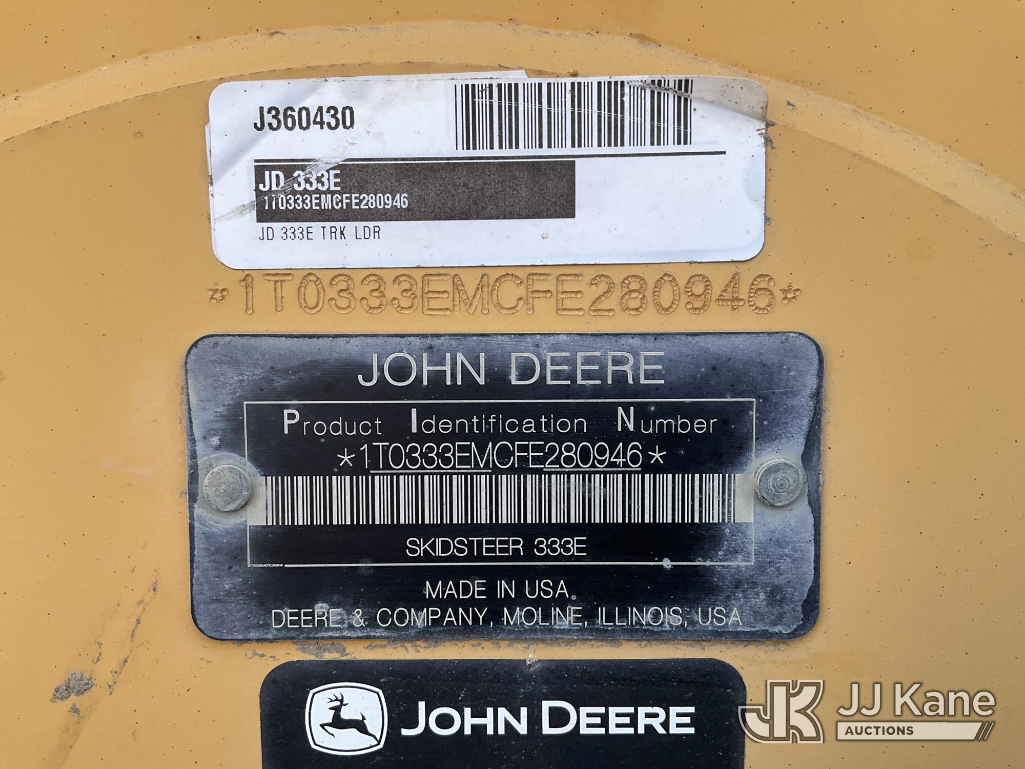 2015 John Deere 333E Tracked Skid Steer Loader, s/n 1T0333EMCFE280946, J.D. diesel, Hydrostatic, with 2 speed, aux hyd, rubber tracks, EROPS w/ AC, (Runs, Moves & Operates) (No Bucket) (Reads 5,005 hours)*