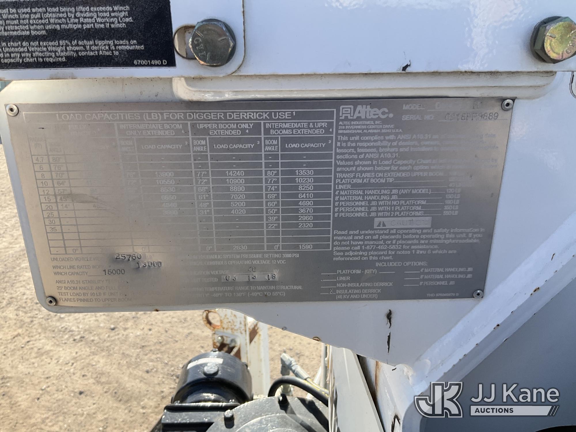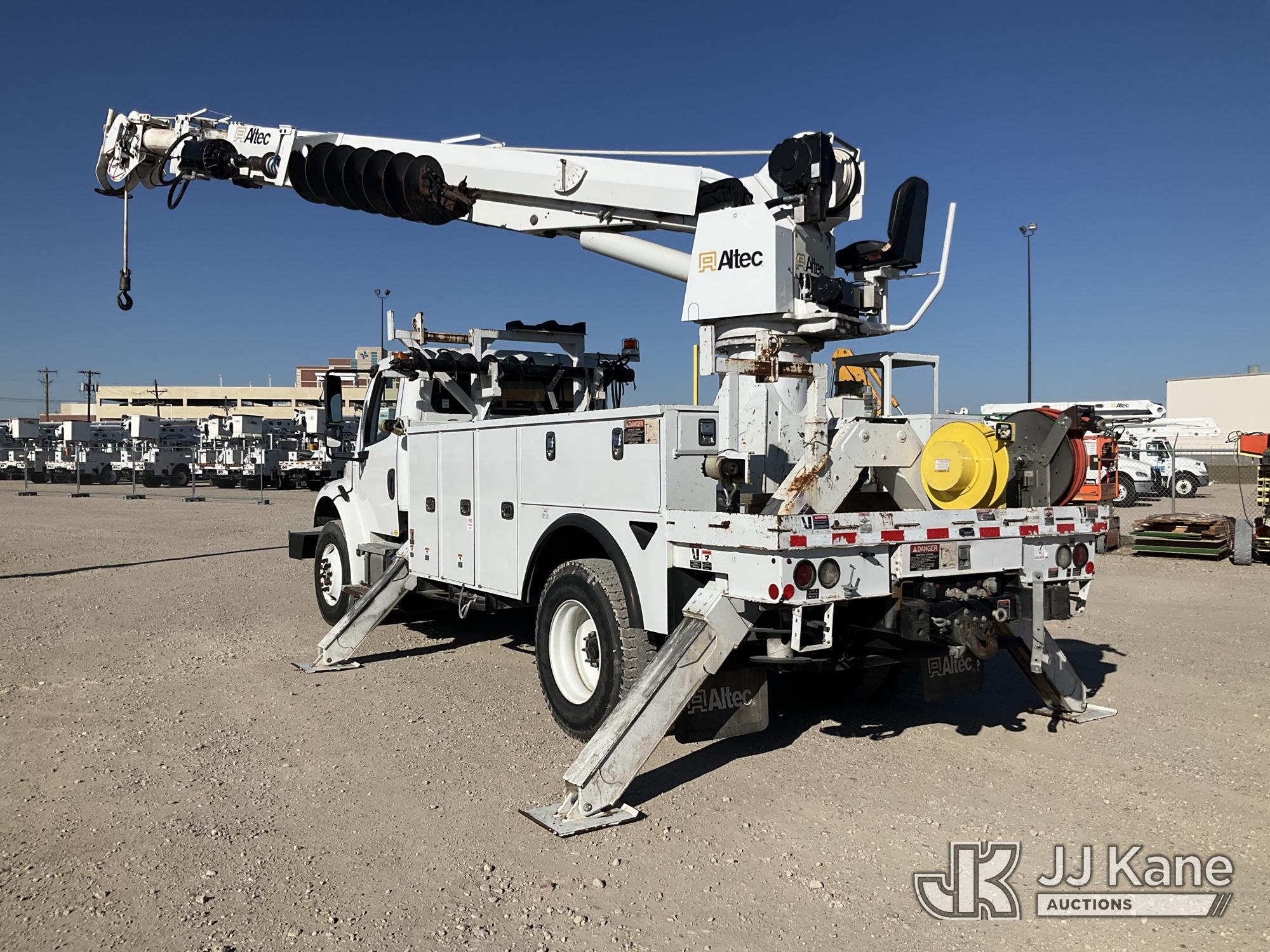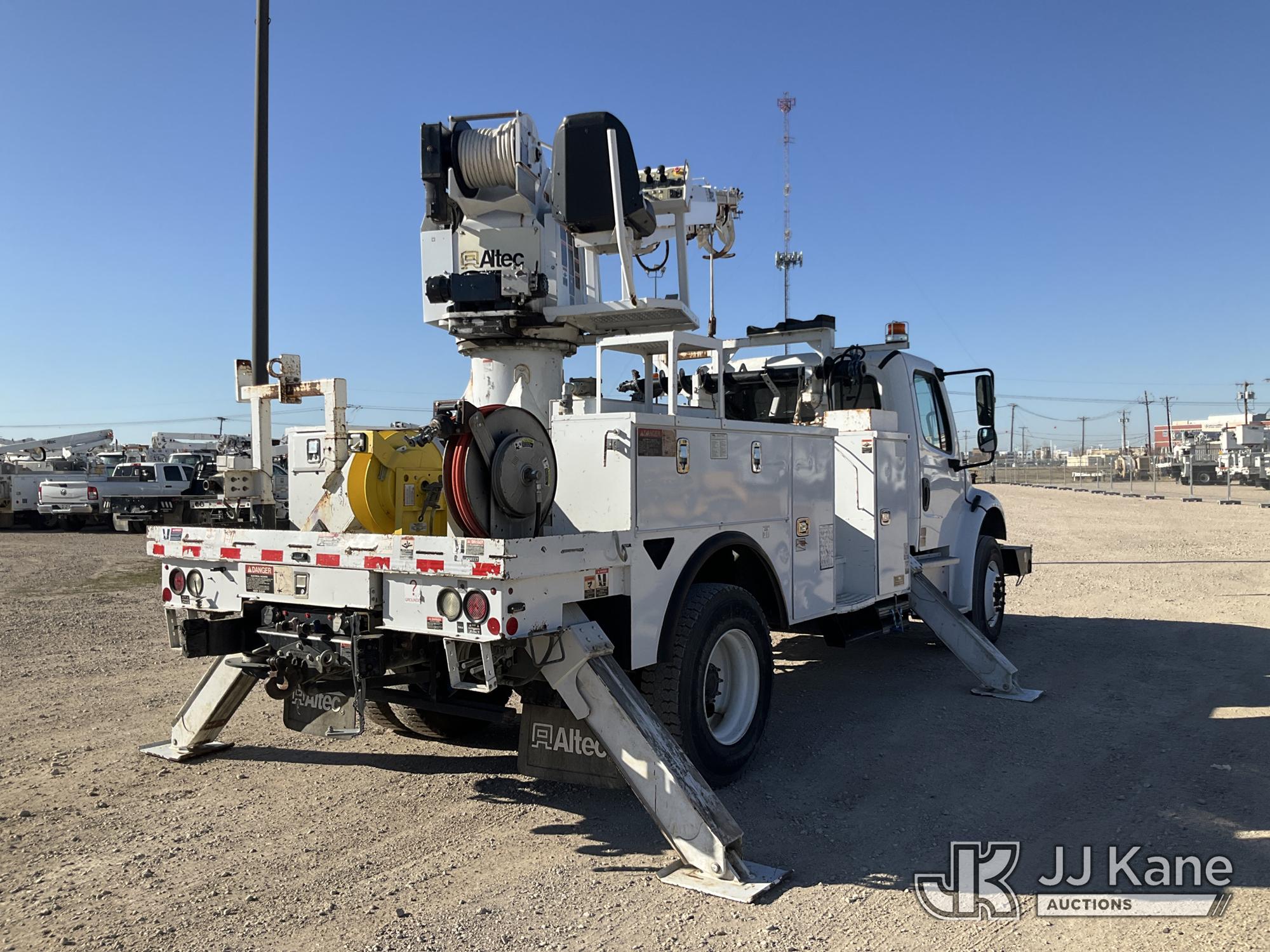 Altec DM47B-TR, 23,790 Lb Derrick Digger s/n 0218FR3889, with 47 ft sheave height, 2 spd digger, upper controls, heel winch, pole grabs & riding console, rear mounted on 2019 Freightliner M2 106 Utility Truck, Cummins ISB6.7 Diesel Auto, A/C, with Front Bumper Winch and Capstan Winch, (114,209 miles) (Runs, Moves & Operates) (Jump To Start, Driver Door Does Not Open From Outside ) (Reads 8,724 hours) This is a Titled Item*