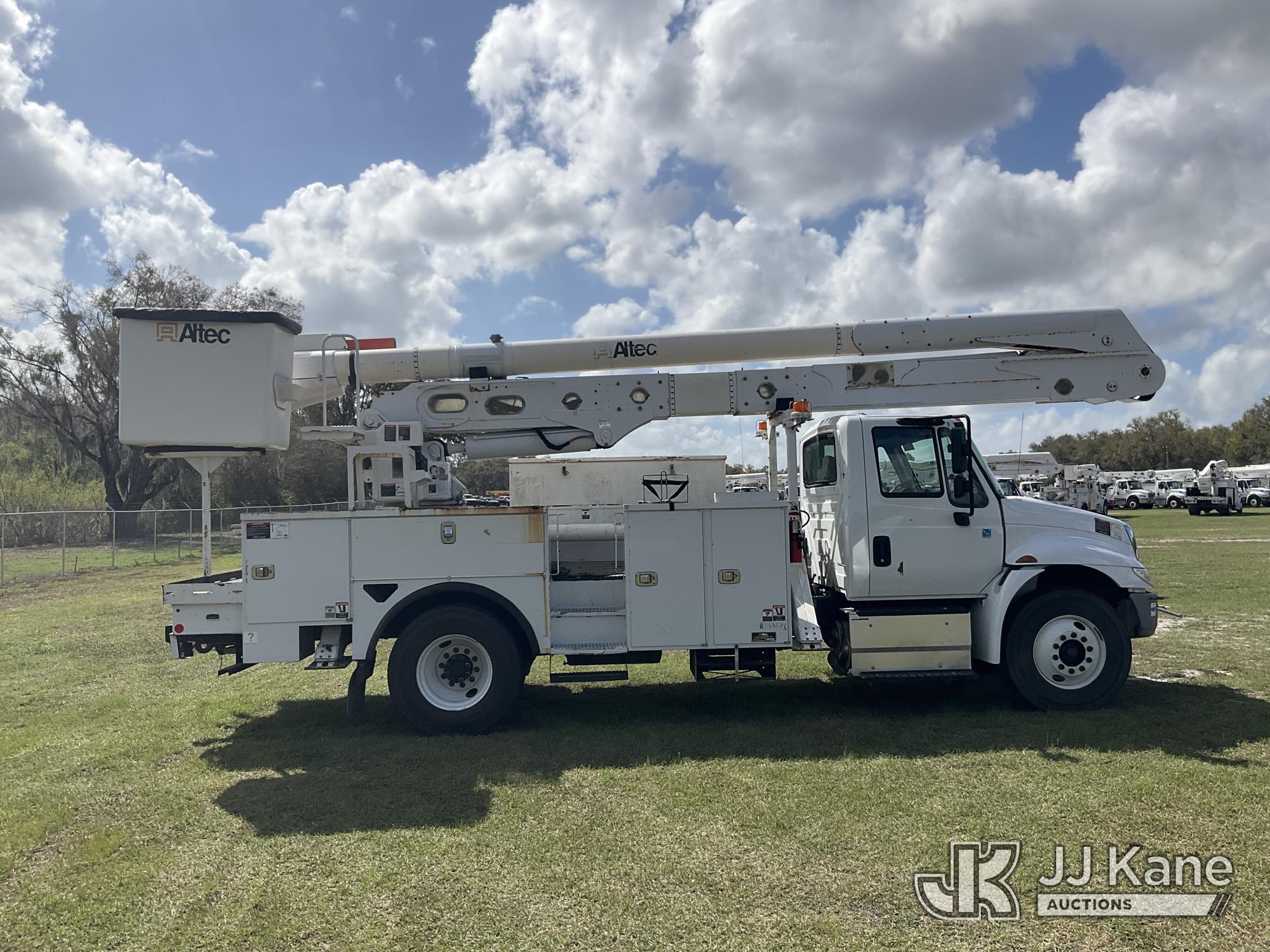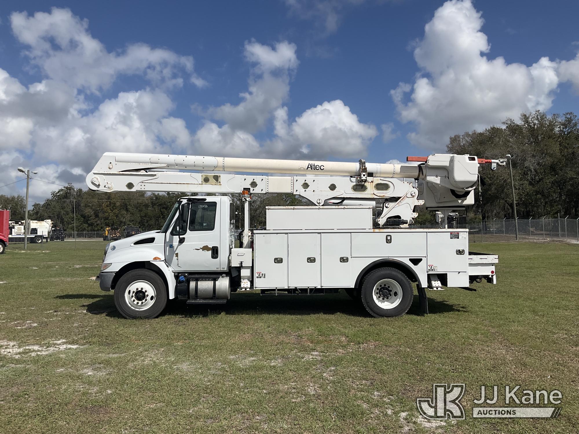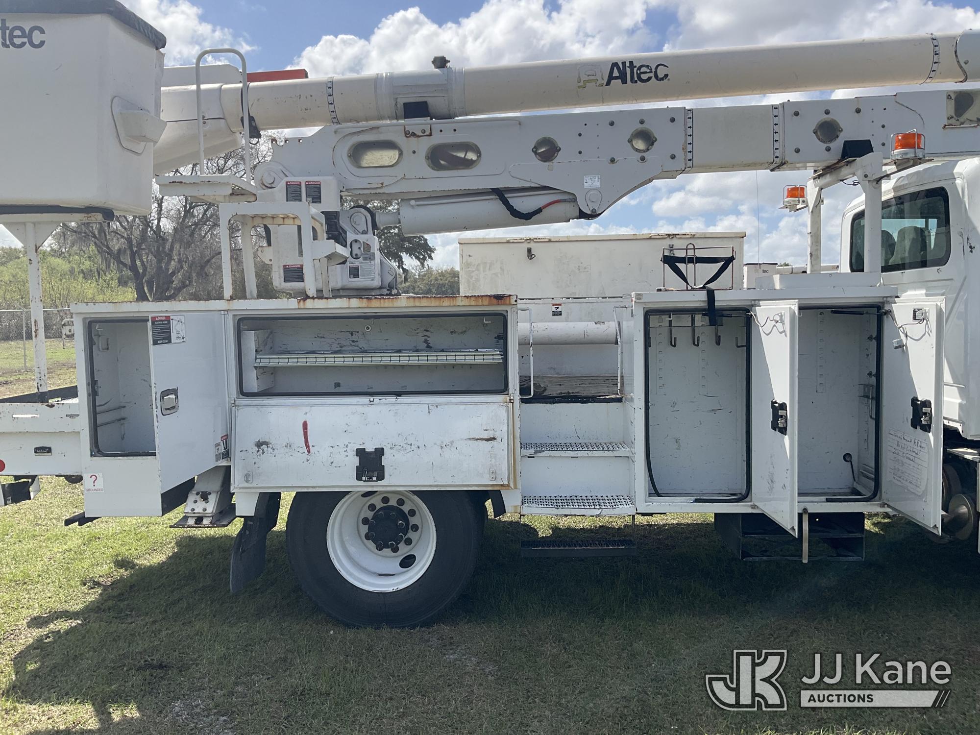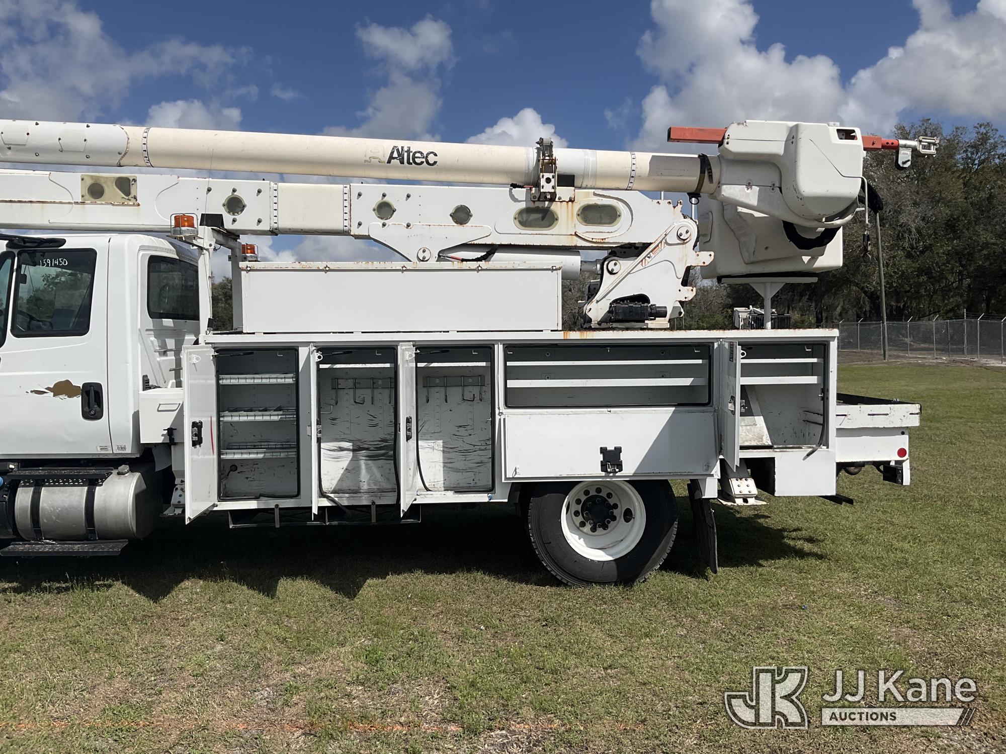 Altec AA55, 60 ft, Material Handling Bucket Truck s/n 1016FH3677, with two-man bucket & 4 hyd outriggers, rear mounted on 2017 International 4300 Utility Truck, 6.7L Diesel, 4X2, Auto, A/C, (91,148 miles) (Runs, Moves, Upper Operates) (Check Engine Light On, Radio Not Included, Missing Upper Plate) (FL Residents Purchasing Titled Items – tax, title & registration fees will be collected at the maximum rate of $400.00 under 25,999 and $800.00 for Over 26,000 and $250.00 trailers – Proof of insurance is mandatory; Out of State Residents Purchasing Title Items – tax will be collected based upon your state rate.) (Reads 11,863 hours) This is a Titled Item*